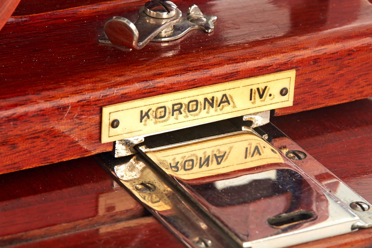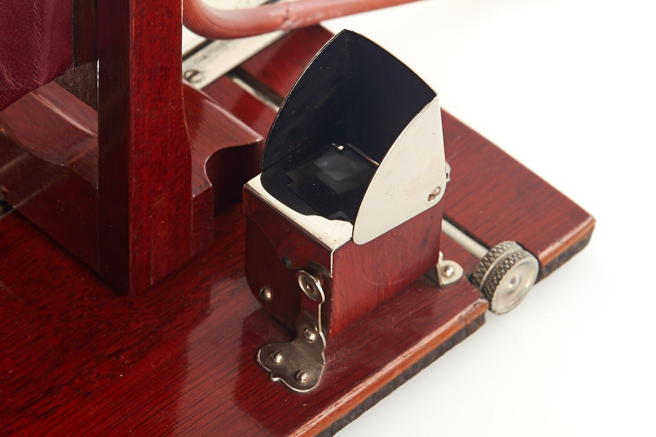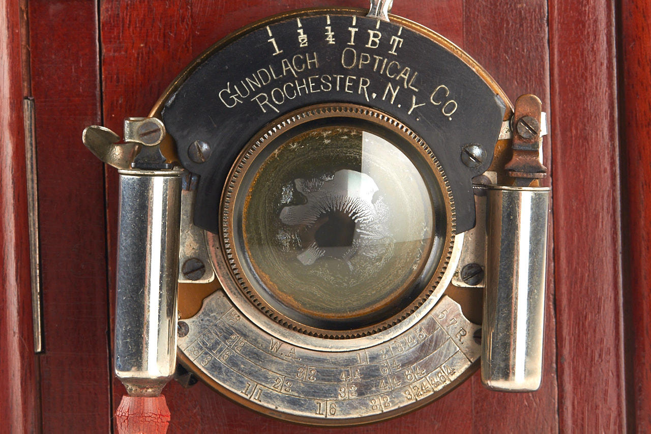advanced 5x7" folding bed camera, brown leather covering with beautiful mahogany interior, red bellows, unmarked lens in Gundlach shutter