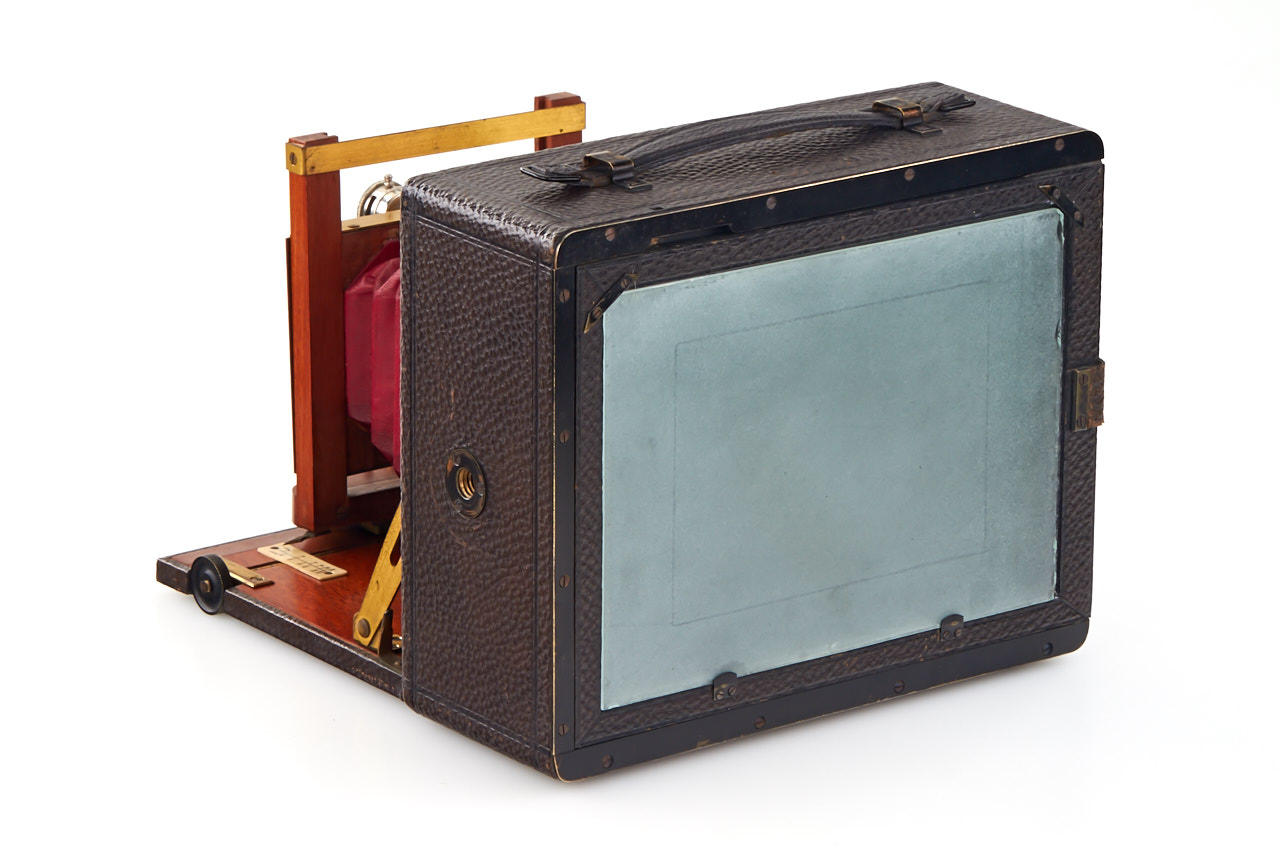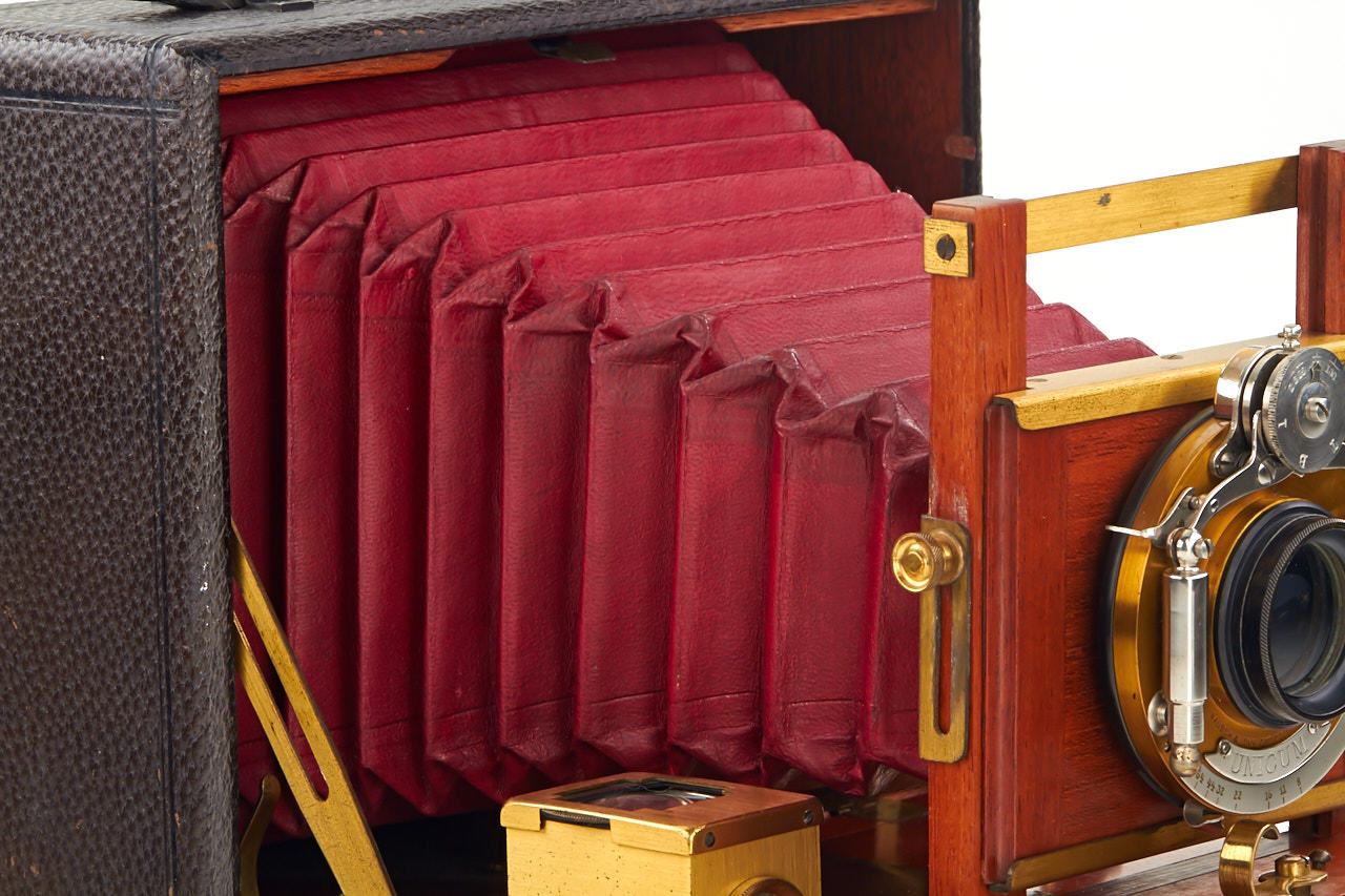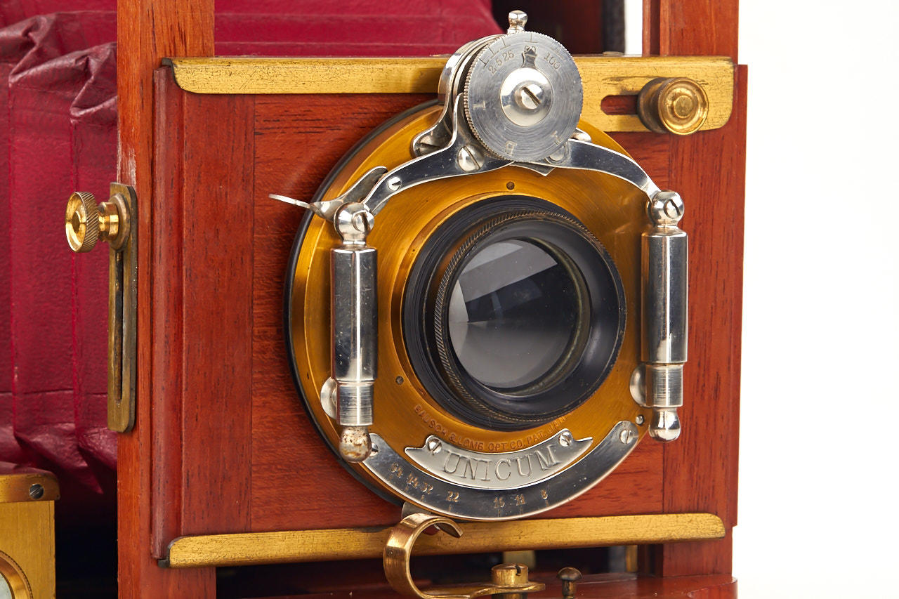 5x7" wooden folding-bed camera in excellent condition, beautiful mahogany interior, original red bellows, brass fittings, unmarked lens in Unicum shutter, with original ground glass