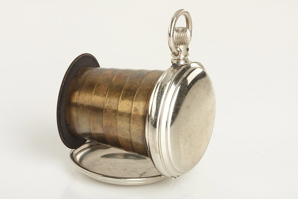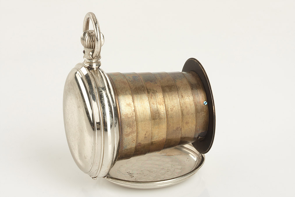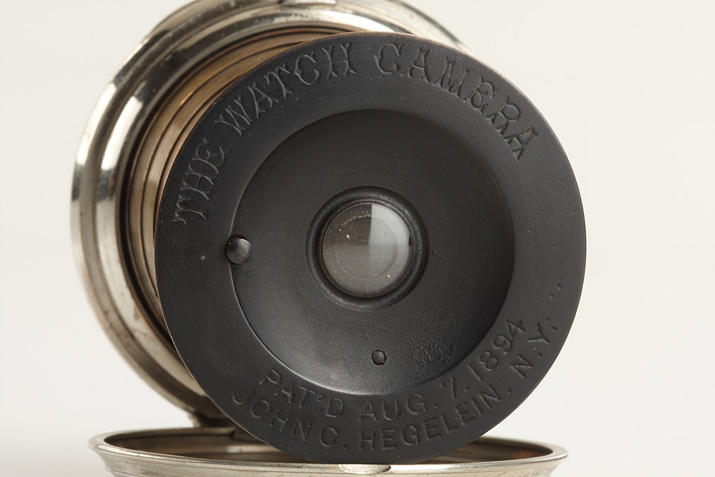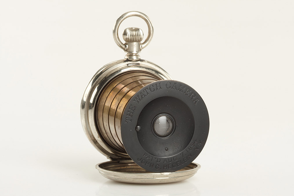 American collapsible camera in the form of a pocket watch. The front and rear of the "watch" open. The front of the camera extends forward with a 7-section metal tube. A wooden film holder attaches to the back. There are only three known examples of this camera known to exist. Our consultants have closely examined all three, and this camera, no.1011, is for sure the best known example. The camera itself is in nearly perfect condition. It also includes two double film-holders, two boxes of original films, an original cloth pouch and the original box. Each of the film holders also has a wooden cap to cover the opening not being used - ex collection Jim McKeown