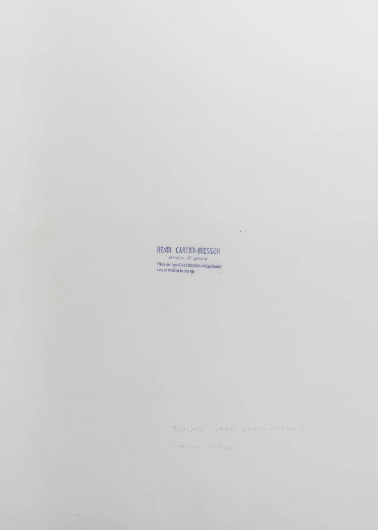Gelatin silver print, printed in the late 1950s, early oversized exhibition print 55,2 x 39,2 cm Photographer's reproduction stamp on the reverse LITERATURE Lincoln Kirstein/Beaumont Newhall (eds.), The Photographs of Henri Cartier-Bresson, The Museum of Modern Art, New York 1947, p. 24; Henri Cartier-Bresson, Images à la Sauvette, Paris 1952, pl. 26; Yves Bonnefoy (ed.), Henri Cartier-Bresson, Photographe, Paris 1979, pl. 14; Peter Galassi (ed.), Henri Cartier-Bresson: The Early Work, The Museum of Modern Art, New York 1987, p. 101; Vera Feyder/André Pieyre de Mandiargues/Henri Cartier-Bresson (eds.), Paris à vue d’oeil, Paris 1994, pl. 33; Jean-Pierre Montier (ed.), L’art sans art d’Henri Cartier-Bresson, Paris 1995, p. 96; Henri Cartier-Bresson, De qui s’agit-il? Paris 2003, p. 59.