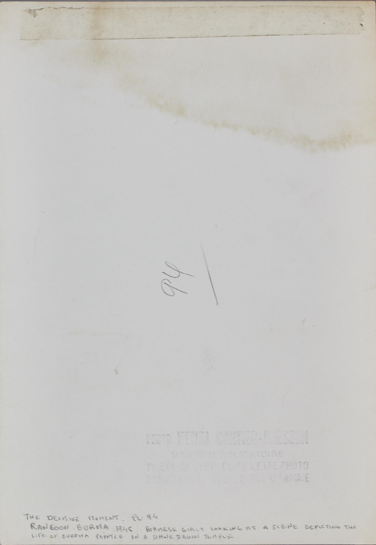 Vintage silver print 25,2 x 17,5 cm Photographer's “MENTION OBLIGATOIRE” stamp on the reverse, annotated “The Decisive Moment, pl. 94. Rangoon Burma 1948, Burmese girls looking at a scene depicting the life of Buddha painted on a Shwedagon Temple” in an unidentified hand in pencil on the reverse LITERATURE Henri Cartier-Bresson, The Decisive Moment, Paris 1952, pl. 94.