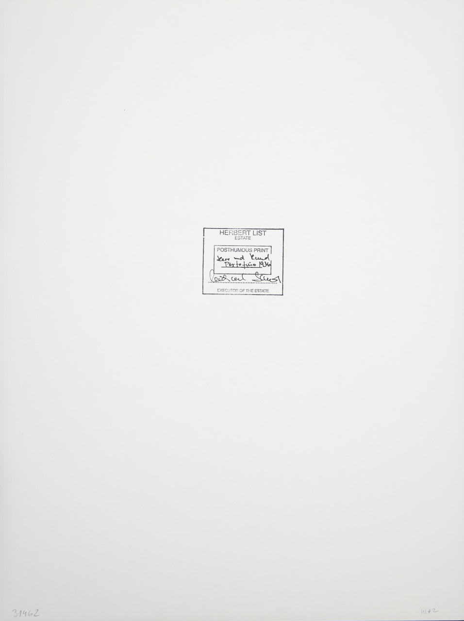 Gelatin silver print, printed in the 1990s 31 x 25,4 cm Photographer's estate stamp with handwritten title and date on the reverse, signed by Max Scheler in ink on the reverse LITERATURE Max Scheler / Matthias Harder (ed.), Herbert List. Das Gesamtwerk, Munich 2000, cover. LITERATURE Max Scheler / Matthias Harder (ed.), Herbert List. Die Monographie, Munich 2000, cover and p. 166.