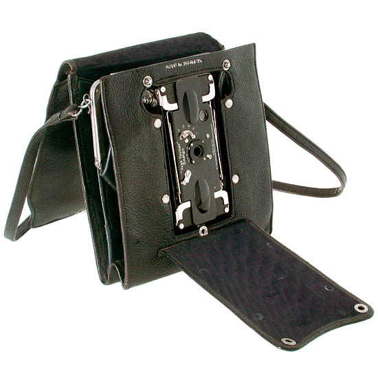 Black leather shoulder bag imprinted PATENT no.250468/25, lined in blue material, double purse compartment, shoulder strap, cosmetic mirror on stud fastened catch revealing a 127-rollfilm Vest Pocket Ensign, very good condition, shutter working. One of five known examples made in two distinct versions, handbag design and shoulder bag design. Included in the collection of George Eastman House is one of the handbag designed cameras which interestingly bears an American patent number whereas this version has a British patent number. It was probably Houghton who approached the handbag manufacturer and Samuel Aspis to design a bag to carry a concealed camera. Patent no. 250468/25 was granted in 1926. None of these cameras were listed in the Ensign catalogue, 19x19cm. Literature: Abring IV p.183.