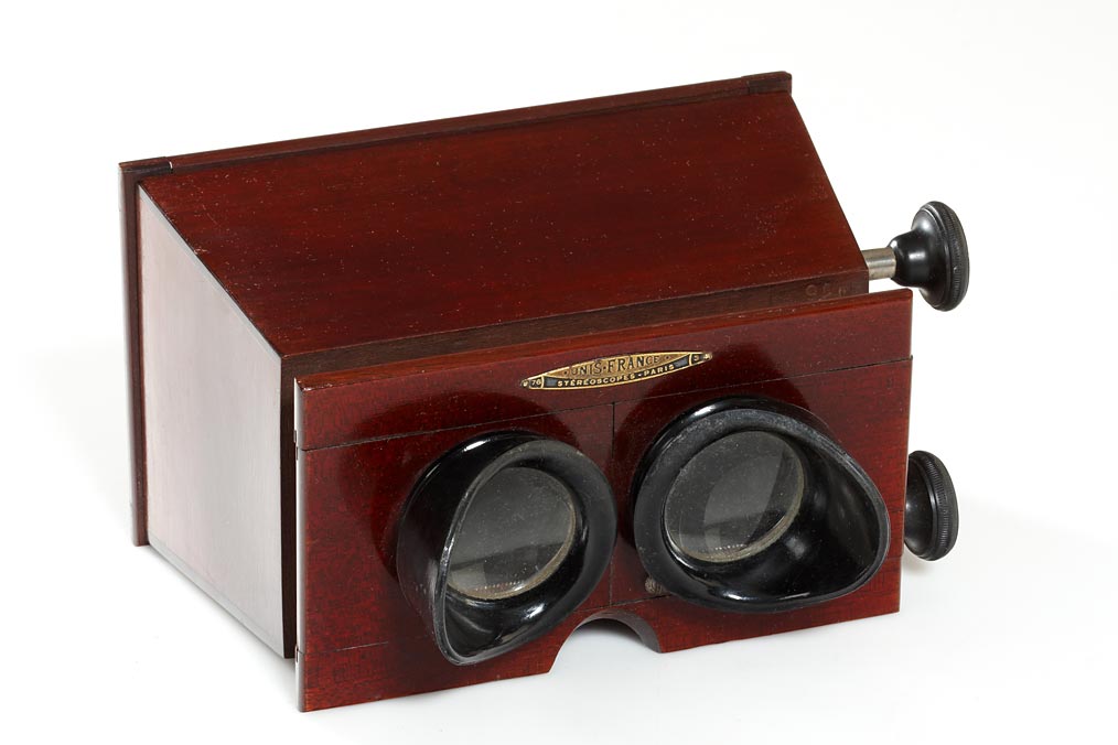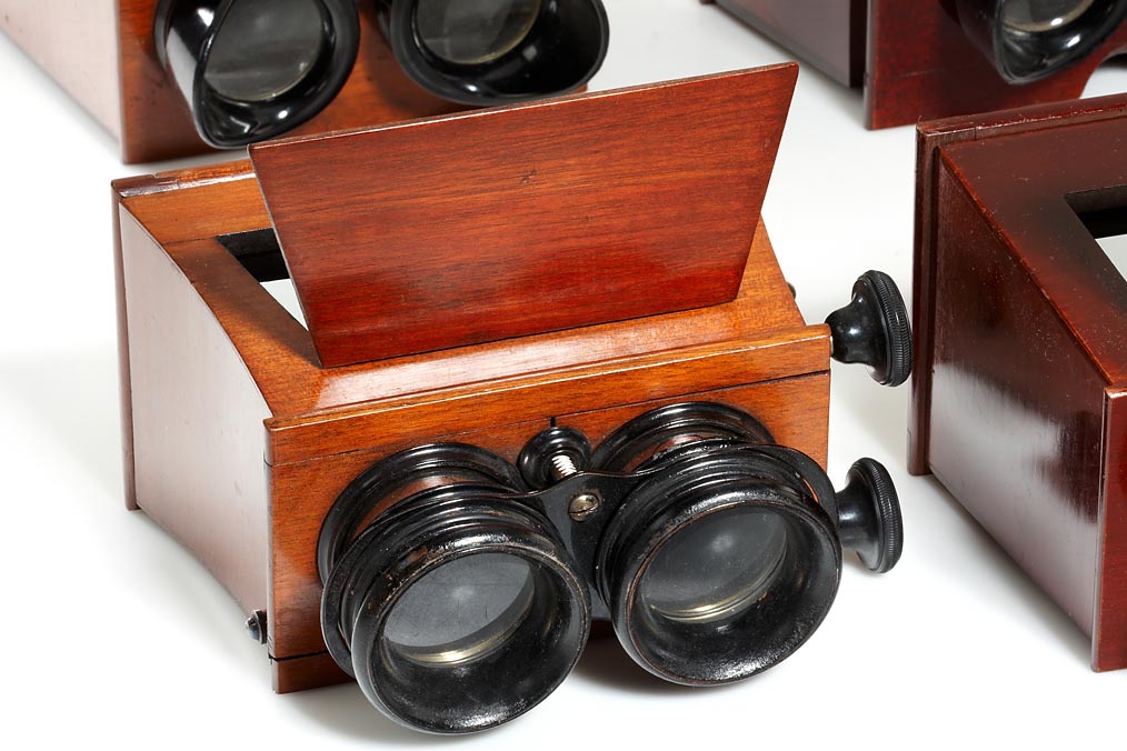 compilation of four wooden handheld stereoscopes by different makers for 45x107 slides, all with adjustable focus and in good and functional condition. (4)
