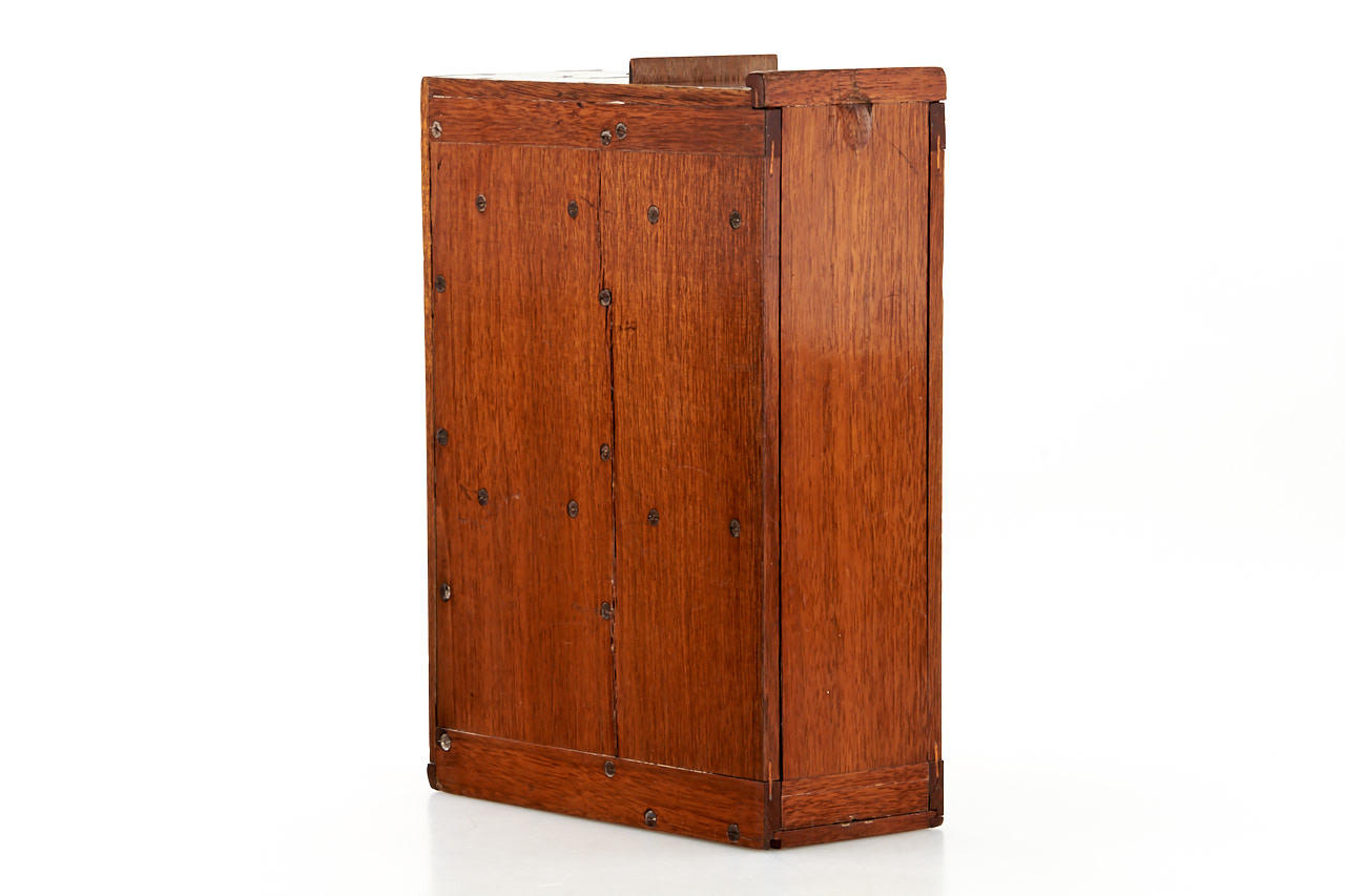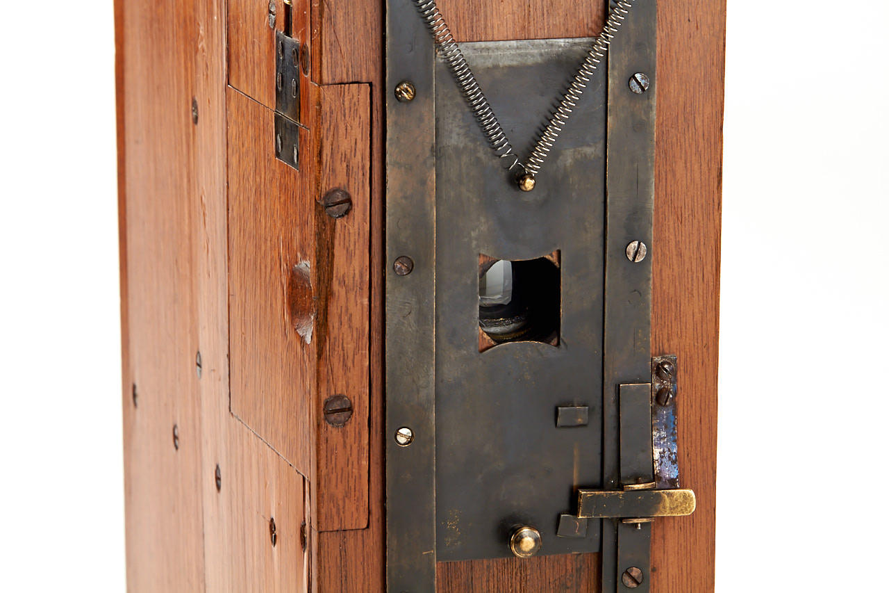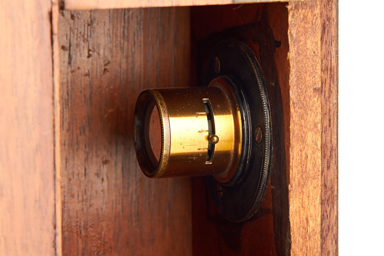 very rare 6x9cm detective camera in walnut housing, internal magazine for 15 plates, unmarked brass lens behind a front-guillotine shutter, built-in compartment for spare plates, the camera has been used concealed as a case