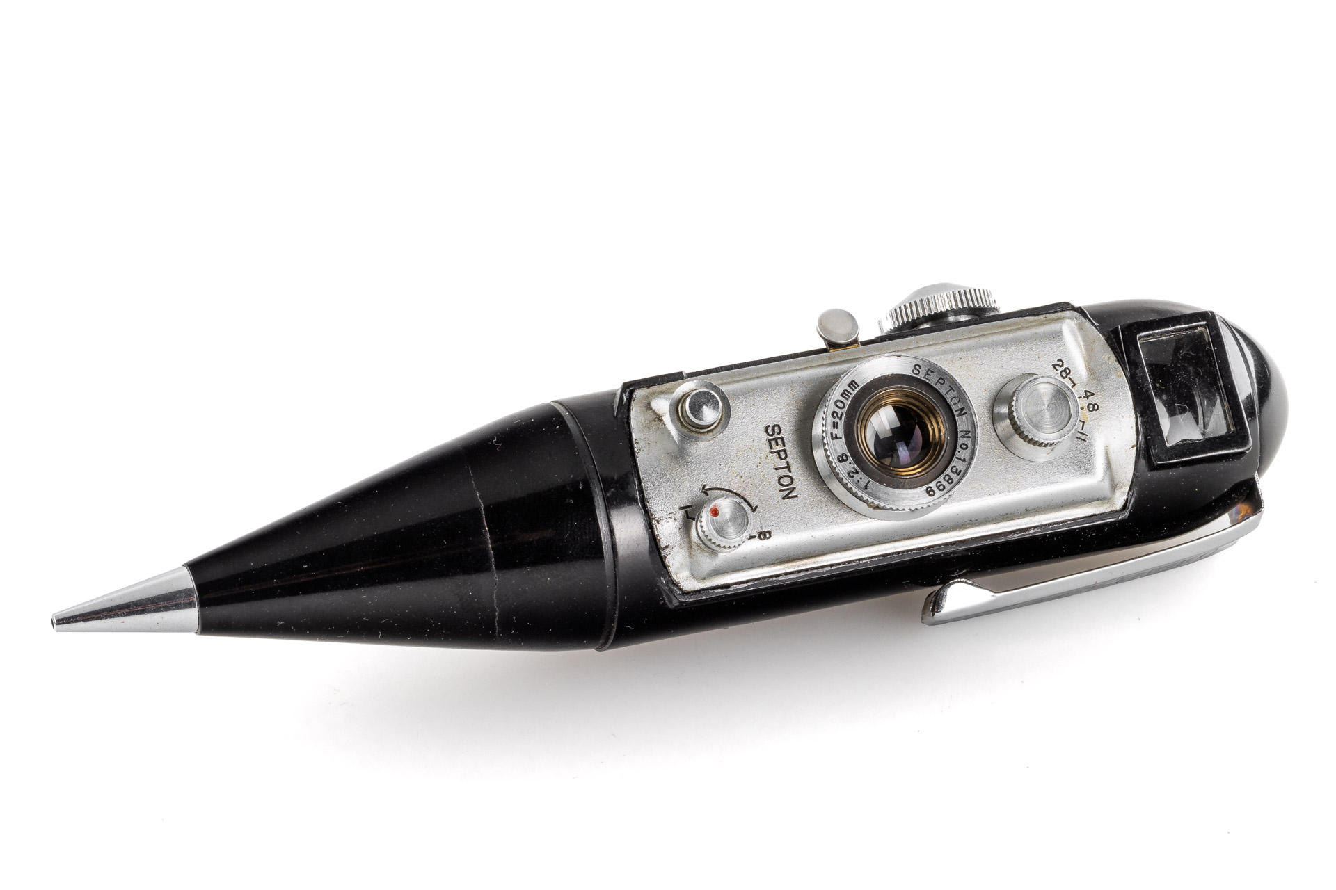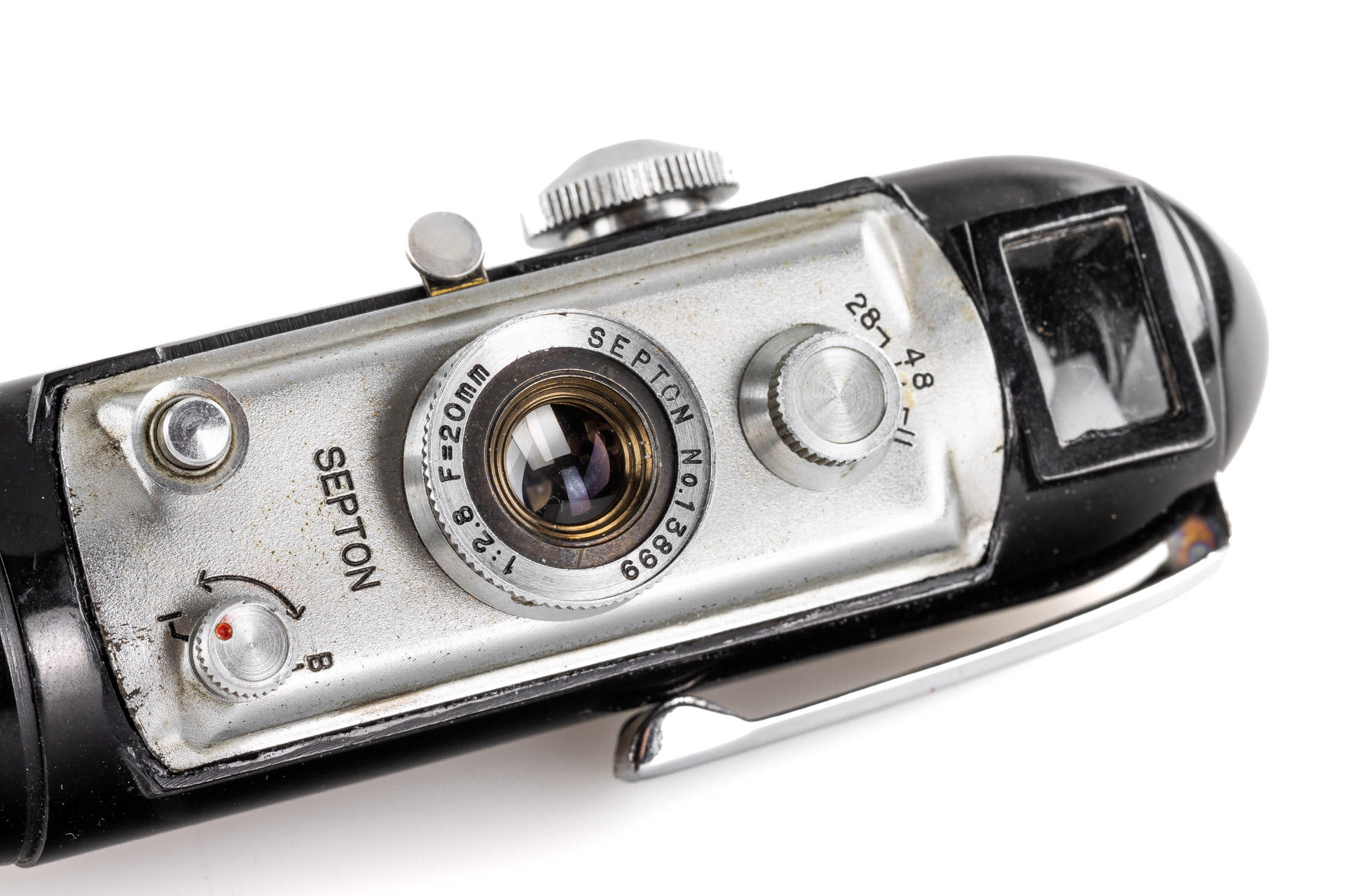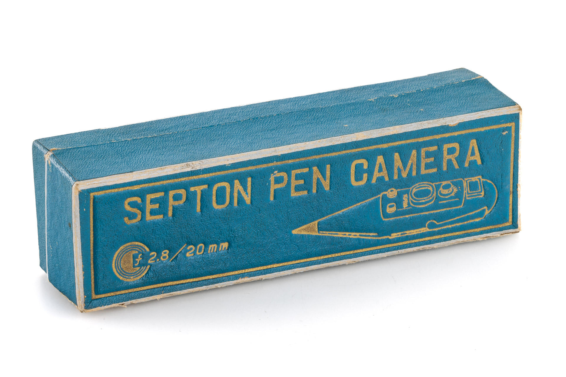 Very rare subminiature camera for 16mm film, shaped like an oversized pen. Bakelite body with a total length of 14.5cm, with variable-aperture Septon 2.8/20mm no.13899 and original lens cap and blue maker's box