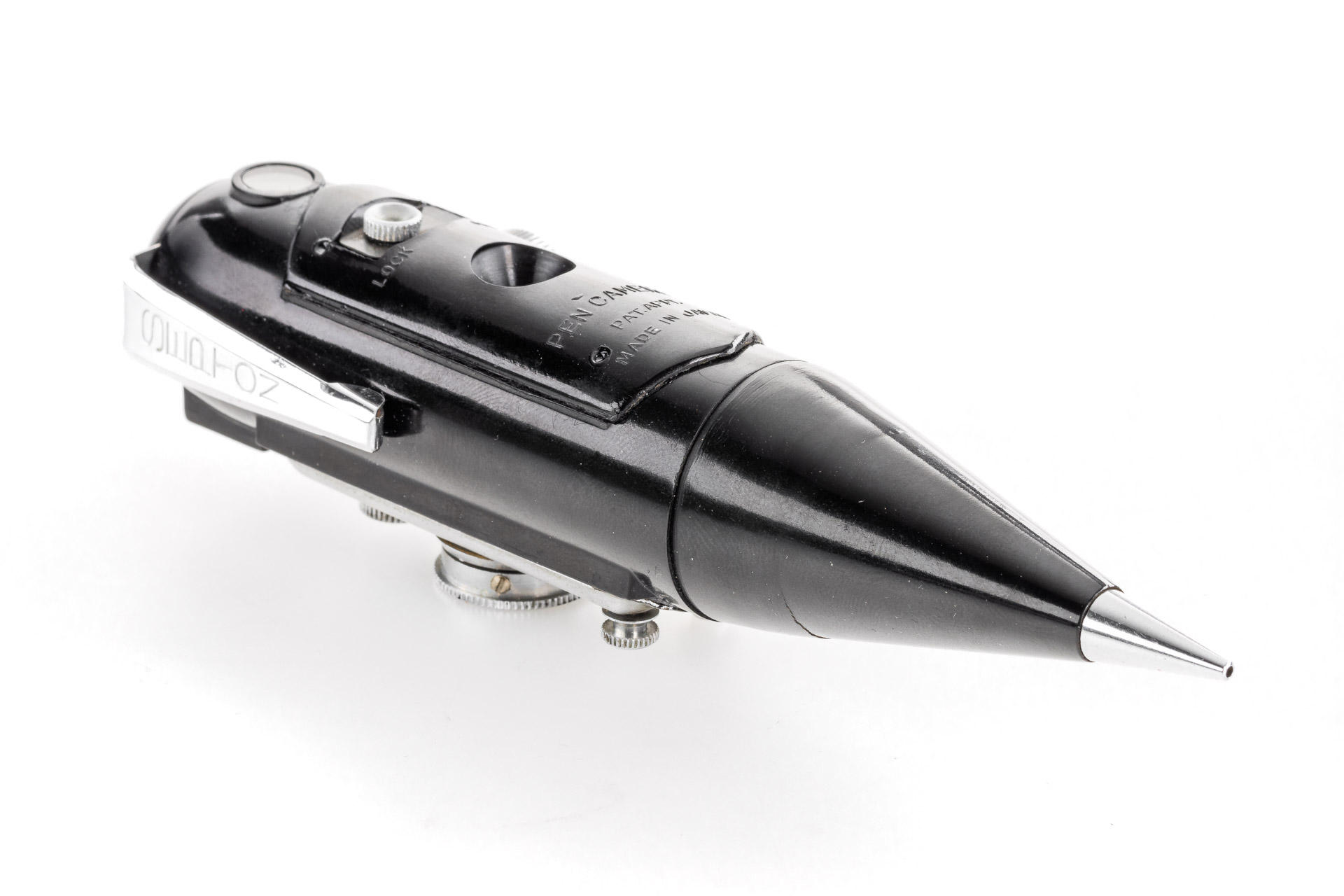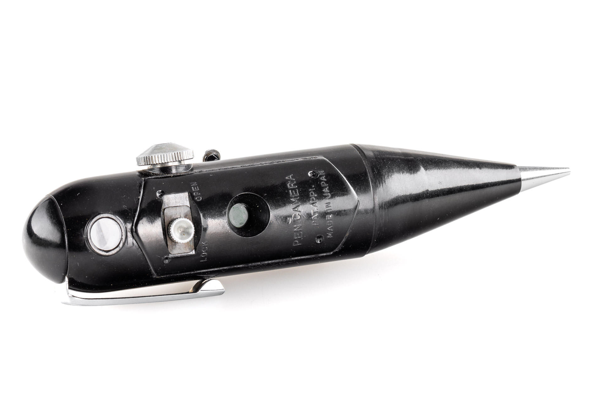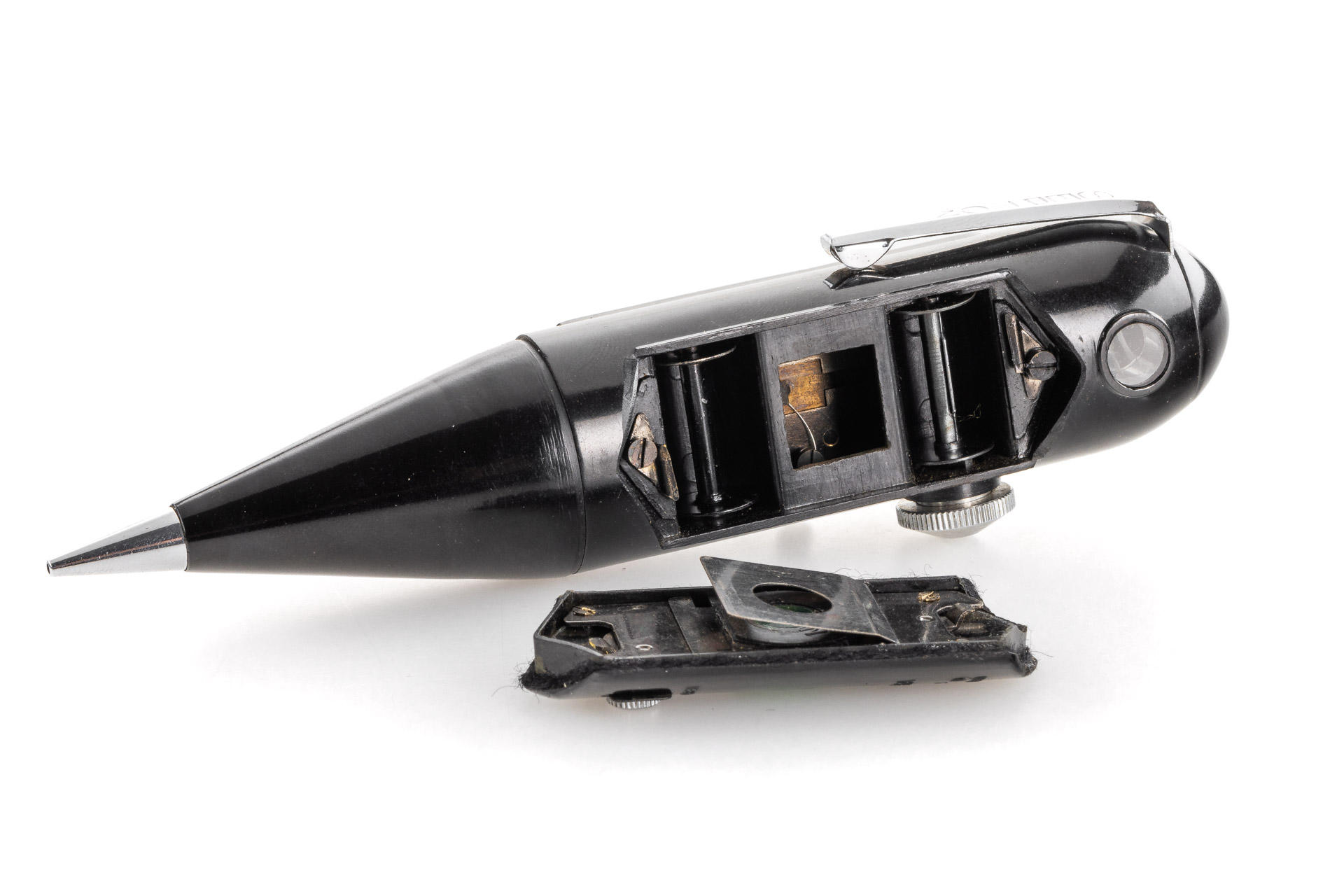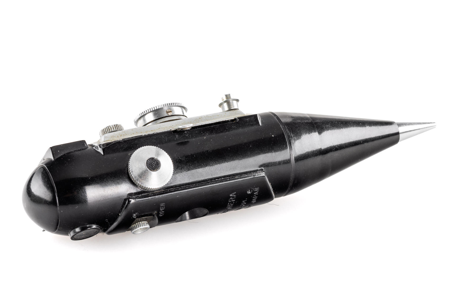 Very rare subminiature camera for 16mm film, shaped like an oversized pen. Bakelite body with a total length of 14.5cm, with variable-aperture Septon 2.8/20mm no.13899 and original lens cap and blue maker's box