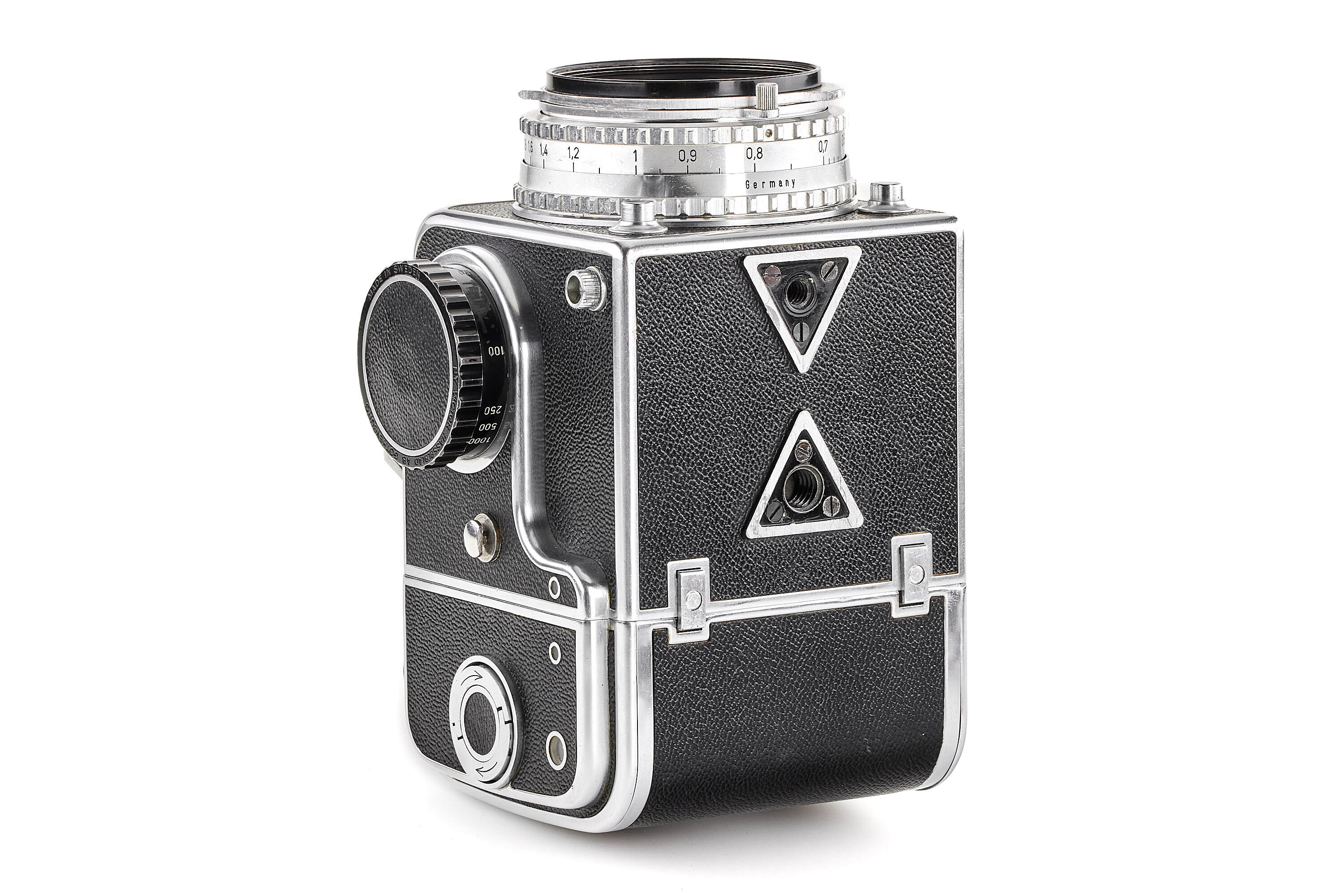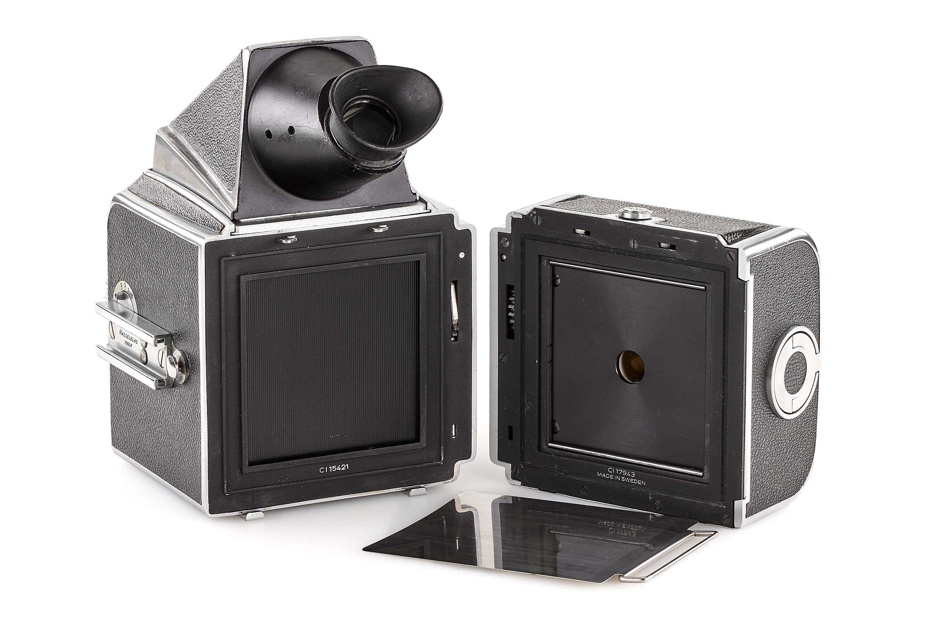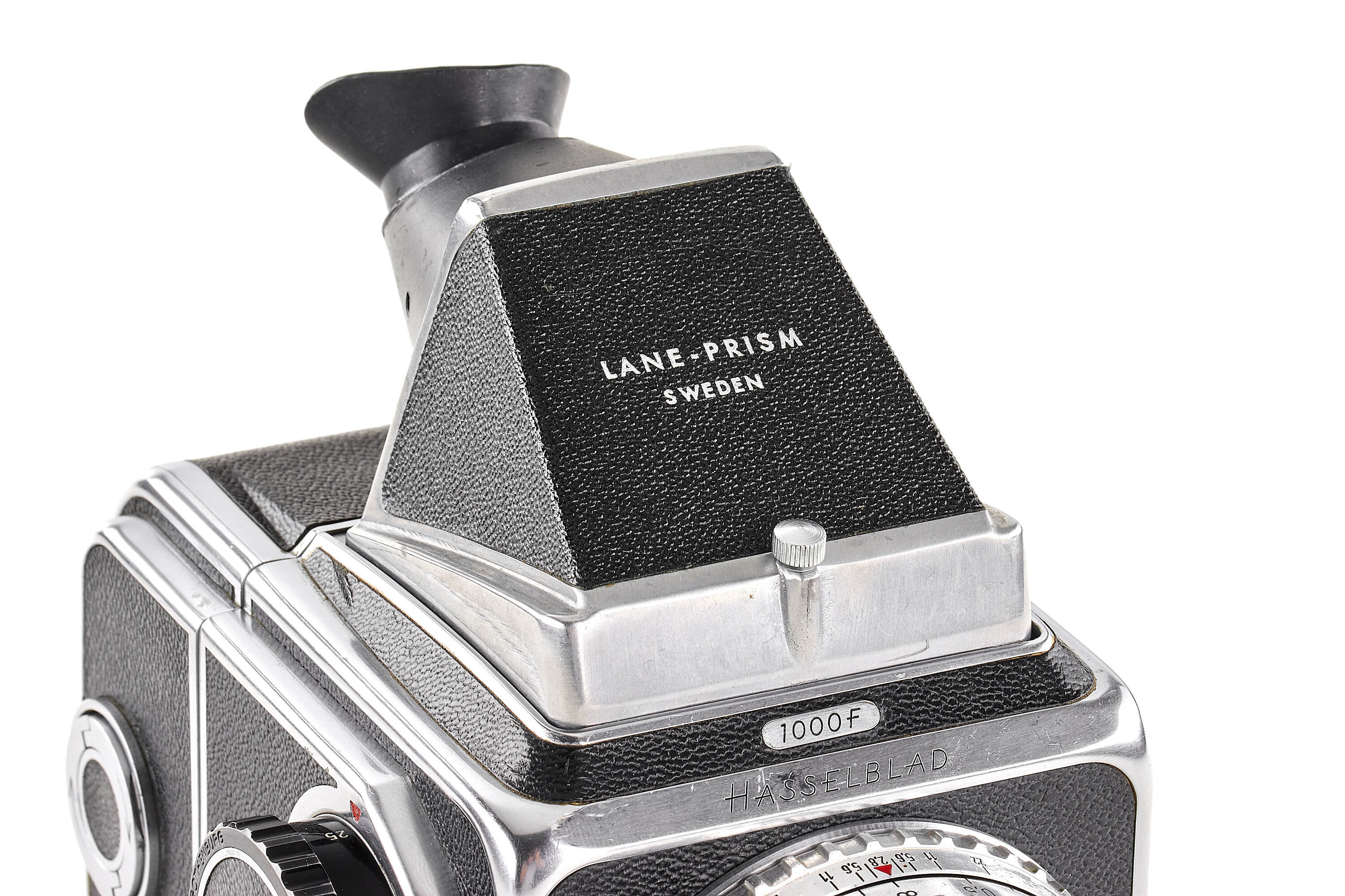 Interesting early body in very good condition, with matching early meter scale Tessar 2.8/80mm no.834615 with clean and clear optics (front lens cap), matching early magazine no.CI17943 (slider) and uncommon 45° Lane-Prism with integrated loupe.