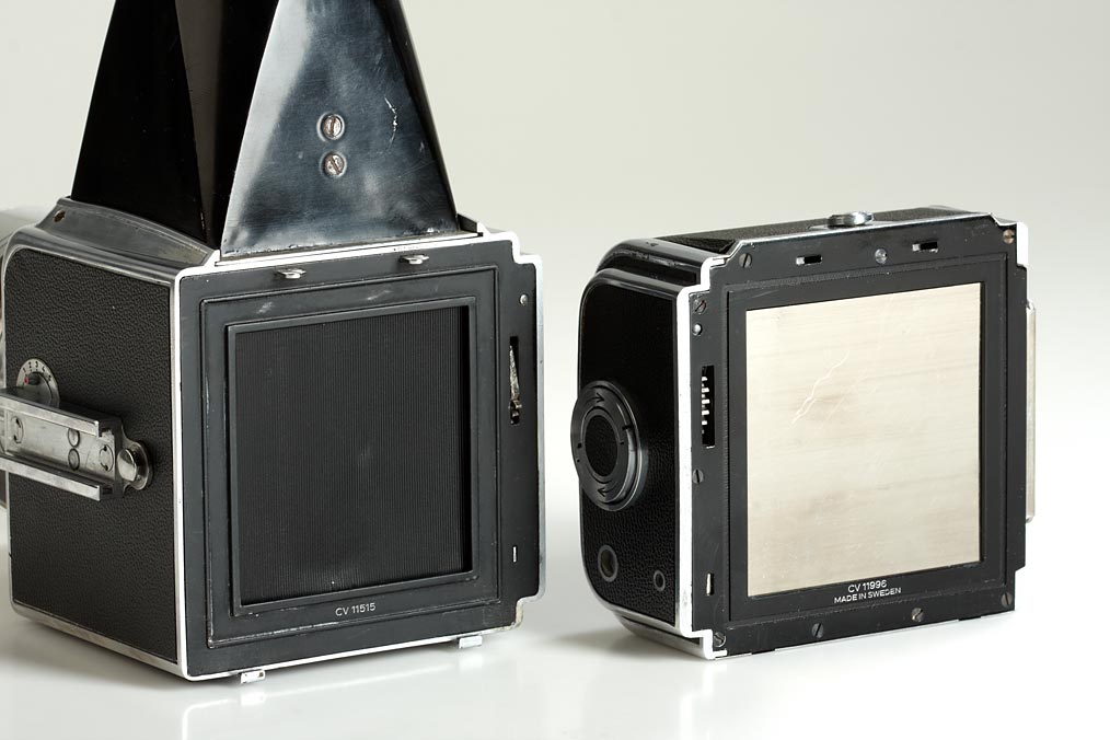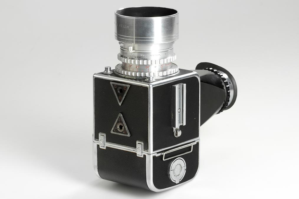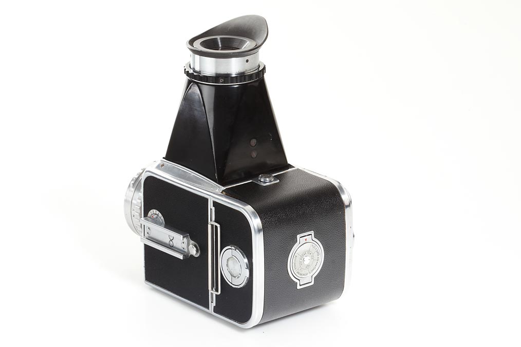 first model in top original condition (shutter works) with matching Kodak Ektar 2.8/80mm no.RY422 (hood), matching magazine no.CV11996, Hasselblad finder hood