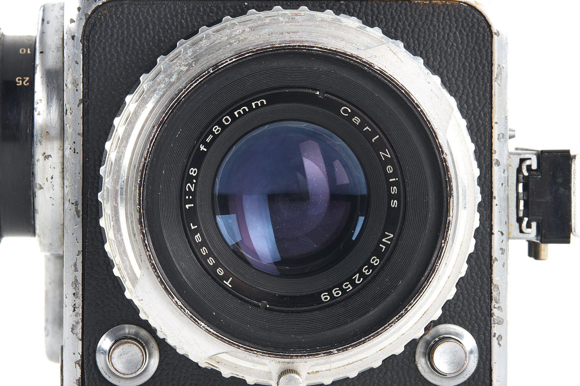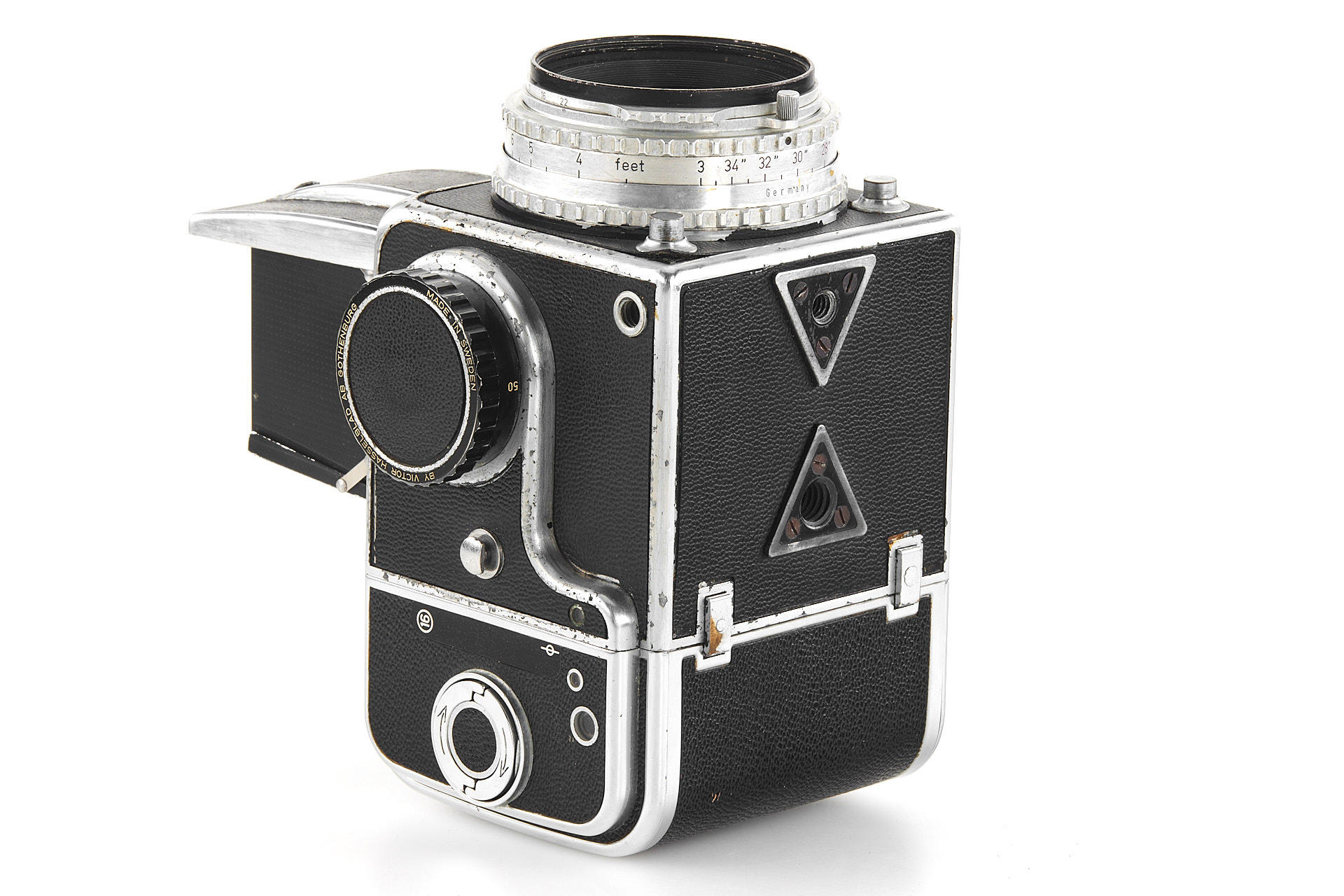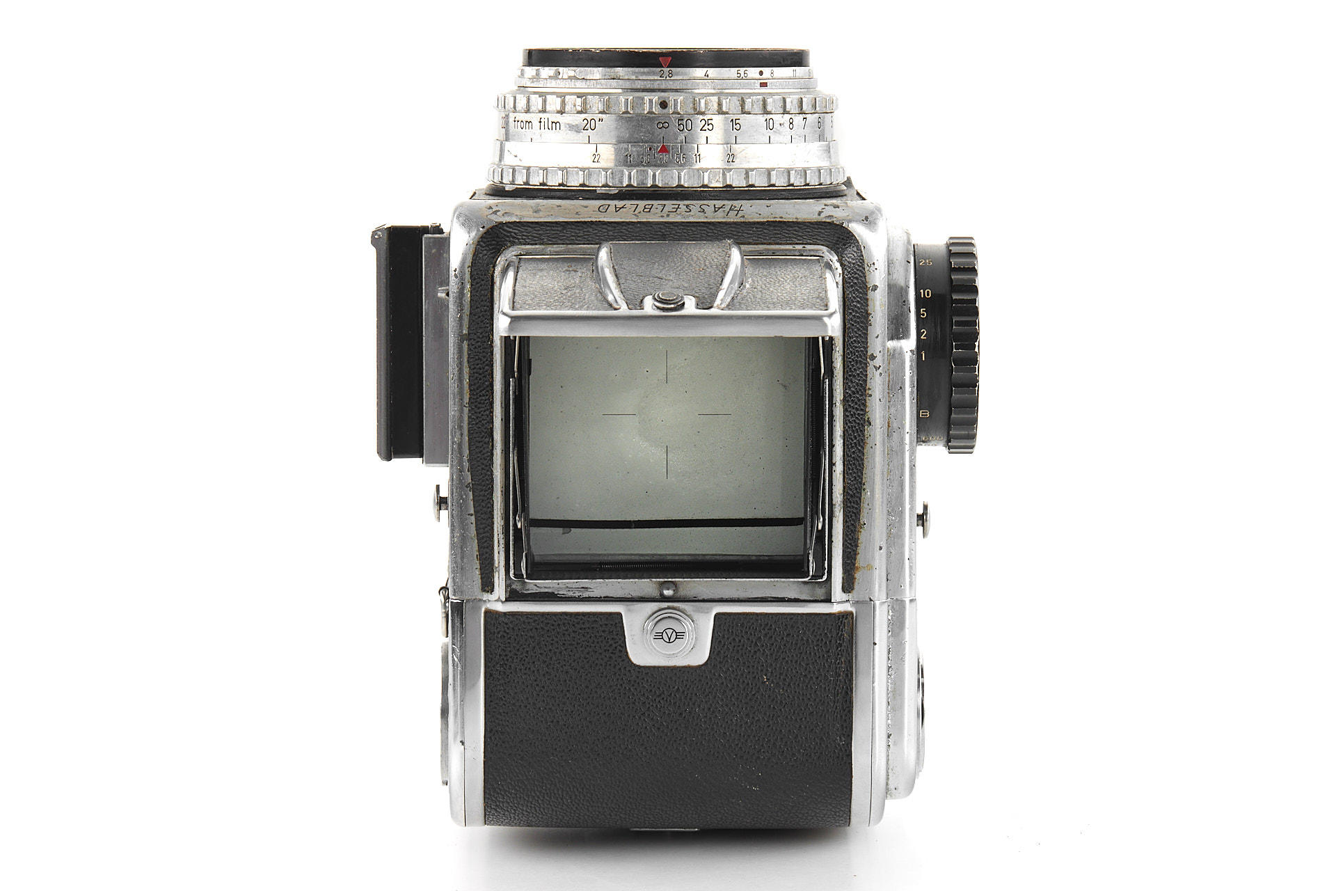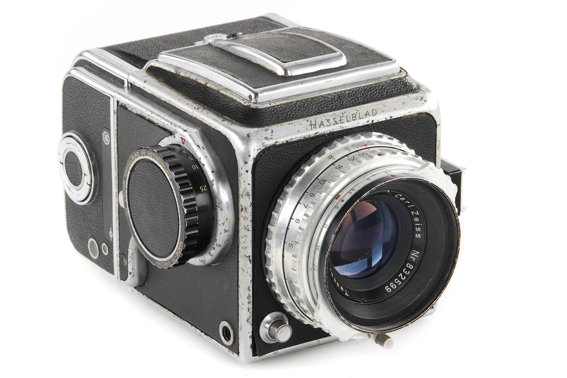 an early Hasselblad body with visible signs of age, the second type with black winding knob, with Tessar 2.8/80mm no.832599, magazine no.CU10682