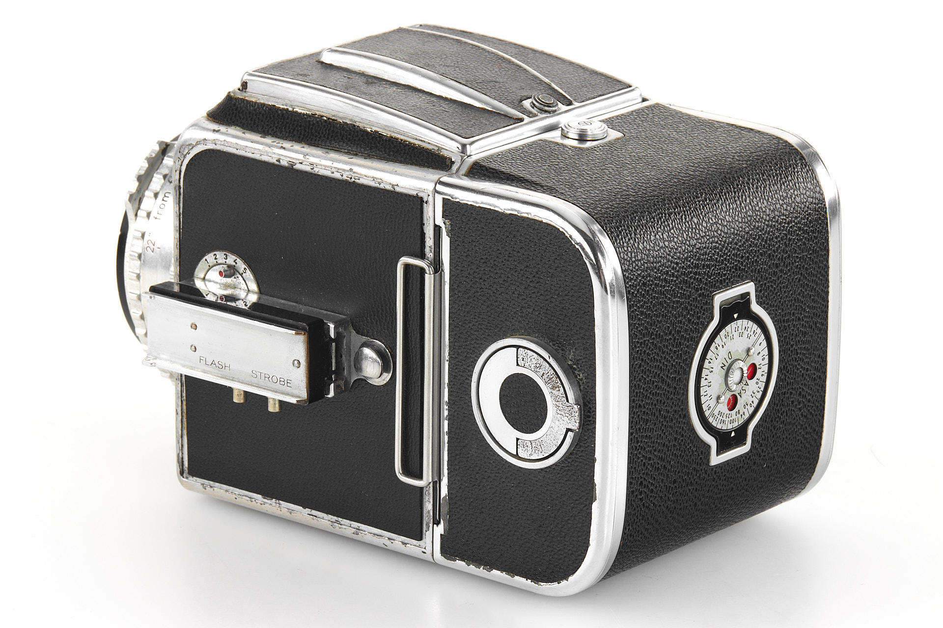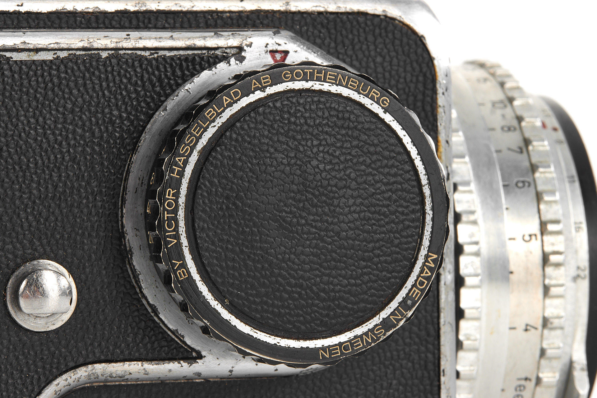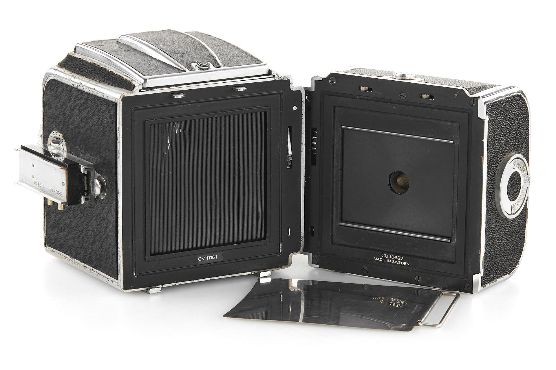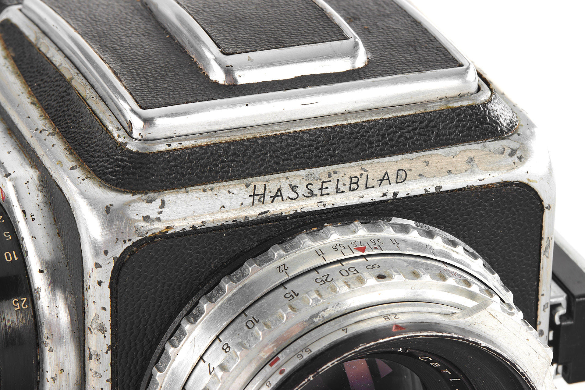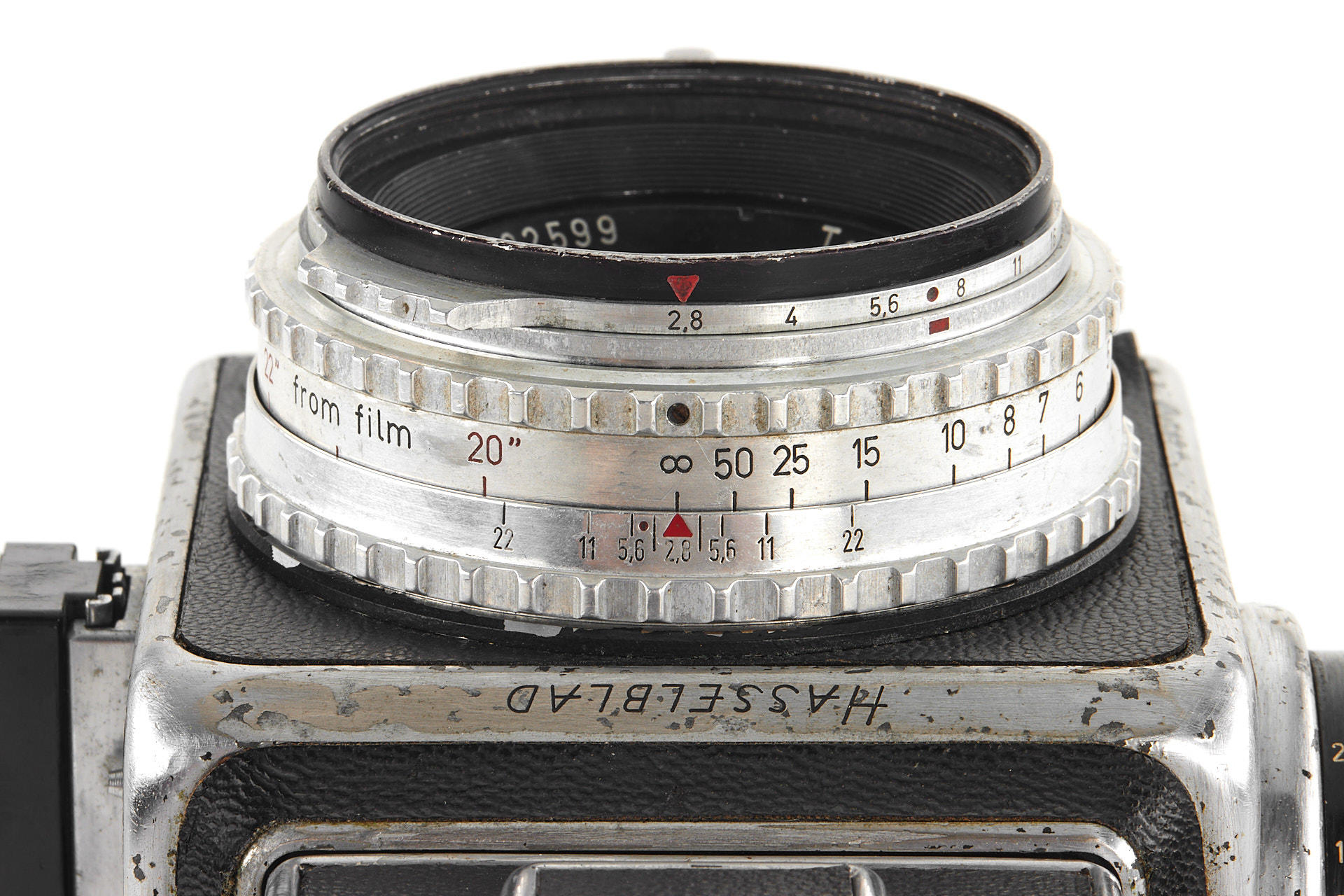 an early Hasselblad body with visible signs of age, the second type with black winding knob, with Tessar 2.8/80mm no.832599, magazine no.CU10682