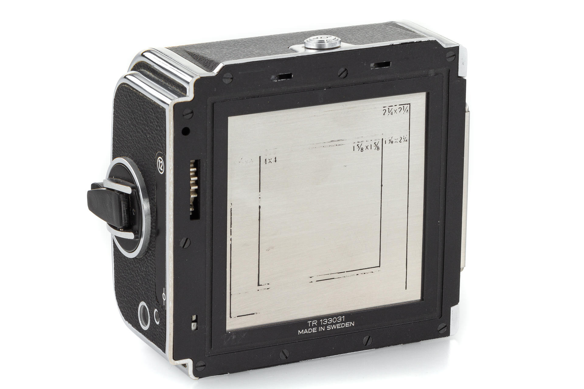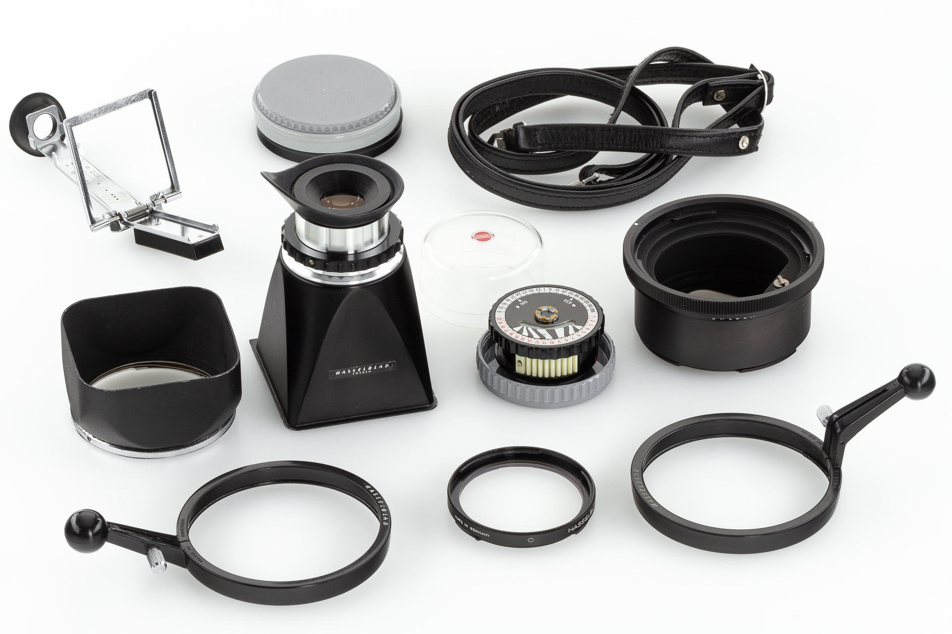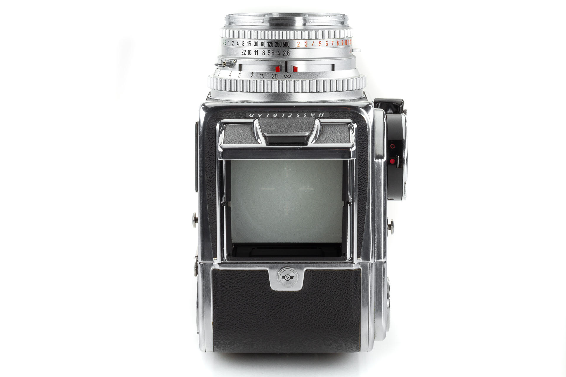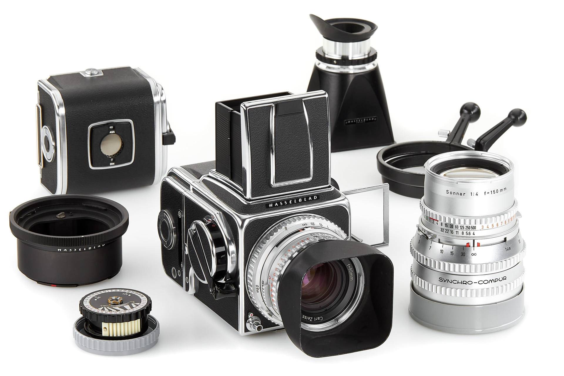 body in beautiful condition and in good working order, with chrome Planar 2.8/80mm no.4290691 (front cap), chrome Sonnar 4/150mm no.4588038 (caps), A12 magazine no.TU108256, second A12 magazine no.TR133031, magnifying finder, Hasselblad light meter (accuracy not tested), 32mm extension ring, two focusing grips, and a sport finder