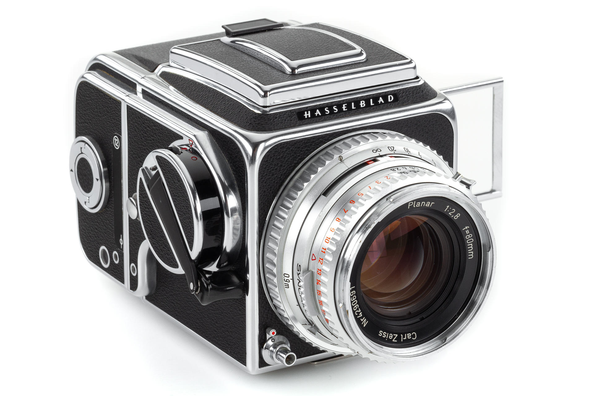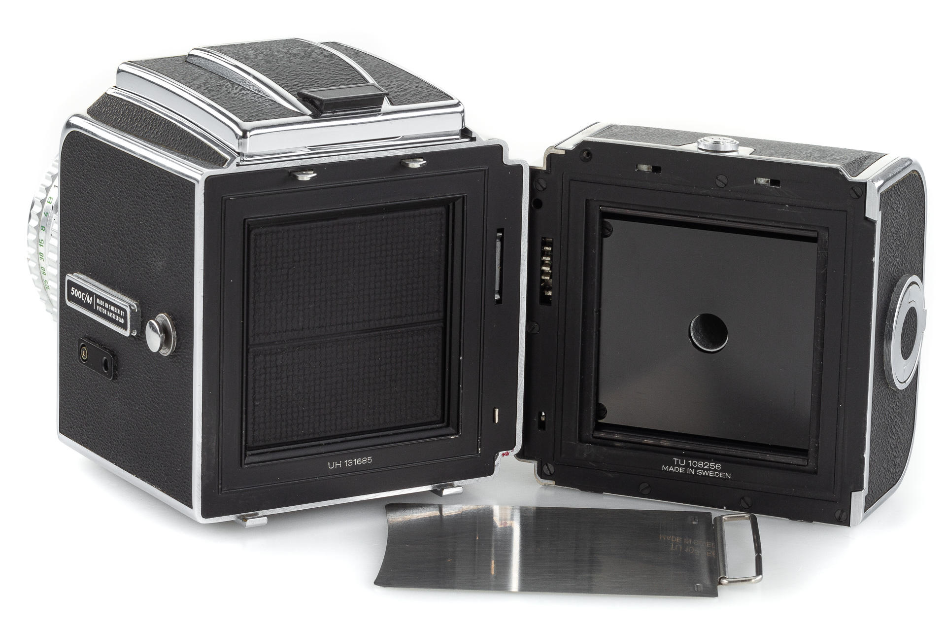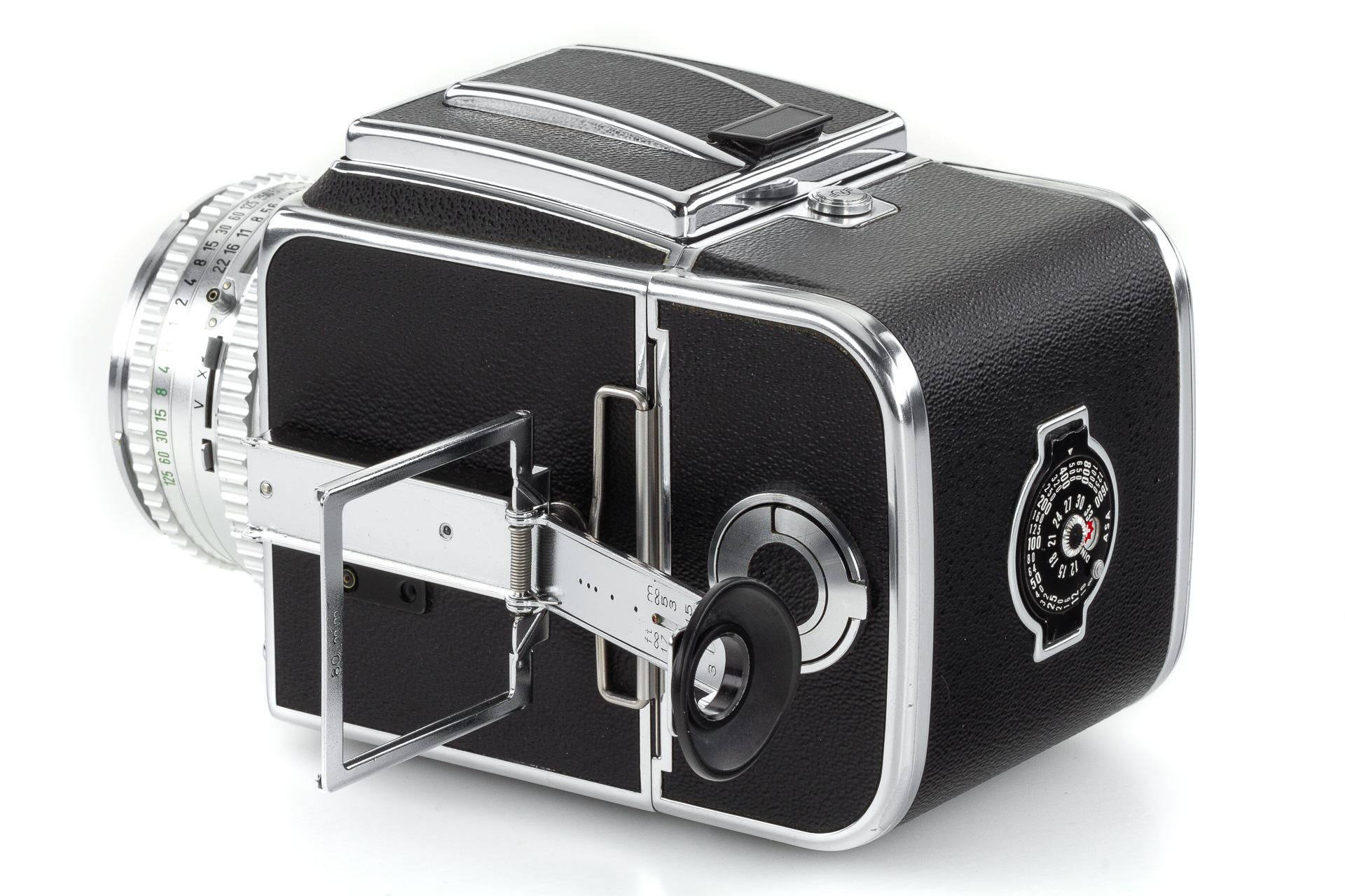 body in beautiful condition and in good working order, with chrome Planar 2.8/80mm no.4290691 (front cap), chrome Sonnar 4/150mm no.4588038 (caps), A12 magazine no.TU108256, second A12 magazine no.TR133031, magnifying finder, Hasselblad light meter (accuracy not tested), 32mm extension ring, two focusing grips, and a sport finder