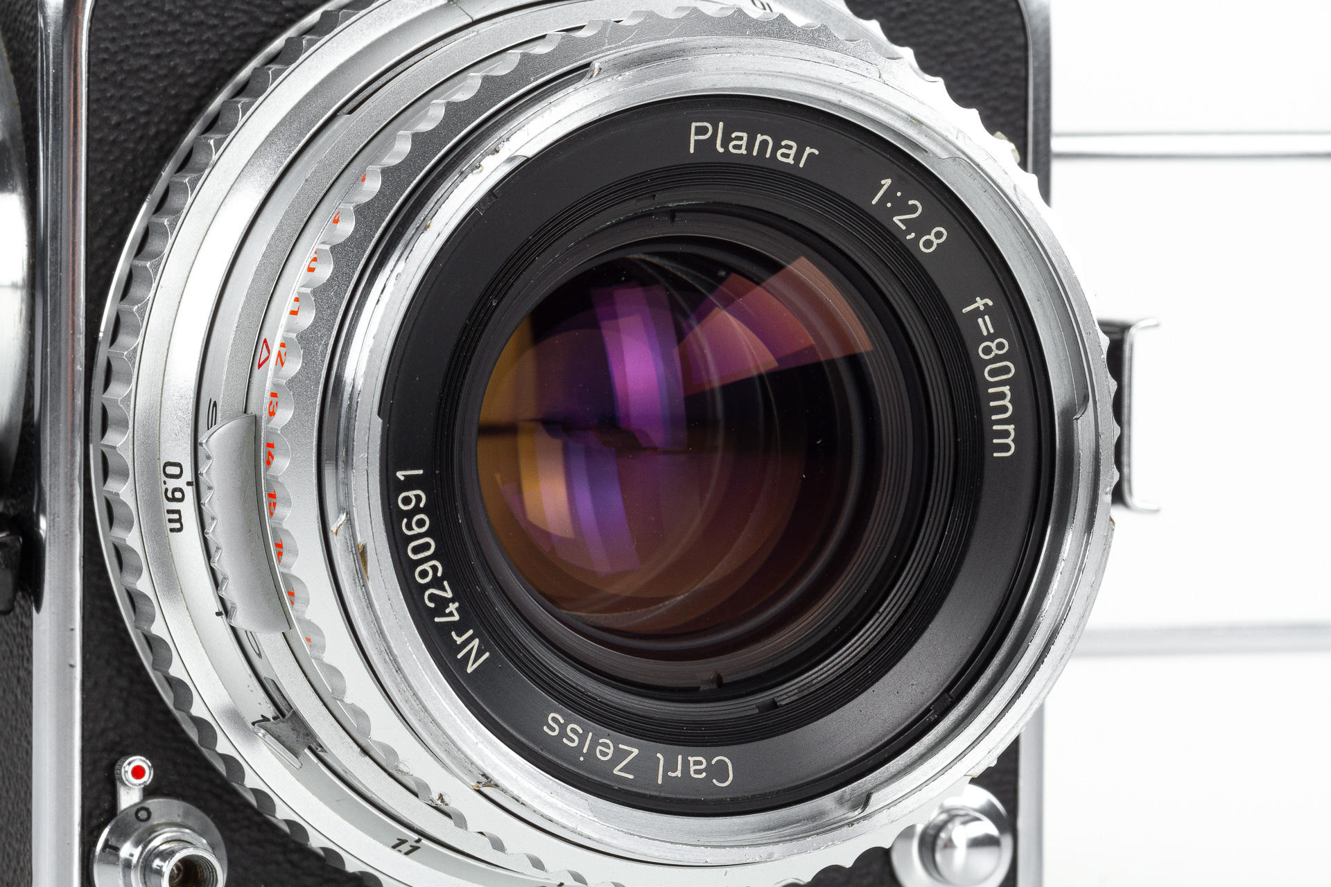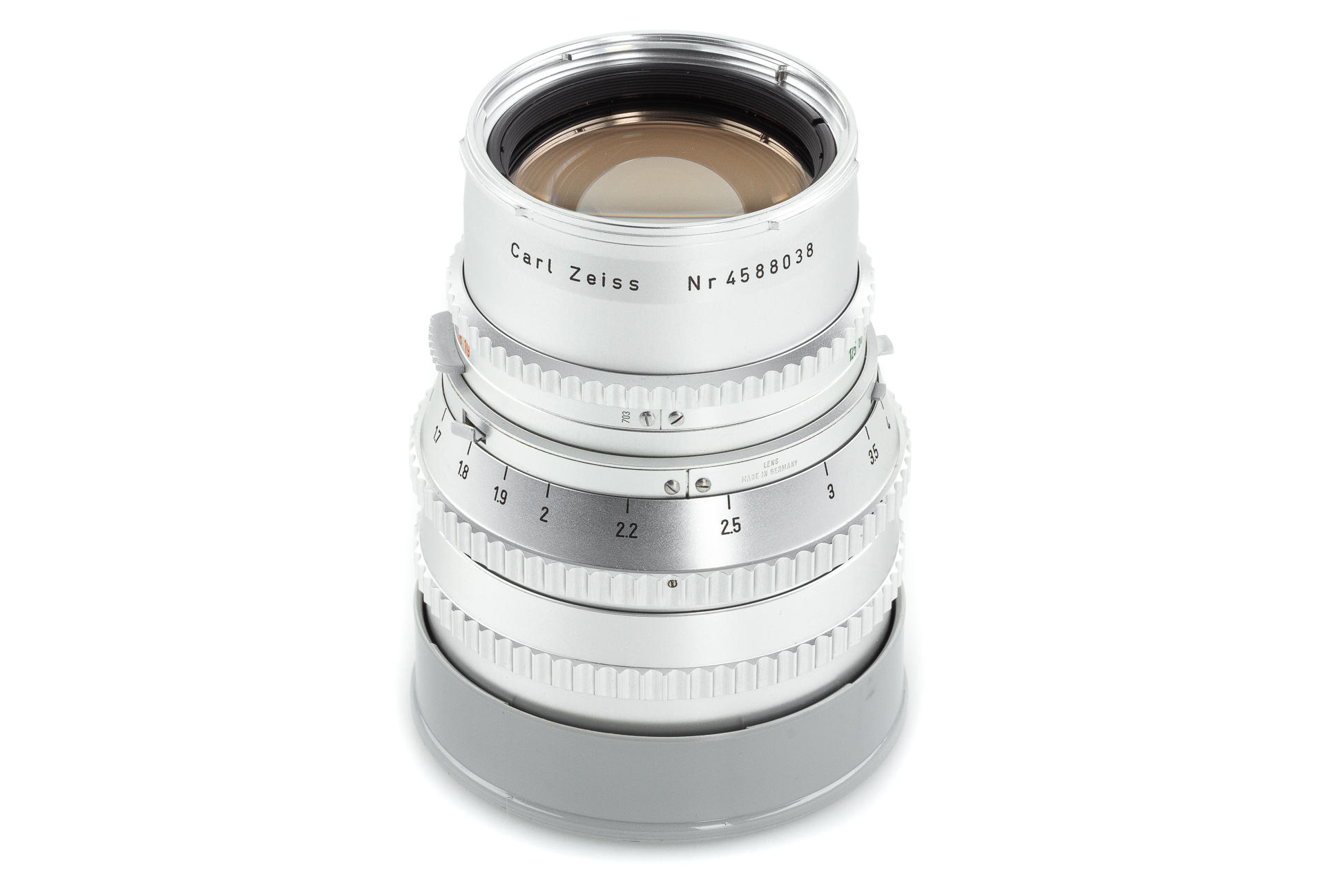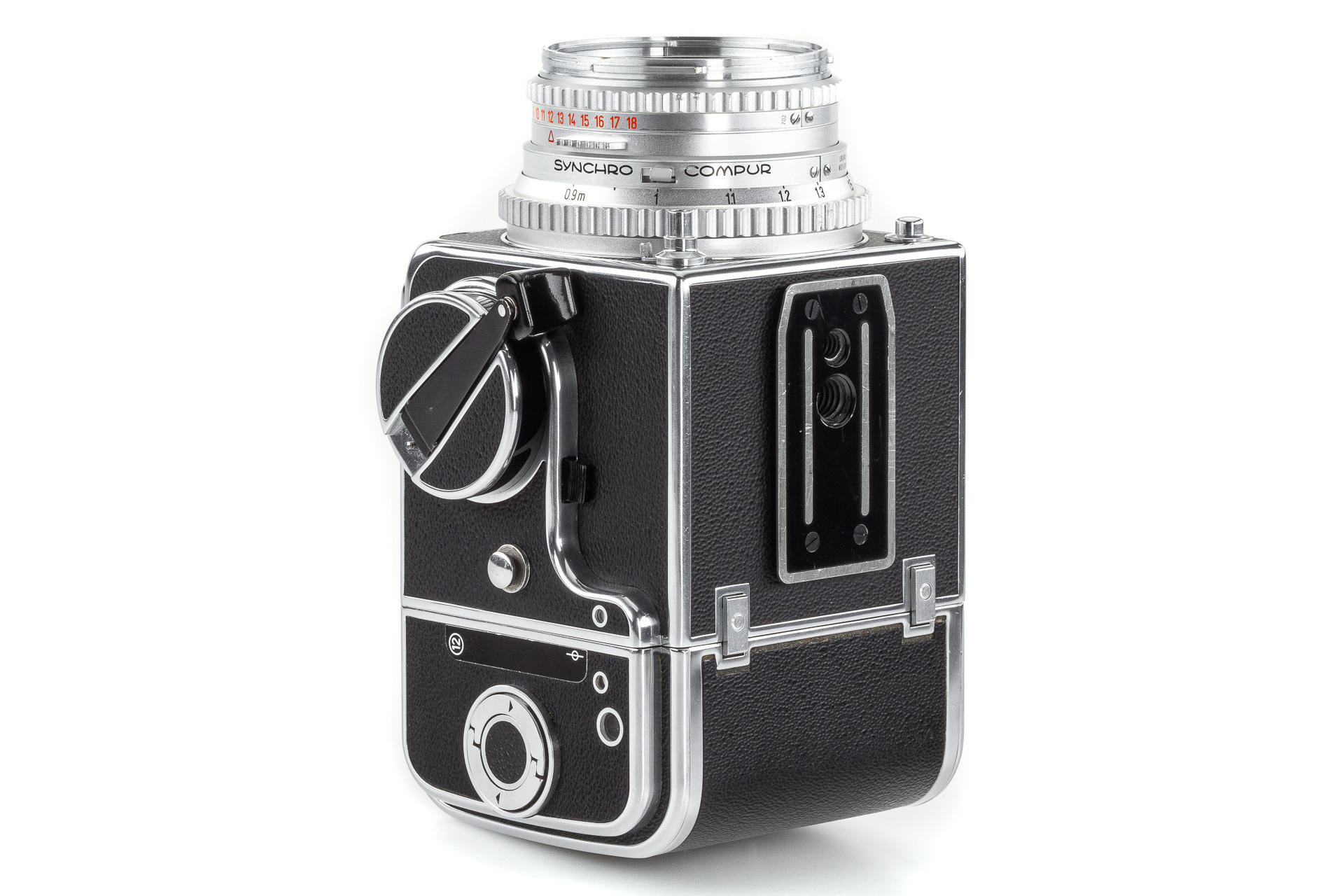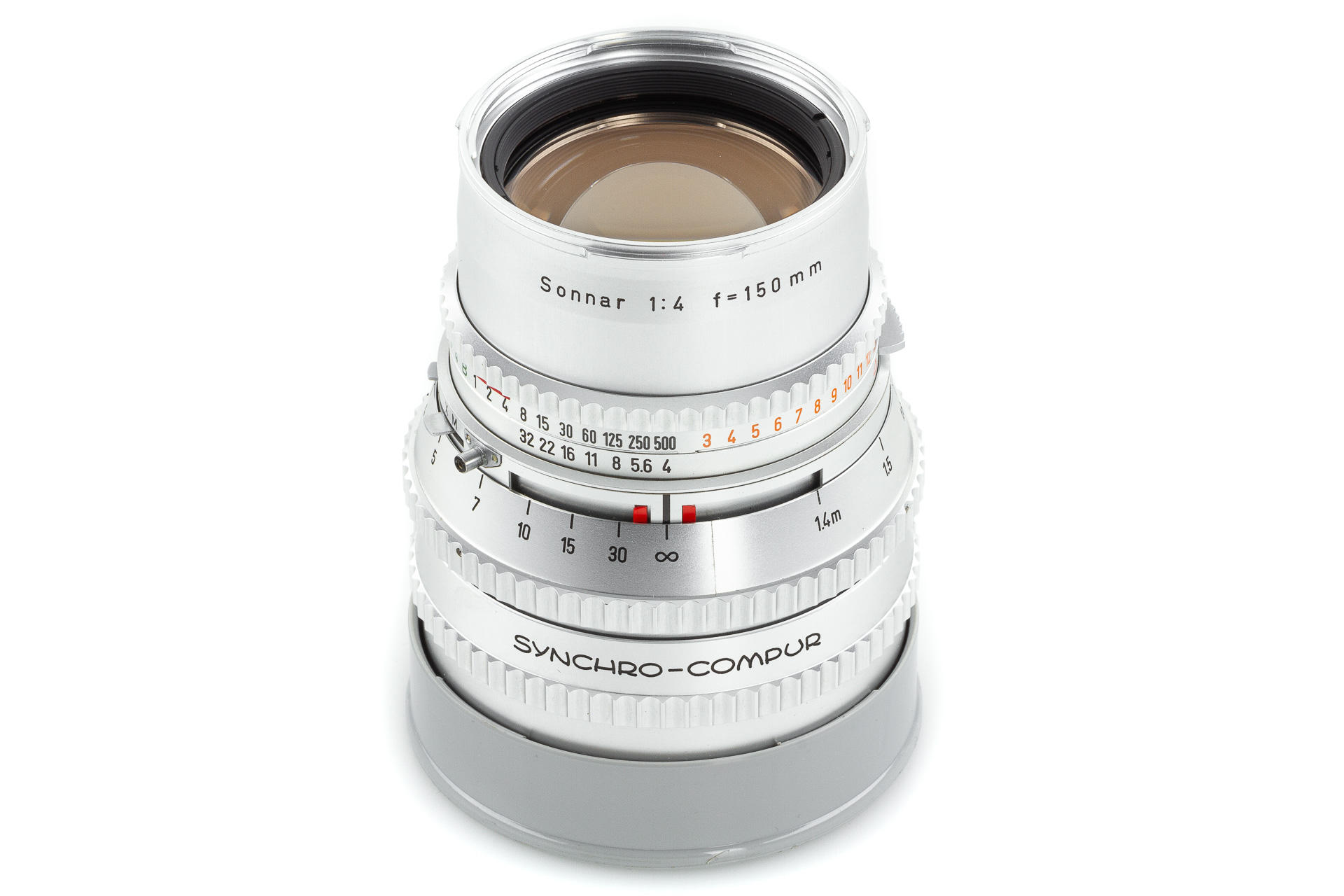 body in beautiful condition and in good working order, with chrome Planar 2.8/80mm no.4290691 (front cap), chrome Sonnar 4/150mm no.4588038 (caps), A12 magazine no.TU108256, second A12 magazine no.TR133031, magnifying finder, Hasselblad light meter (accuracy not tested), 32mm extension ring, two focusing grips, and a sport finder