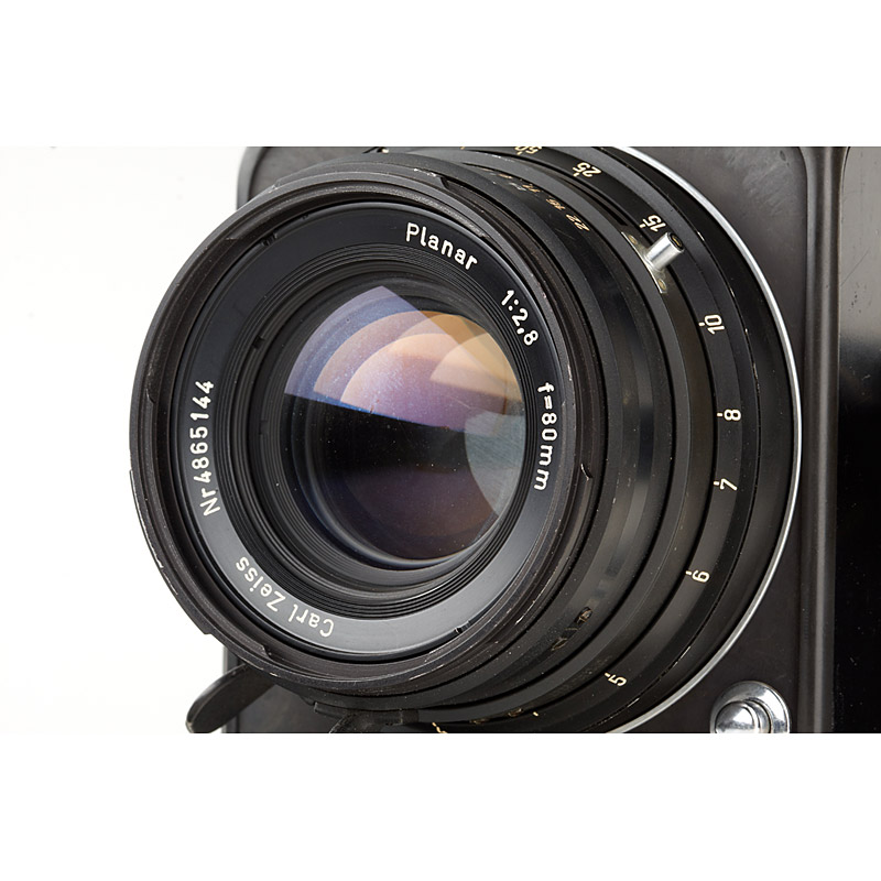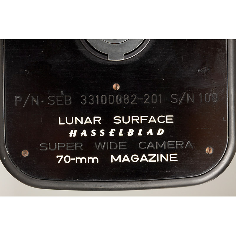 Early modified 500 EL/M with black anodised finish, produced for the Apollo Lunar missions. It is from the first generation NASA motor driven cameras that shot the first images on the surface of the moon. With some other modifications the camera mirror was removed to reduce the camera weight. A special large locking mechanism was added in order to change film magazines with bulky space gloves on. Similarly a larger sturdier shutter release plate has been added to the camera. It comes with a special NASA Planar 2.8/80mm no.4865144 with matching black anodised finish with control tabs, also designed for use with space gloves, a 70mm 200-exposure magazine no.TR400073 engraved: LUNAR SURFACE.P/N SEB 33100082-201 S/N 109, with the special NASA dark slide, in total only 29 cameras of this type were produced for NASA, camera and lens in beautiful, original condition, also included is a brass medal: 1969-1979 TEN YEARS ON THE MOON July 20th, 1969 'WE CAME IN PEACE FOR ALL MANKIND', in blue box with velvet inlet