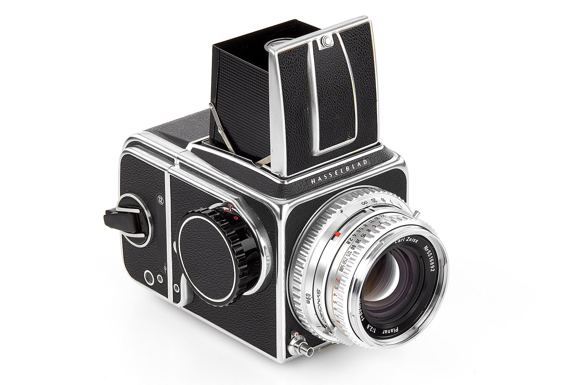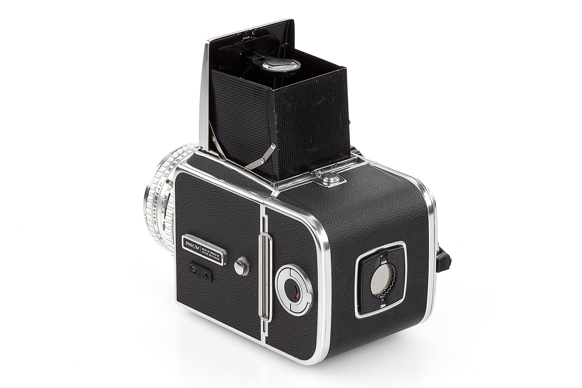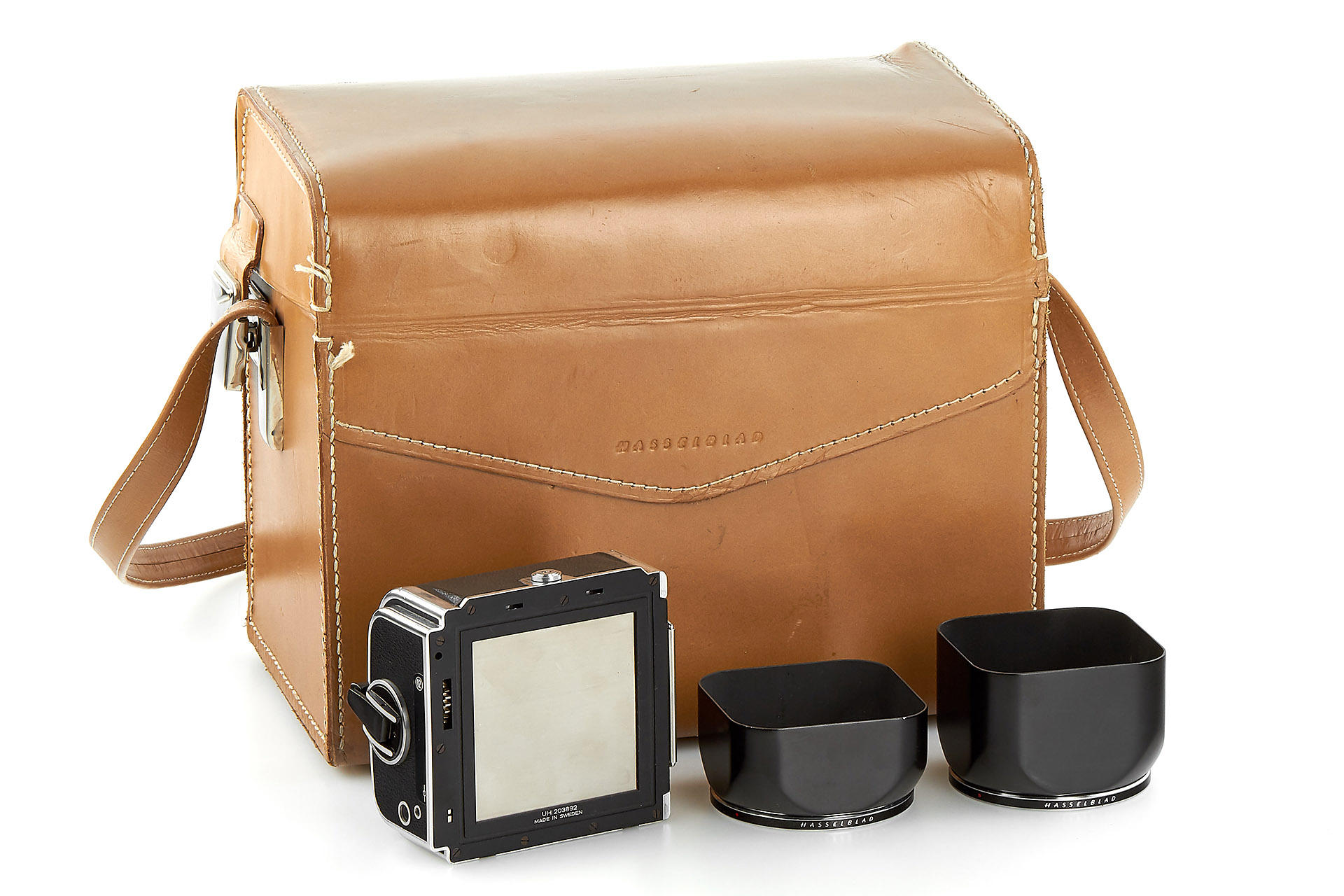 outfit in near mint condition and perfect working order, with camera body, waist-level finder, two A12 magazines no.UH203892 and UH203223, T* Planar 2.8/80mm no.5516892, Sonnar 5.6/250mm no.5453288, caps, strap, three filters, hoods for 80mm and 250mm, everything in original Hasselblad outfit case