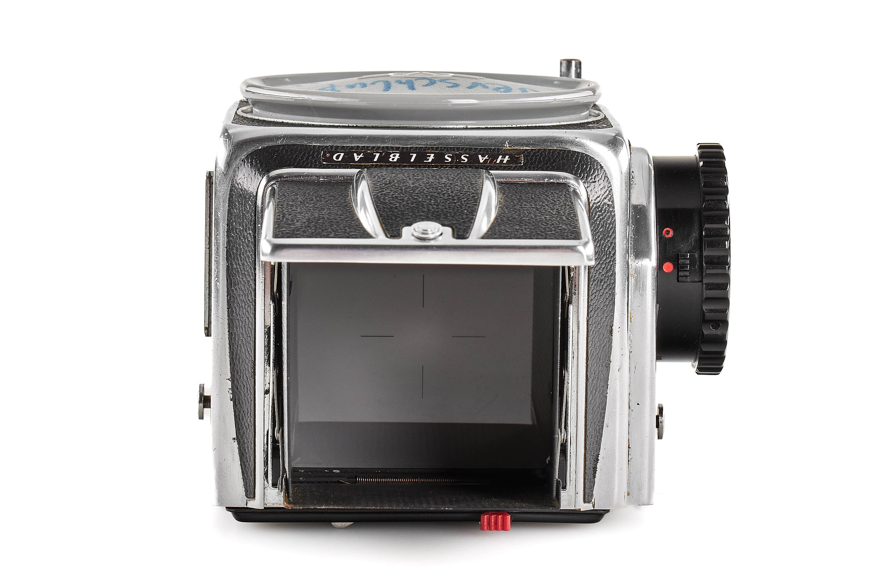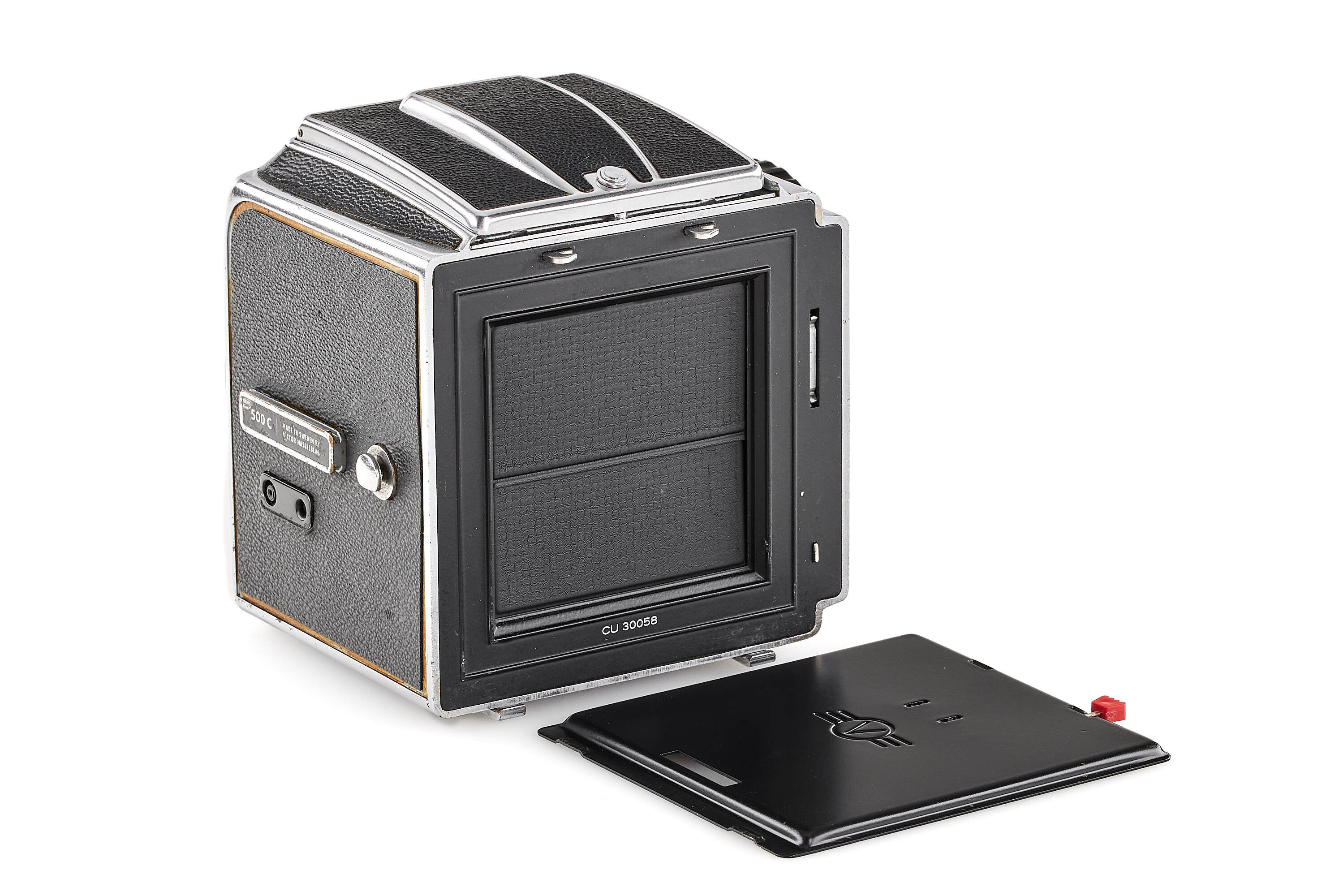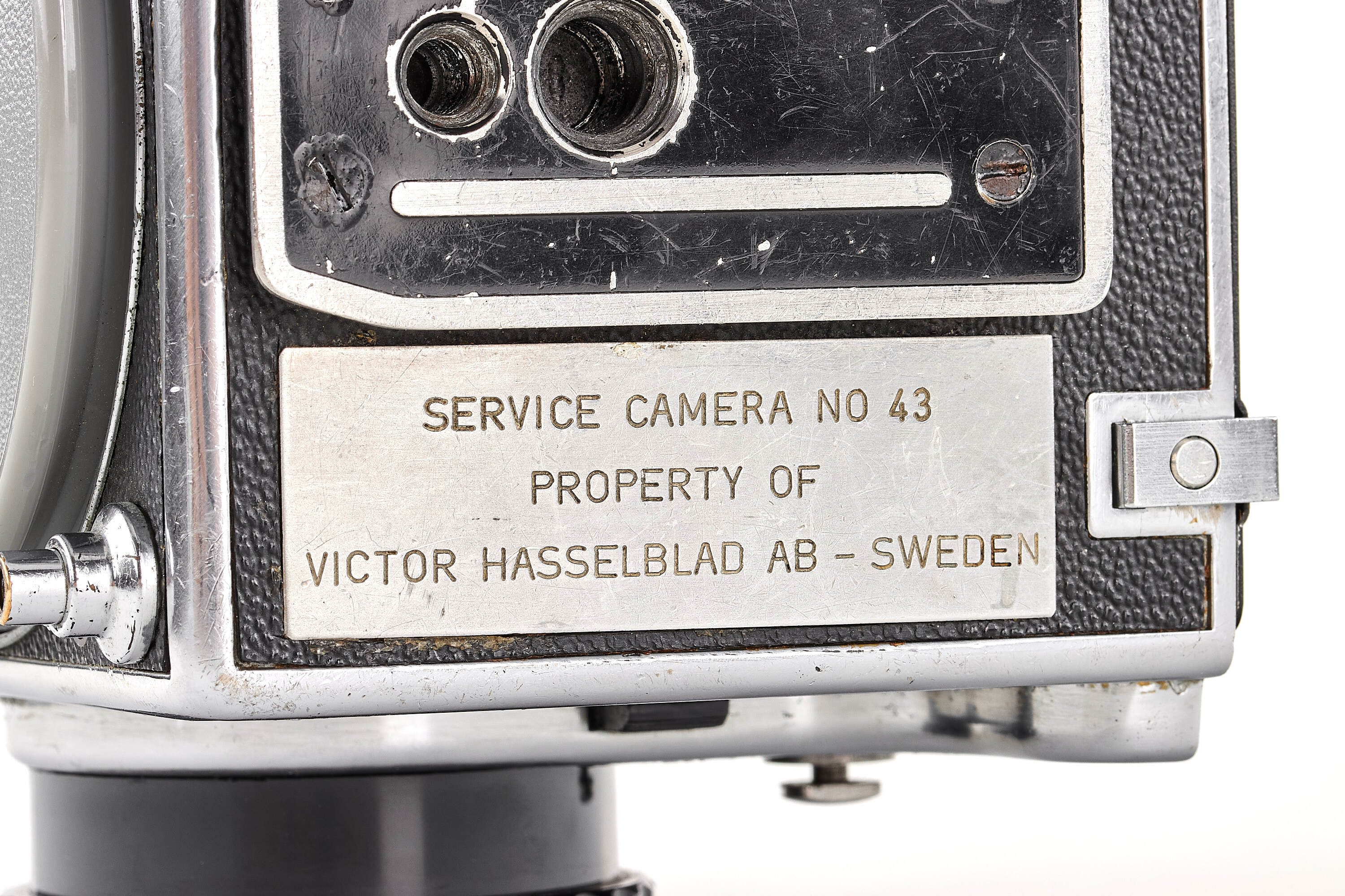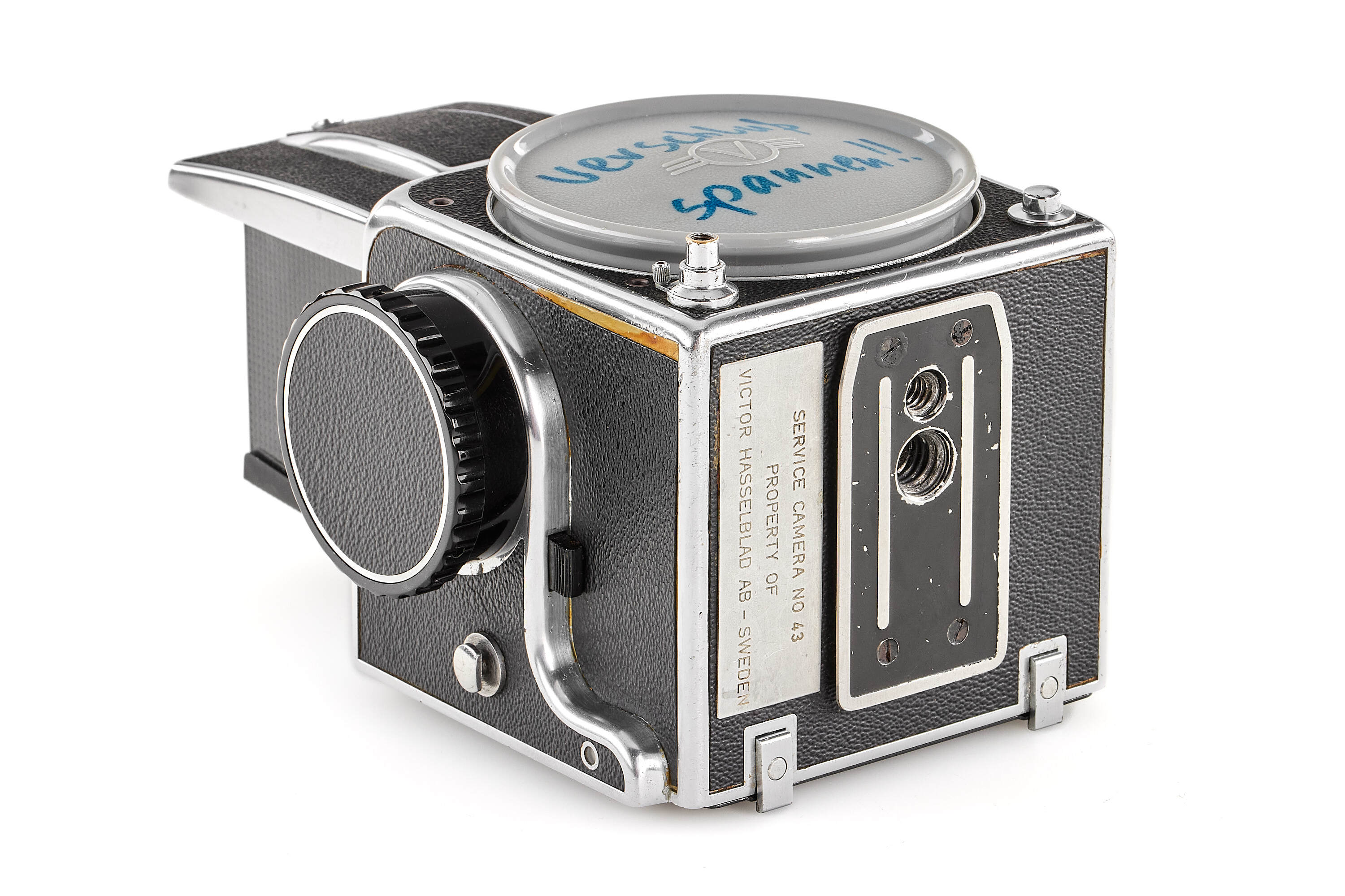 Interesting extremely early 500C body, the 58th (production starts with no.CU30001) for internal testing purpose, in very good, original condition, with a plate engraved with 'Service Camera NO 43 Property of Victor Hasselblad - Sweden' placed on the bottom, note on the left side of the front, 2 holes for a motor drive attachment which never came into production in this form, with body cap and rear cap.