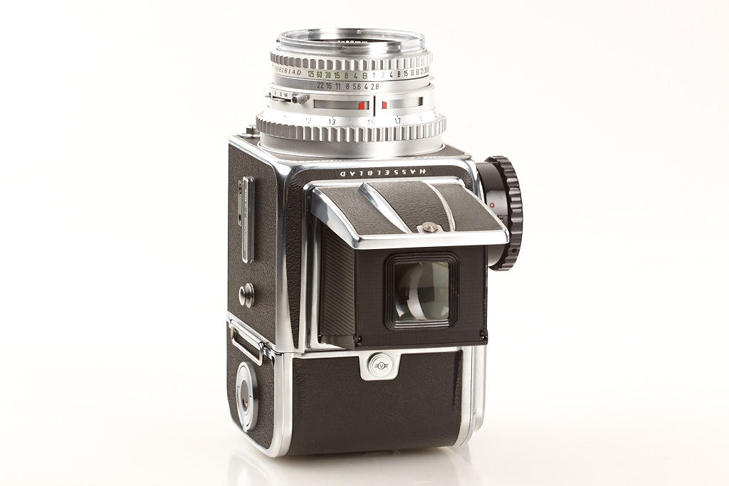 chrome body in near mint condition including 3 matching chrome lenses: Planar 2.8/80mm no.4861337 (cap), Sonnar 4/150mm no.4807920 (cap, keeper), Sonnar 5.6/250mm no.5037154 (cap, keeper), two magazine 12 nos.TE145699 & US164613, two hoods, Proxar 1m, frame finder (in maker's box), quick focusing handle (in maker's box), all in fitted black Hasselblad outfit case