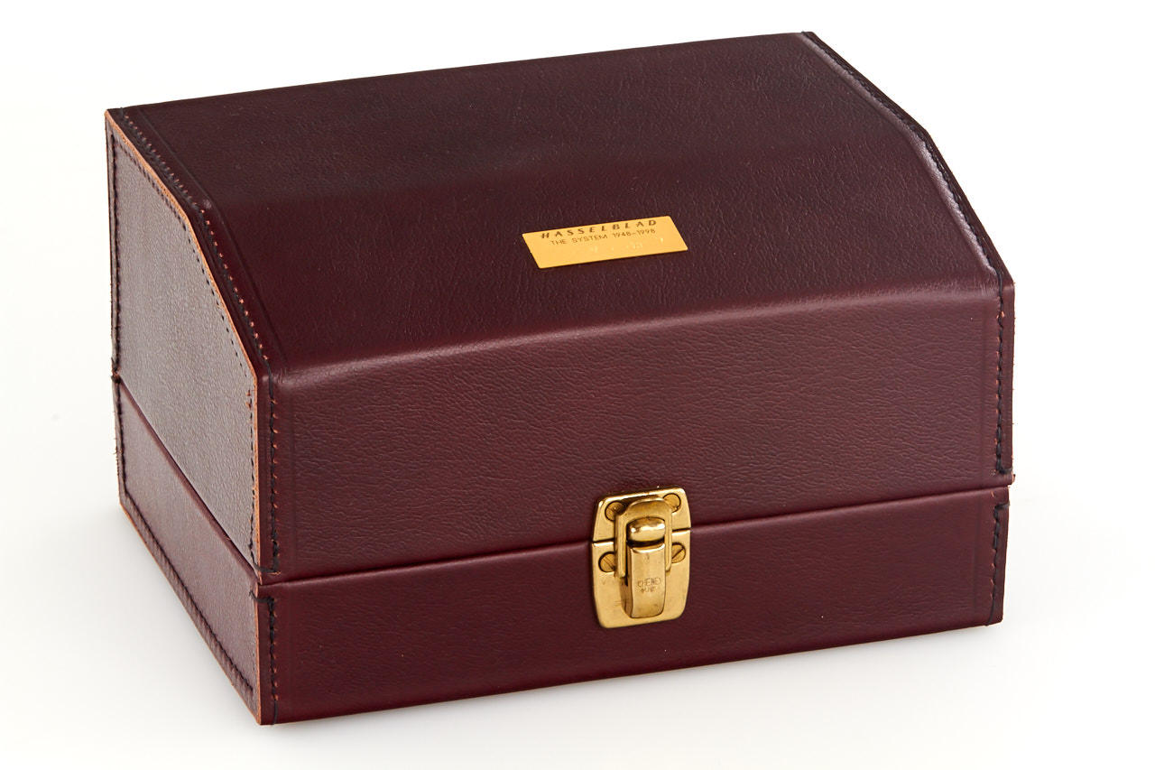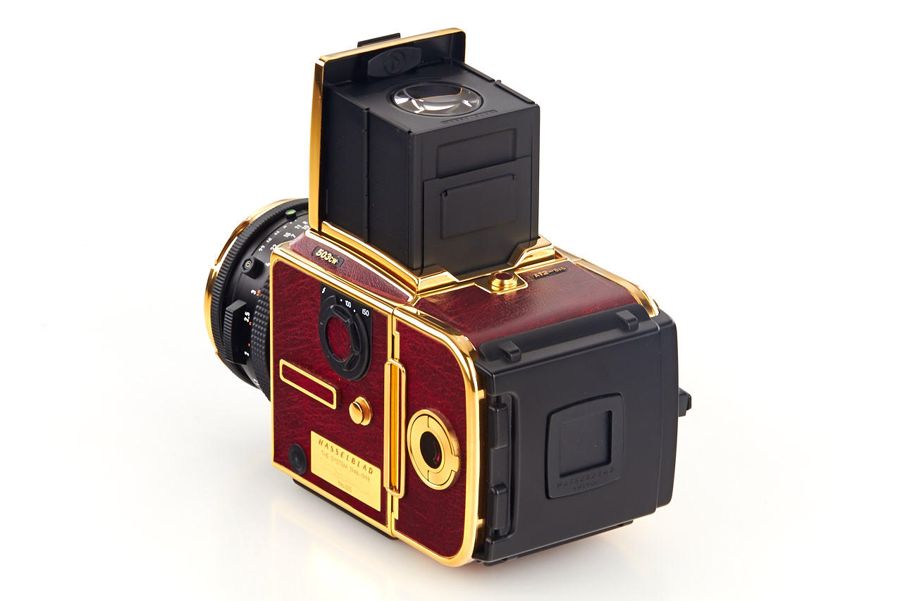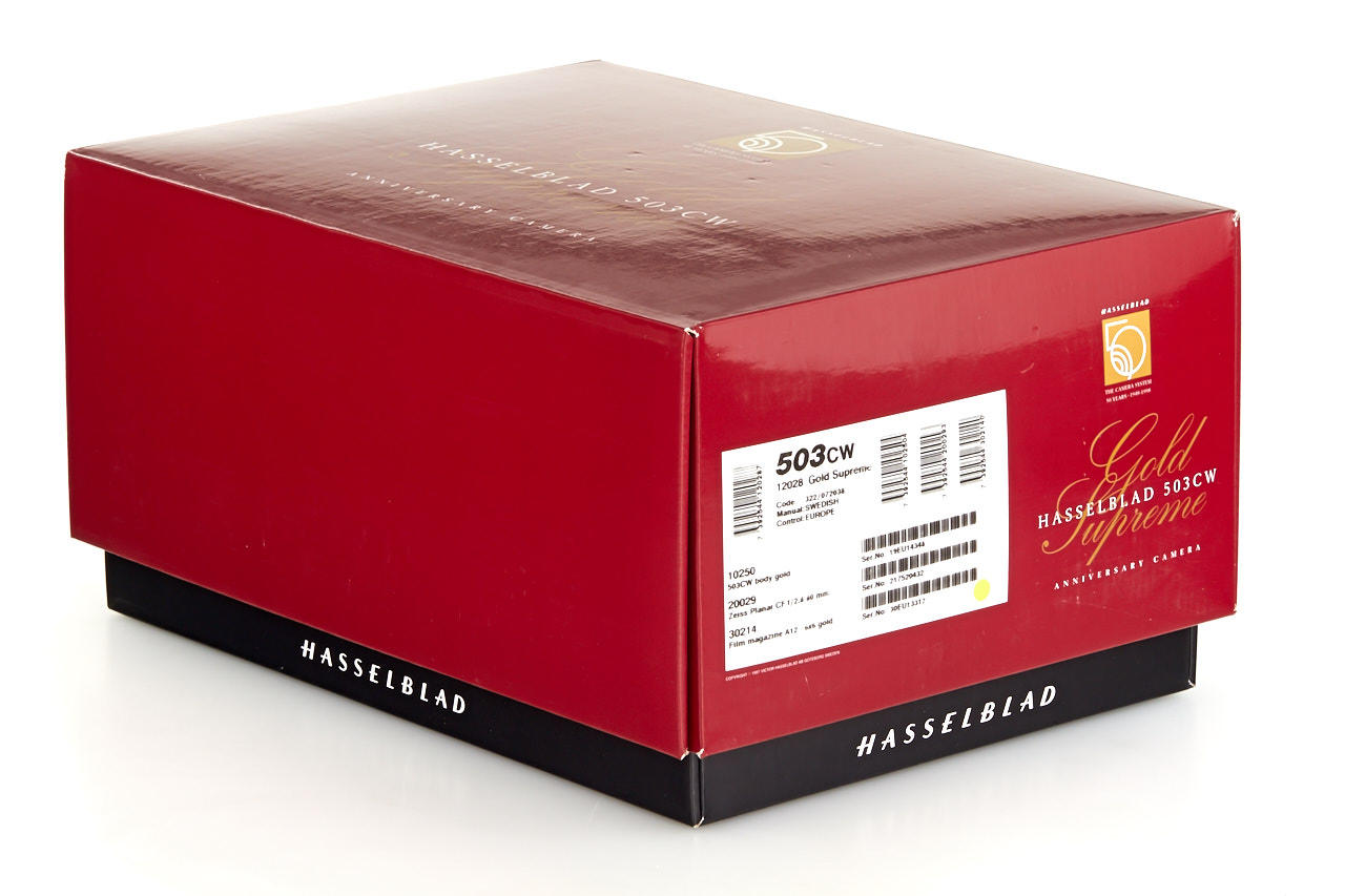 gold edition with brown leather covering for the 50th anniversary of Hasselblad, special number 025 (only 500 cameras have been issued), with special Planar CF T* no.7520432, gold-plated A12 magazine no.30EU13312, cap, special strap, all papers, brown leather presentation box and large maker's box