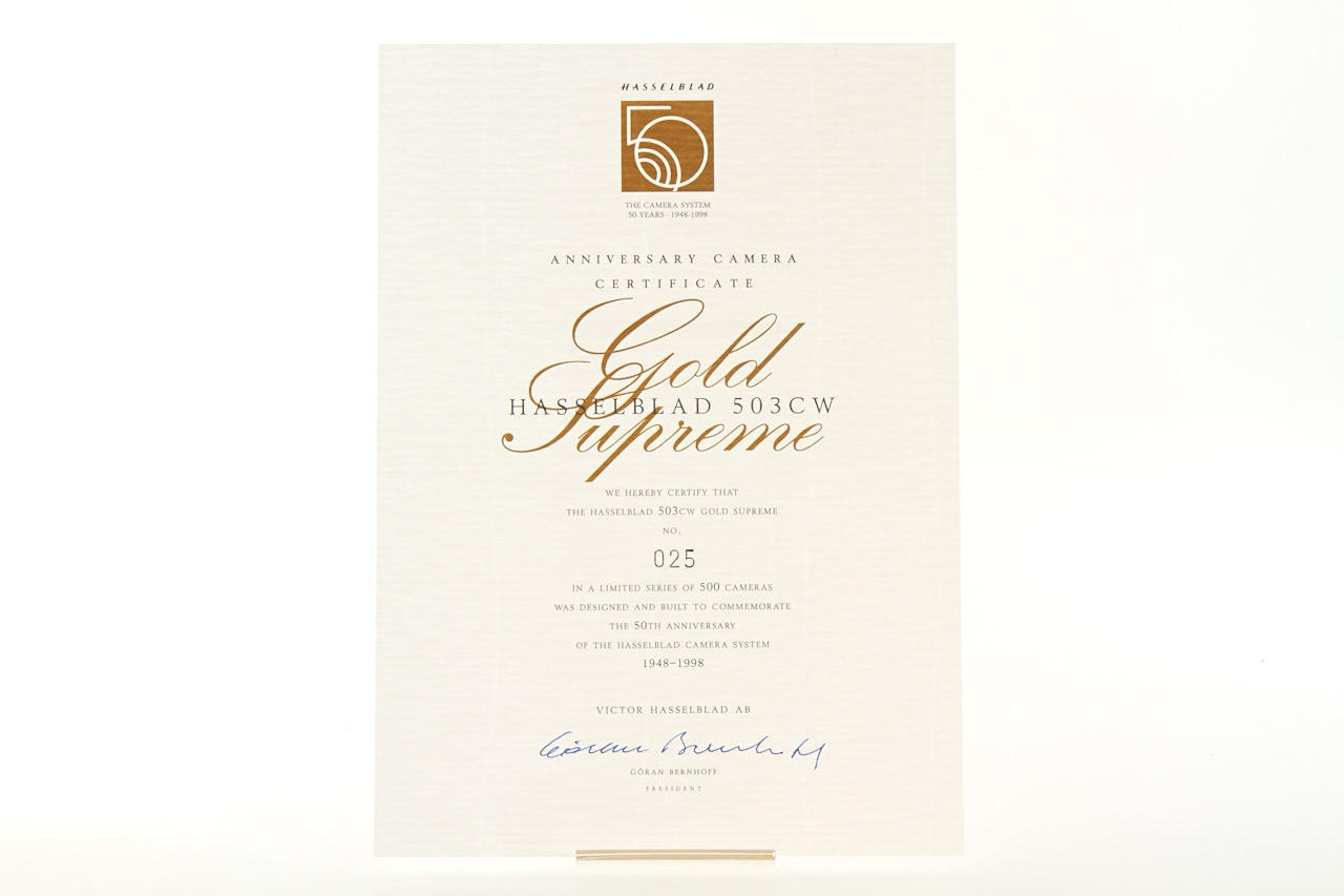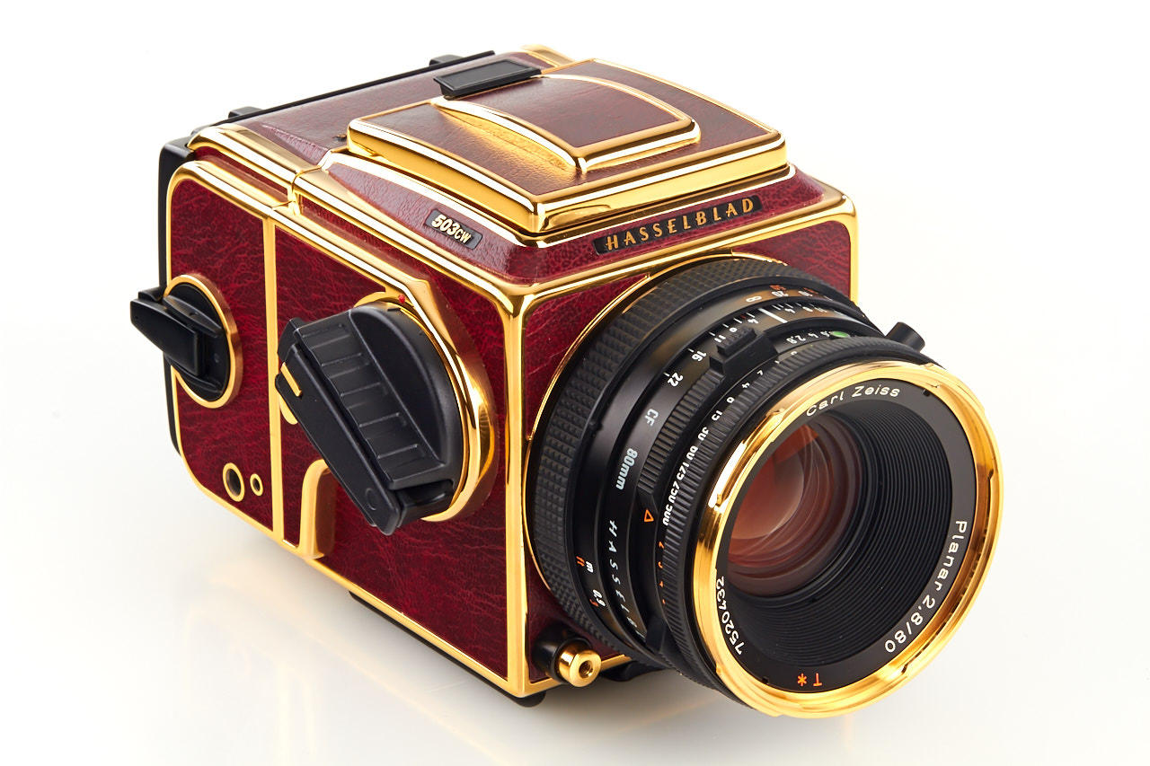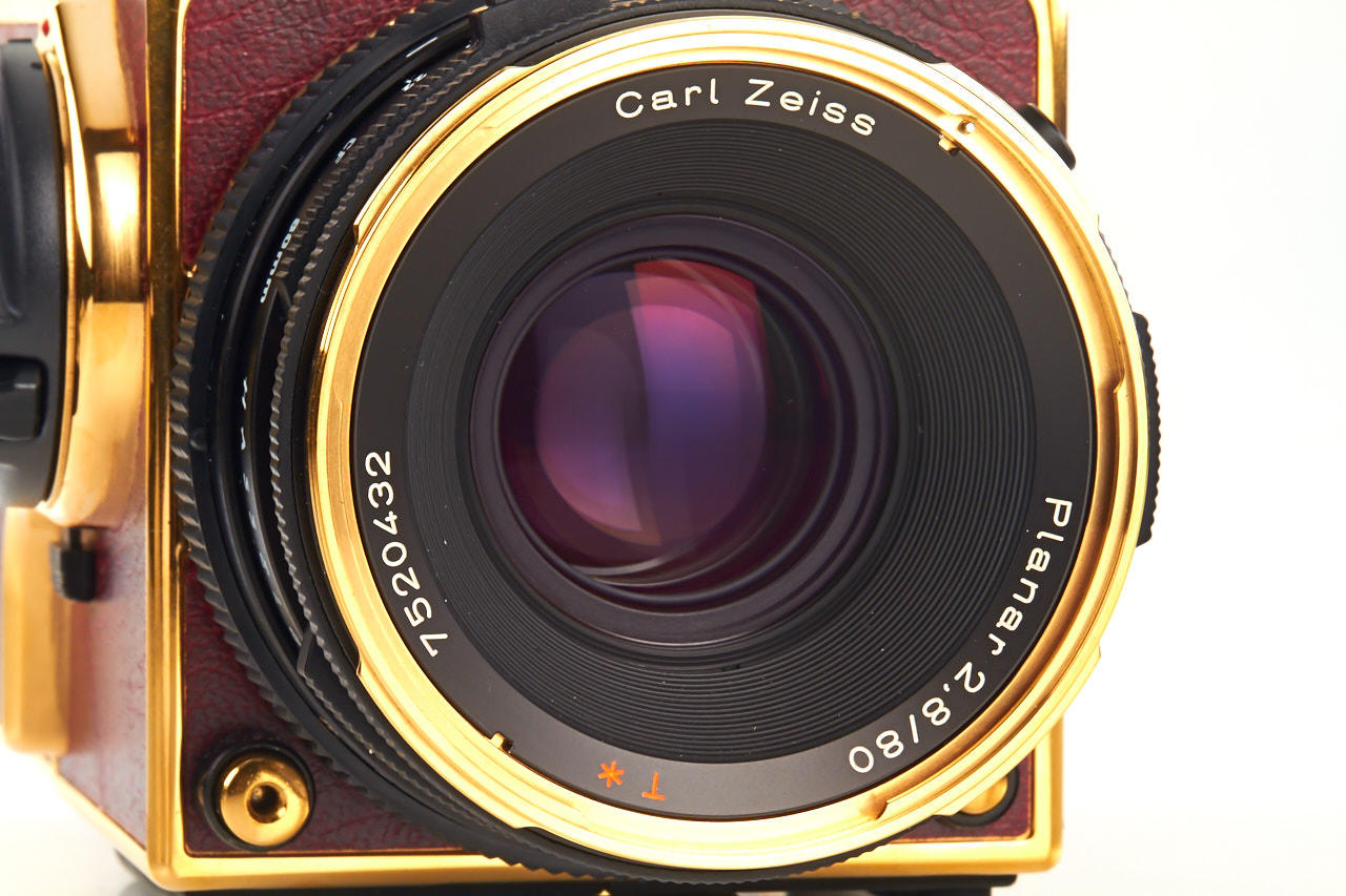 gold edition with brown leather covering for the 50th anniversary of Hasselblad, special number 025 (only 500 cameras have been issued), with special Planar CF T* no.7520432, gold-plated A12 magazine no.30EU13312, cap, special strap, all papers, brown leather presentation box and large maker's box