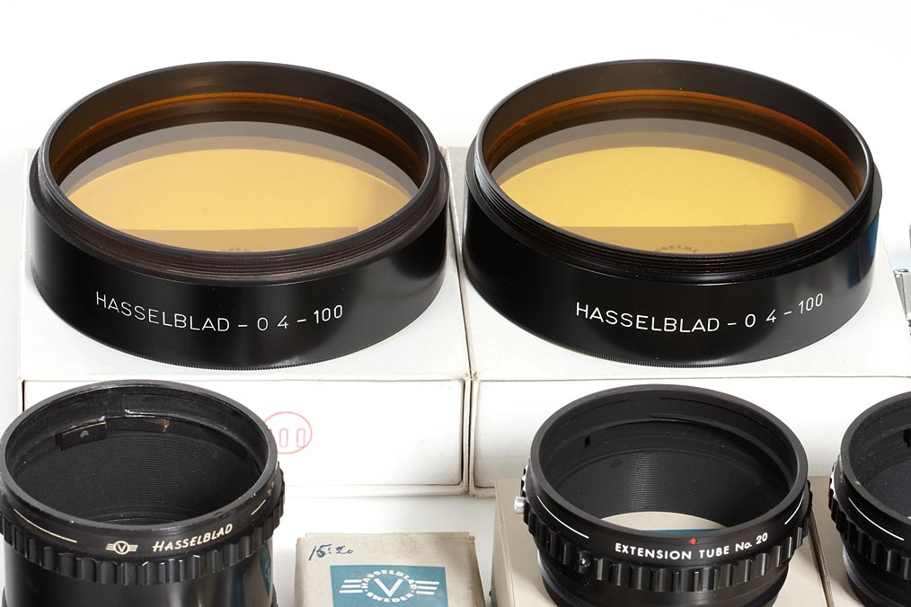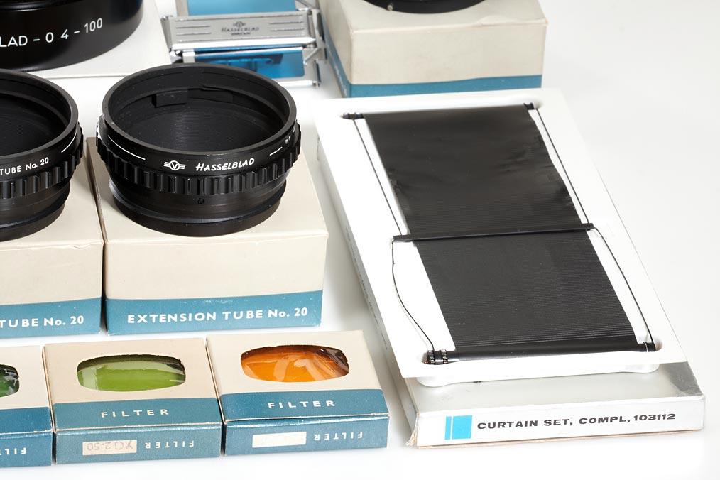 2x 100 Yellow/Orange filters f. Dallmeyer Dallon 5.6/508mm new in maker's boxes, 3x extension tube 20 new in maker's boxes, extension tube 20 + 40 (cond.B), Curtain Set (cond.B) in maker's box, 5 Hasselblad filters 50 new in maker's boxes, sports finder, contact shoe in maker's box - all for system 1600F/1000F (15)