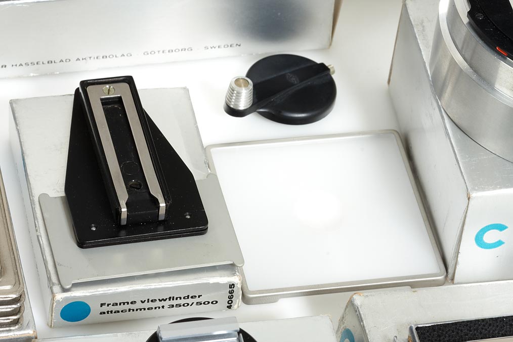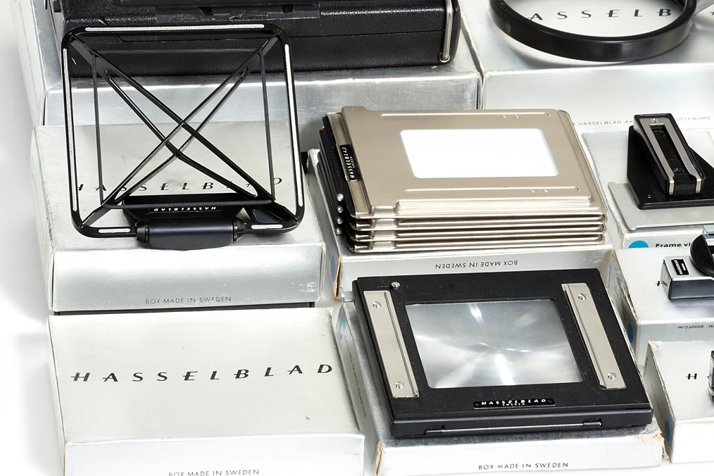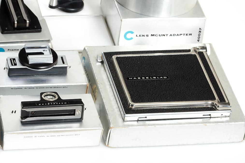 magazine for Polaroid Film 88, Cut Film Adapter, 2x Cut Film Holder (4 pcs.), Quick-Focusing Handle 2, Frame Viewfinder, Interchangeable Focusing Screen with central grid 1, Ground Glass Adapter, Lens Mount Adapter, Film Cassette for Magazine 70, Adjustable Flash Shoe, Spirit Level, Quick Winding Crank for Magazine, Frame viewfinder attachment 350/500 - all in maker's boxes (14)