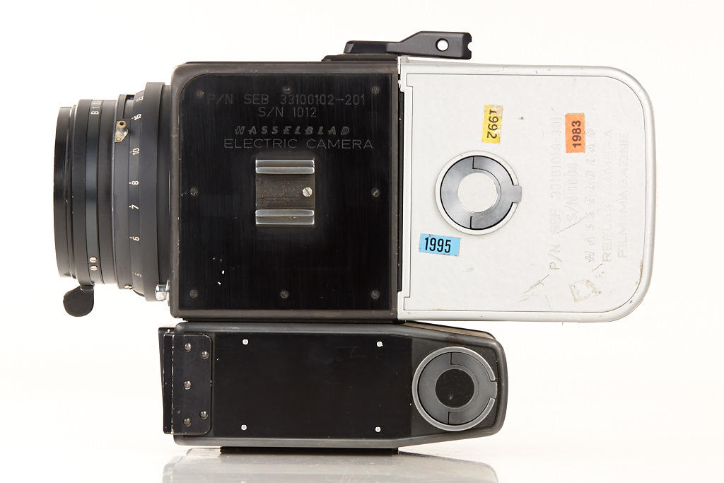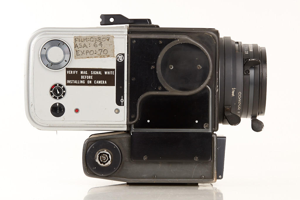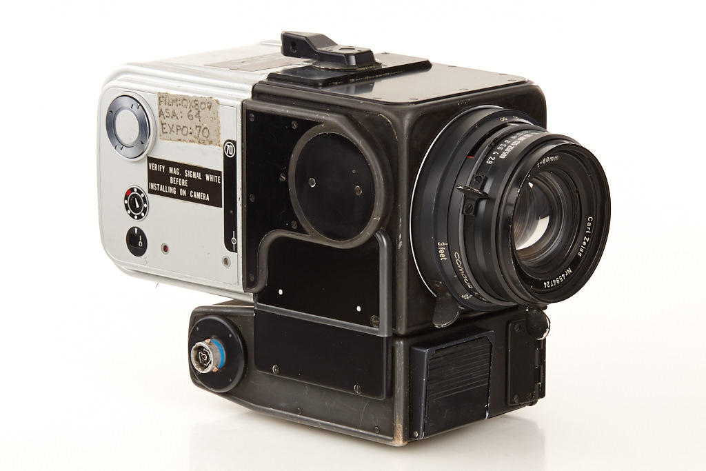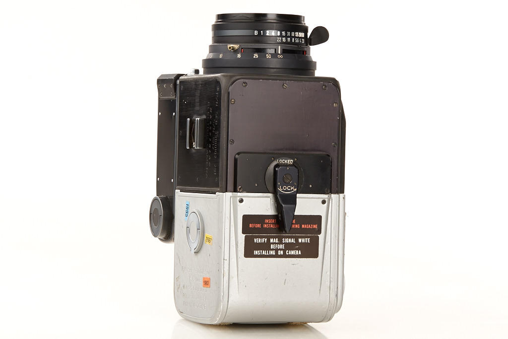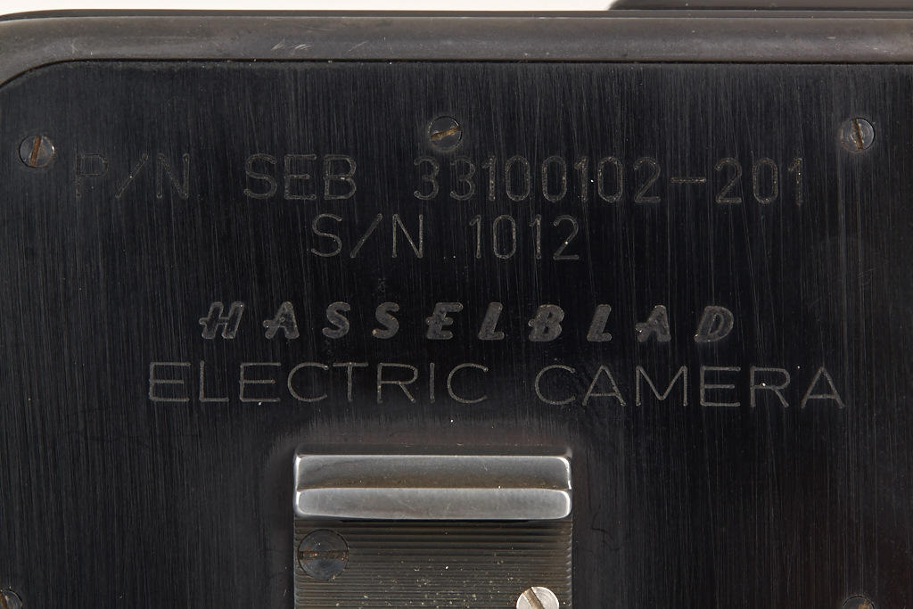 very rare, early authentic for NASA modified 500 EL/M with black anodised finish (original camera, not a replica), pre-runner of the later produced HEC (Hasselblad Electric Camera) for the Apollo Lunar missions. It is from the first generation NASA motor-driven cameras which were also taken on the manned voyage which passed close to the moon on December 21st to 27th,1968. During this voyage 10 orbits of the moon were made, the purpose being to survey future landing sites. Along with other modifications the camera mirror was removed to reduce weight. A special large locking mechanism was added in order to change film magazines with bulky space gloves on. Similarly a larger, sturdier shutter release plate was added to the camera. It comes with a special NASA Planar 2.8/80mm no.4594724 with matching black anodised finish with control tabs, also designed for use with space gloves, a silver 70mm magazine no.UI310744 S/N 1008, engraved: P/N SEF 33101018-301 S/N 1008 REFLEX CAMERA FILM MAGAZINE, several stickers and NASA inventory stickers, the body engraved: P/N SEB 33100102-201 S/N 1012 HASSELBLAD ELECTRIC CAMERA - also included the new book by Alain Lazzarini - Hasselblad and the Moon
