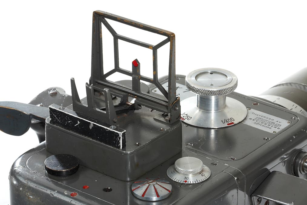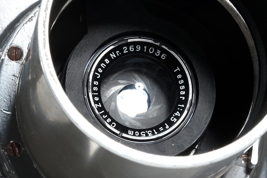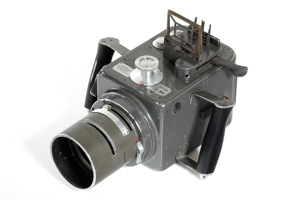 historically important first camera manufactured by Viktor Hasselblad, a military aerial camera for 80mm perforated film, format 7x9cm, Tessar 4.5/13.5cm no.2691036, cap, wooden outfit case marked : HK 7 F7 T