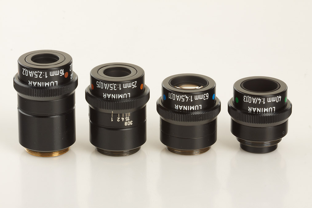 mint set of 4 Luminar lenses with keepers (16mm 1:2,5/A0,2, 25mm 1:3,5/A0,15, 40mm 1:4/A0,13, 63mm 1:4,5/A0,11), microscope shutter in maker's box, microscope adapter in maker's box