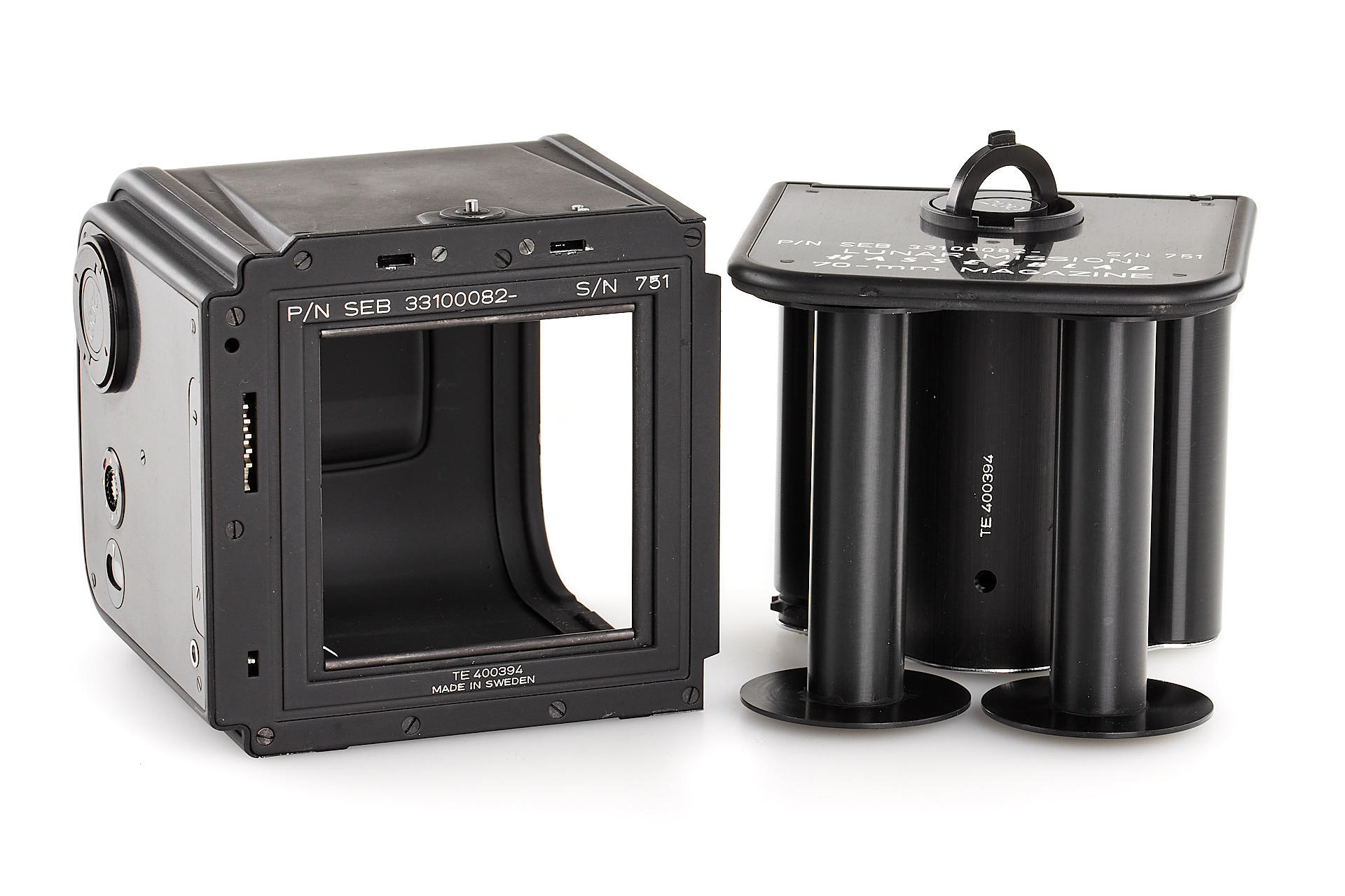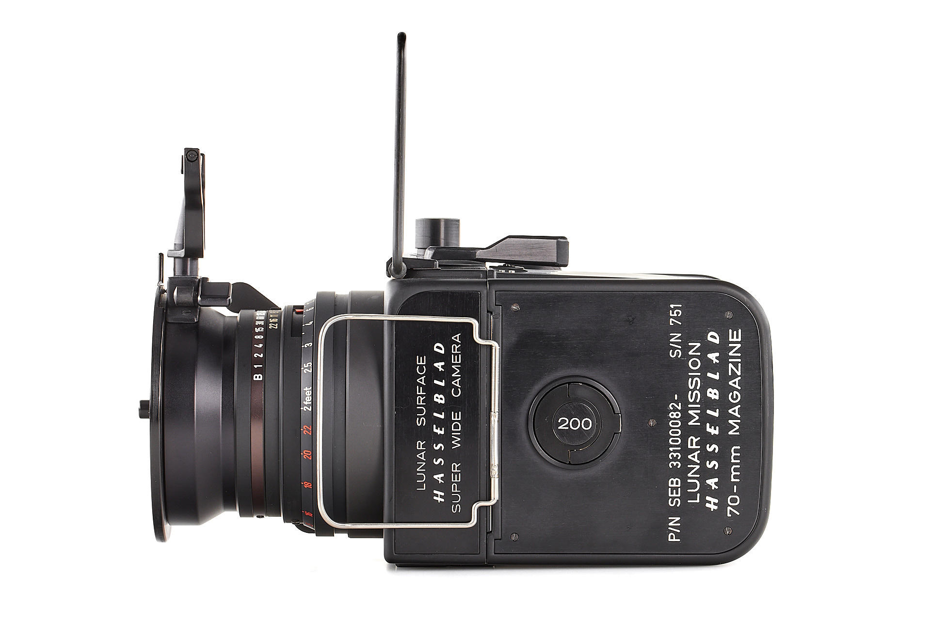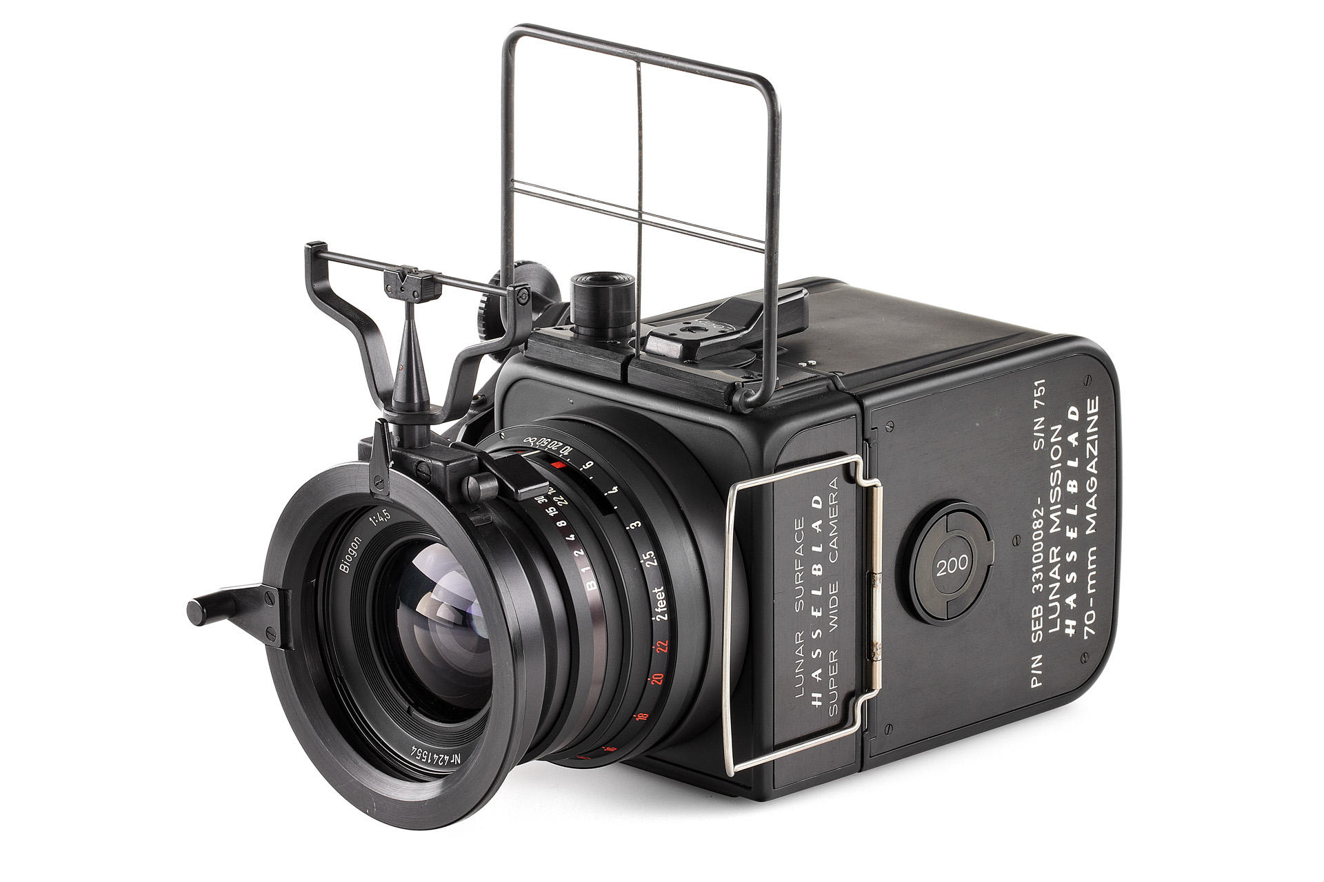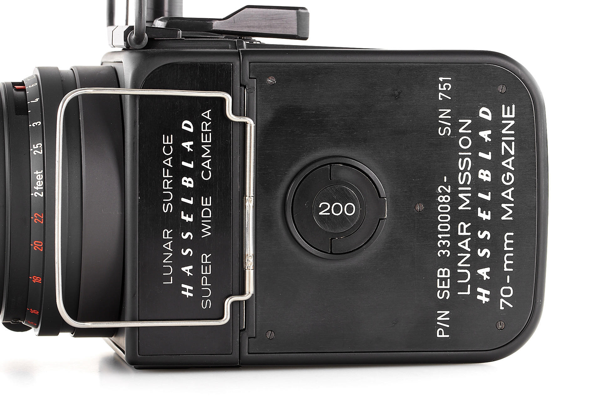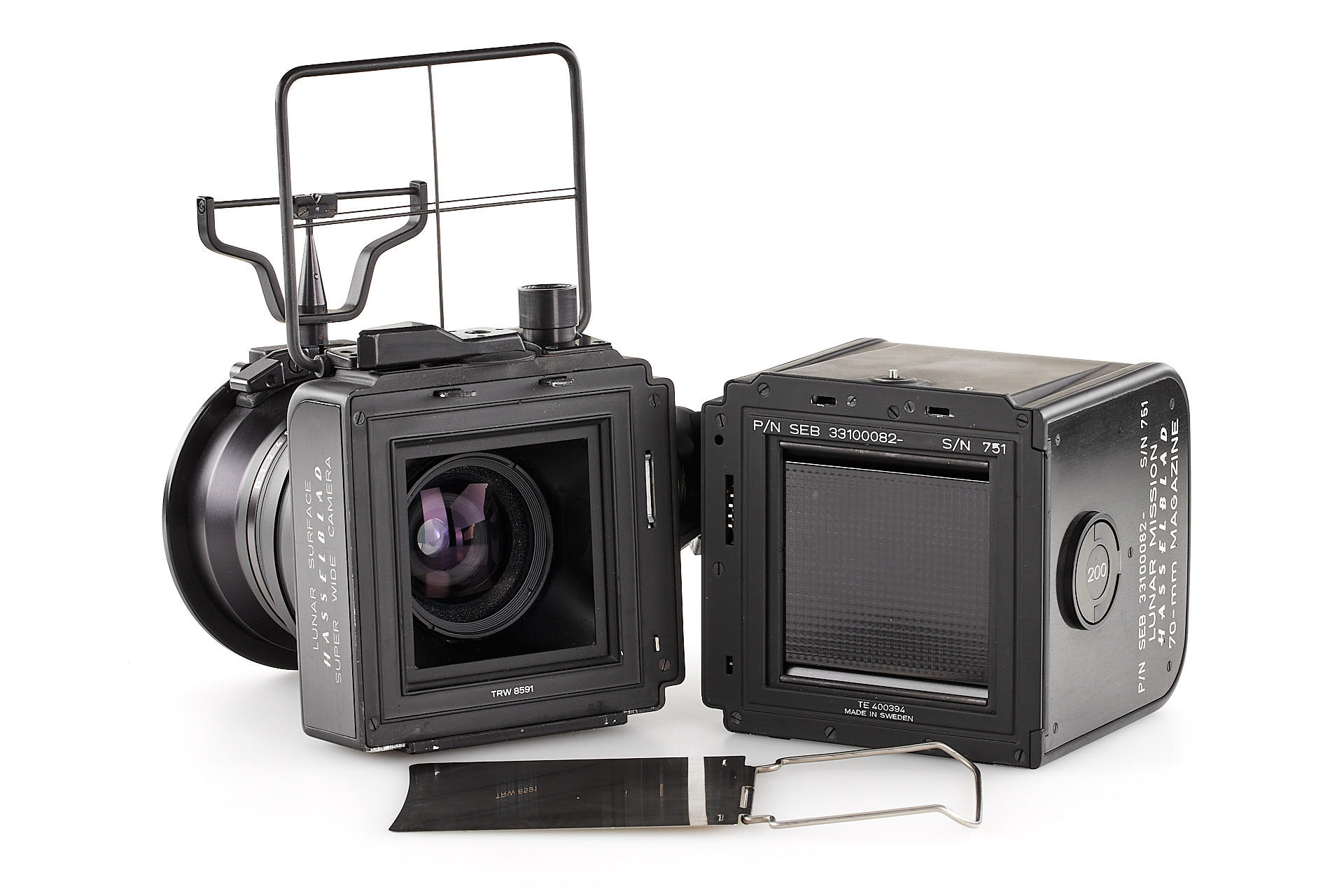 In the spring of 1967, a strong partnership led NASA and Hasselblad to build the camera that would be used to take photographs on the Moon. The result was an SWC equipped with a big frame finder, stronger shutter and larger release button, a big film winder, a magazine catch and a lightweight magazine altered to take 200 pictures on 70 mm perforated film. Unfortunately, this lunar SWC was abandoned: NASA preferred to choose, following astronauts' input, a Hasselblad 500 EL, easier to use on the surface of the Moon because space suits limit astronauts' movements. Only around 25 SWC Lunar Surface cameras have been made. The offered camera is in excellent condition and in good working order, with Biogon 4.5/38mm no.4241554, special ultra-light 70mm magazine Lunar Mission no. TE400394 (NASA number P/N SEB 33100082-S/N 751) - a rare find from the history of space exploration!
