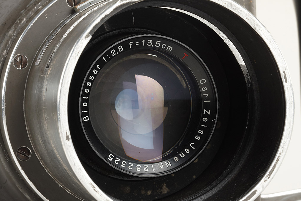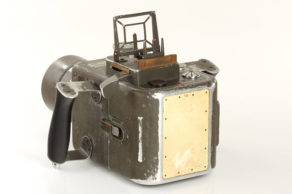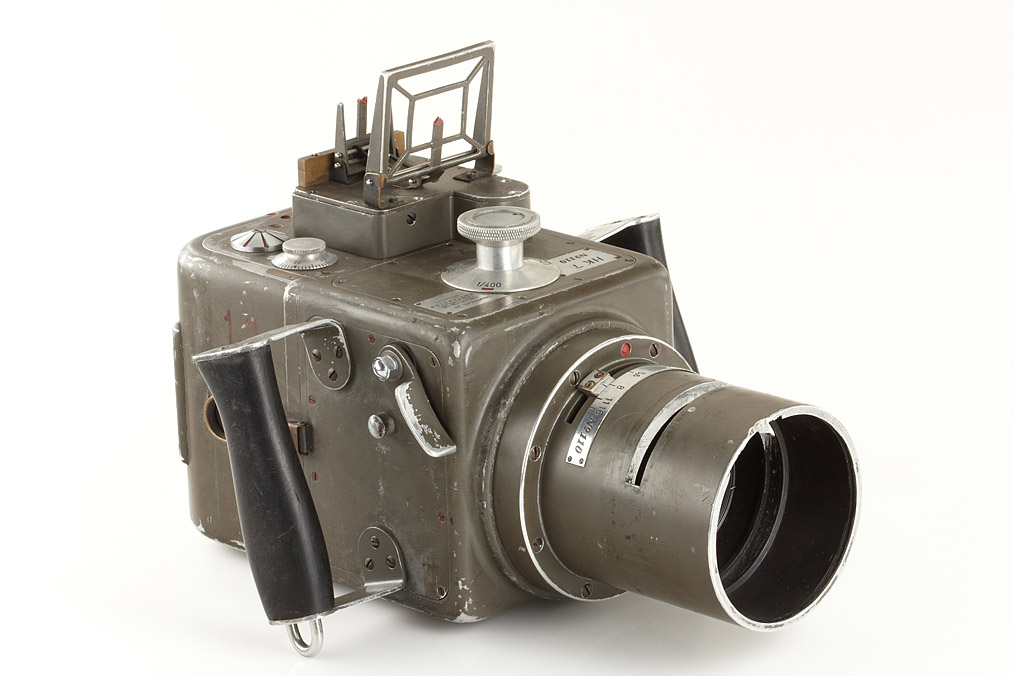 historically important first camera manufactured by Viktor Hasselblad, a military aerial camera for 80mm perforated film, format 7x9cm, Biotessar 2.8/13.5cm T no.1232325, cap, wooden outfit case marked:110