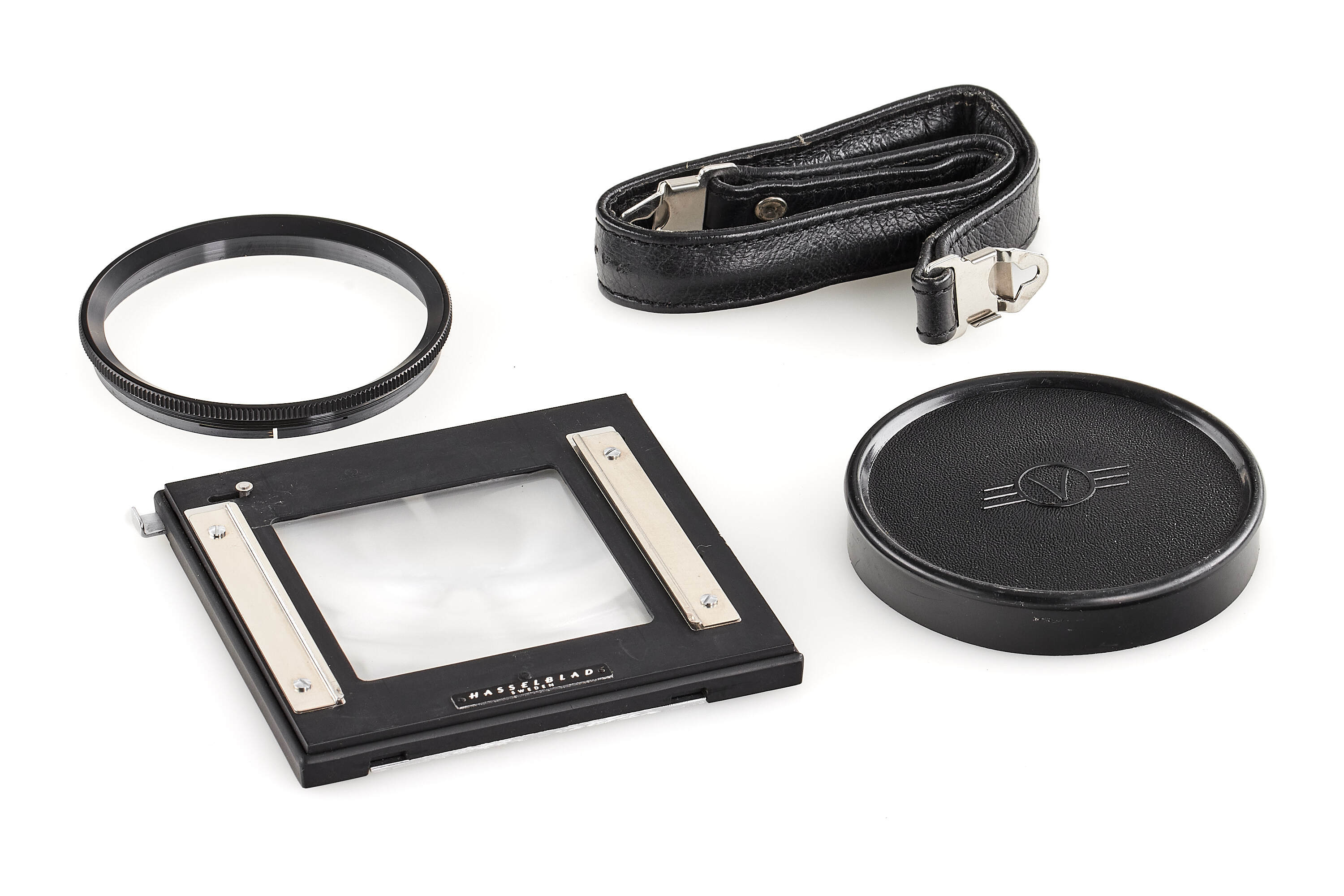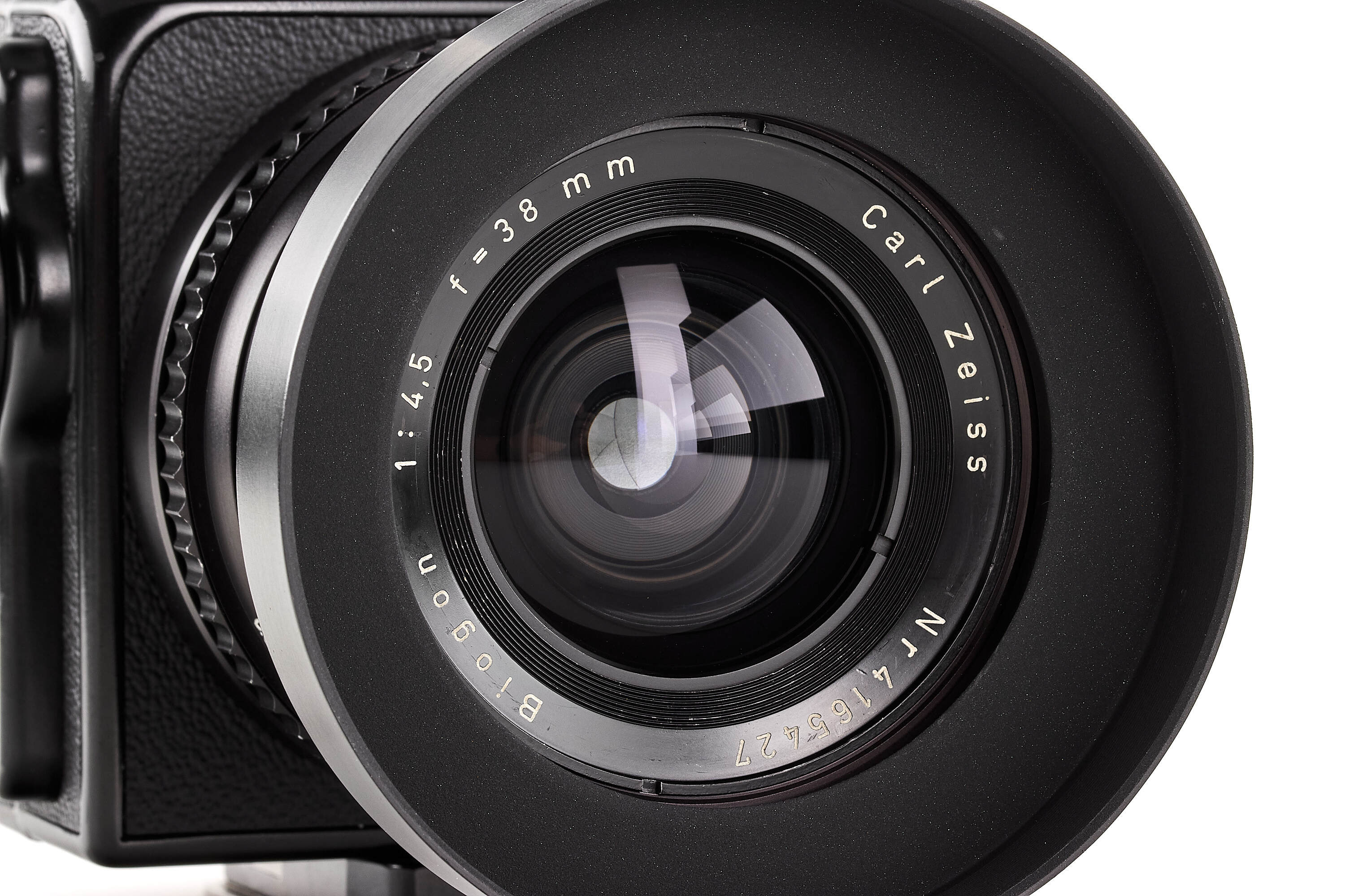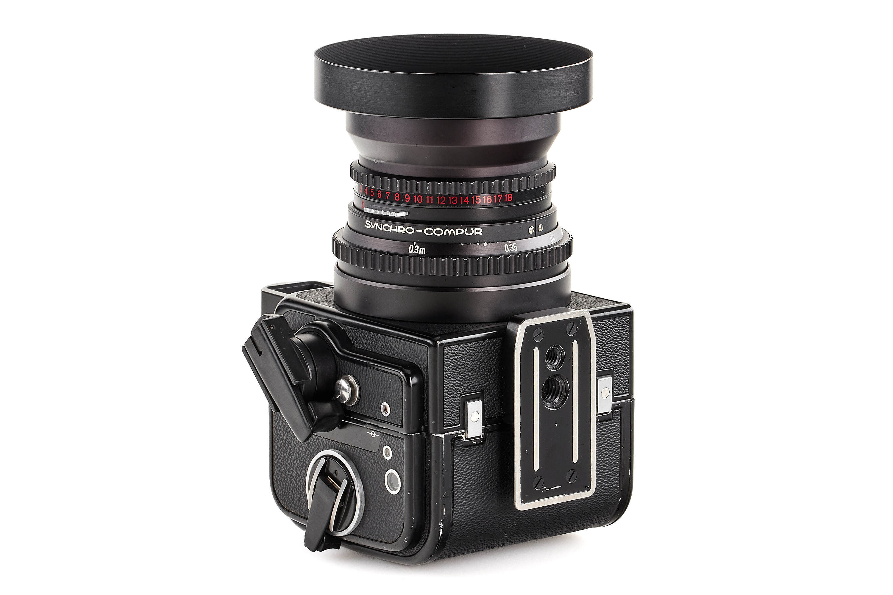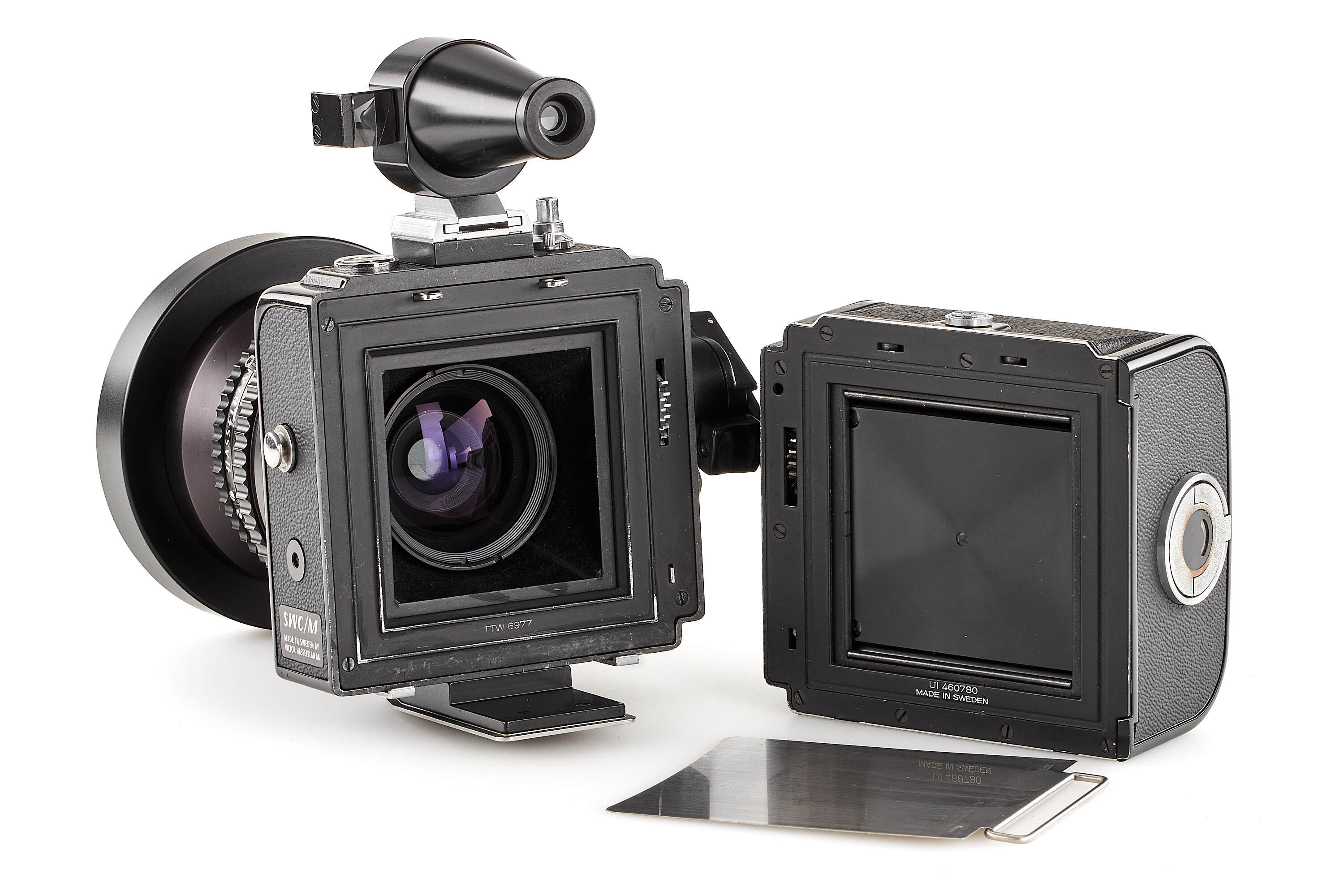 Very interesting wide angle Hasselblad in almost mint condition, originally a SWC from 1966 with matching black Biogon 4.5/38mm (not T*) no.4165427, good optics with minimal cleaning marks, most probably upgraded to a later (c.1980) black SWC/M housing (!), note the original serial number no.TTW6977, together with finder, filter holder, front lens cap, hood (maker's box), leather strap, focusing screen and black A12 magazine no.UI460780 (cond. B/A).