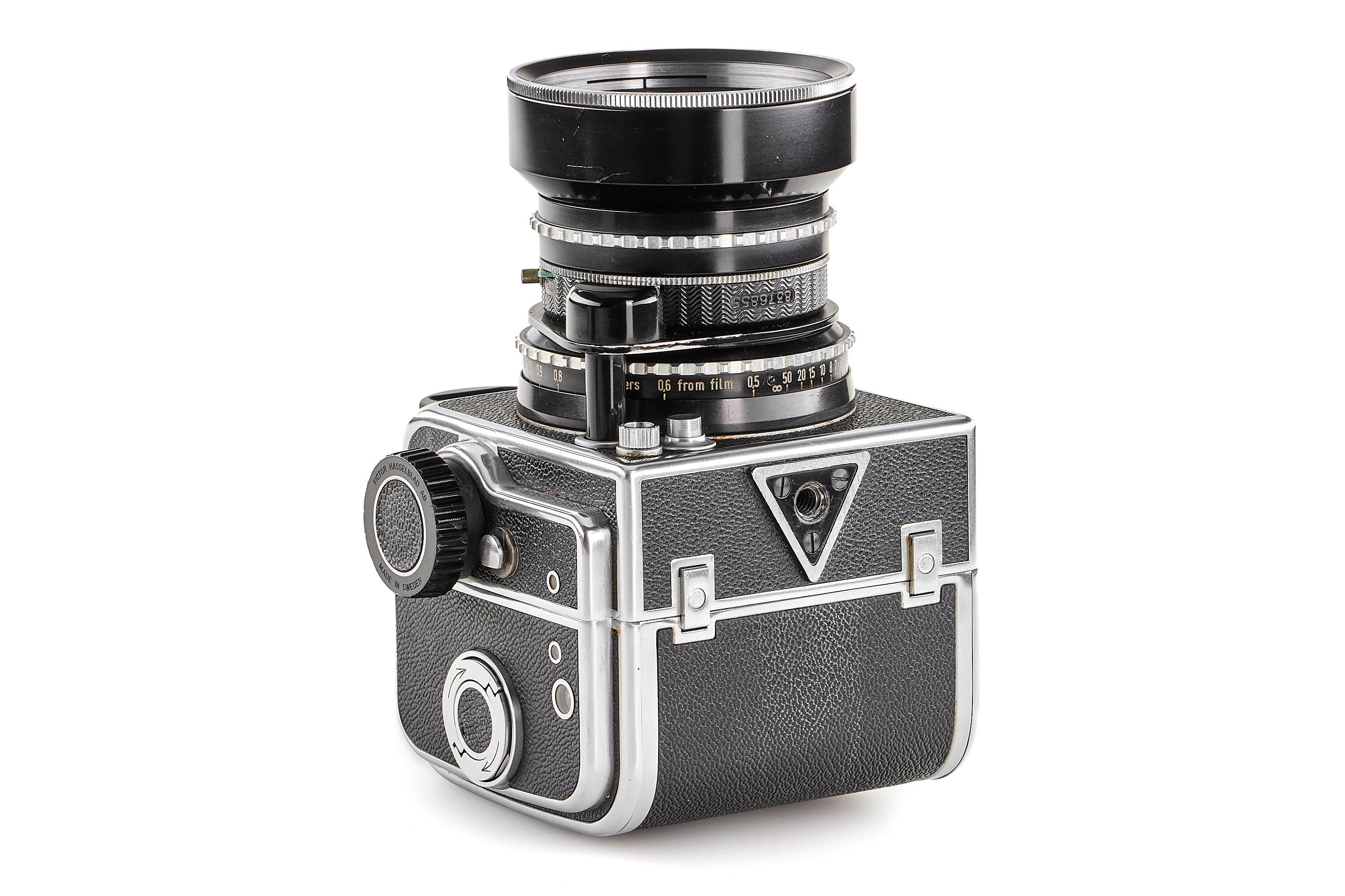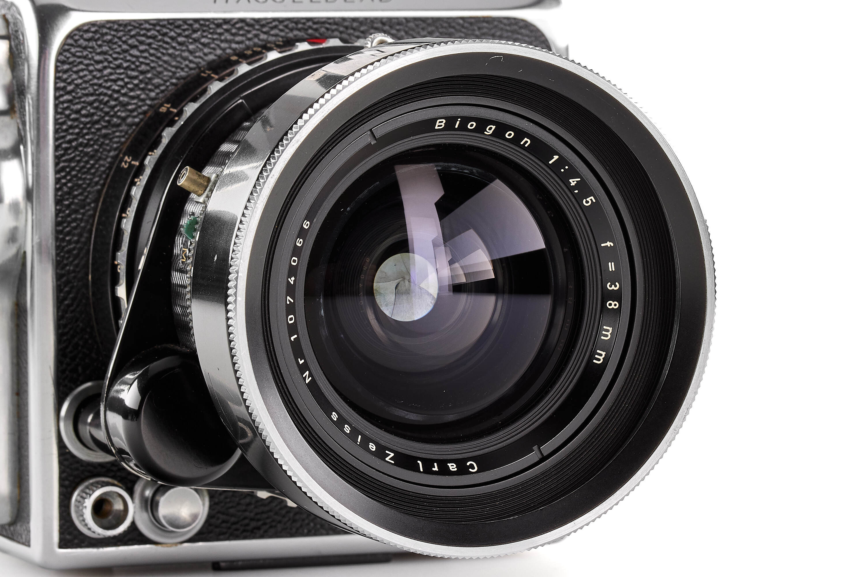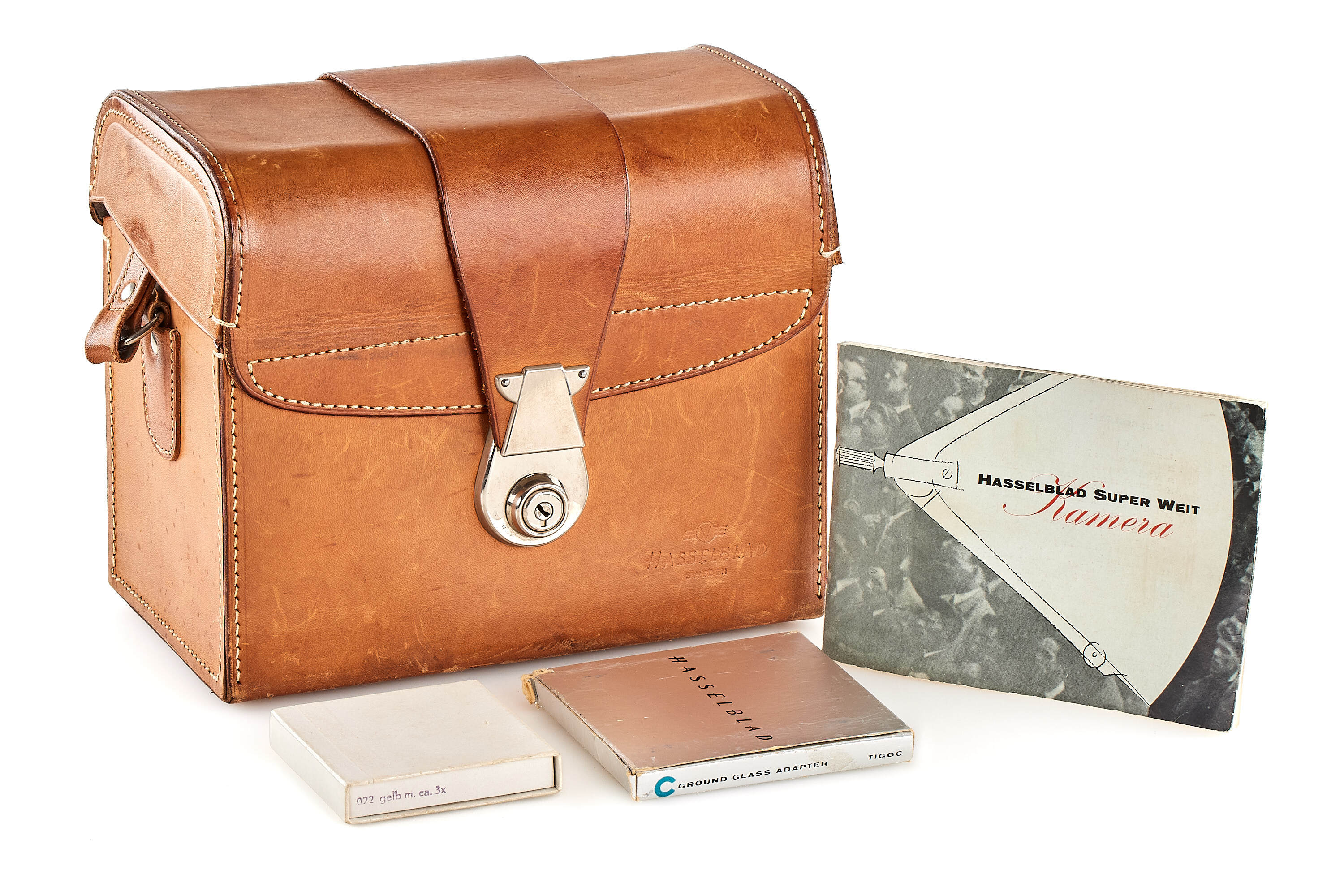 Extremely early first version Superwide, the 47th ever produced, in outstanding, mint condition, with Biogon 4.5/38mm no.1074066, clean and clear optics, with original finder, yellow filter (maker's box), original Aluminium front lens cap, ground glass adapter, 2x early magazines nos.CC23756 and CT26557, original German instructions and leather outfit leather case (with key).