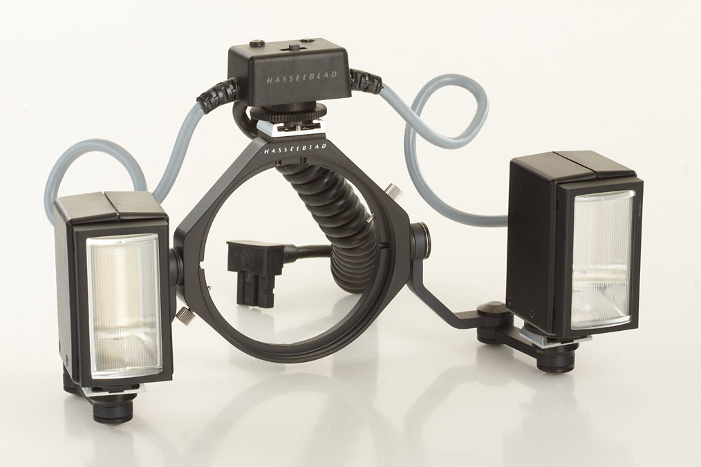(1) Macro flash unit 51678 with instructions in maker's box, (2) Macro Flash Bracket 50-70 51657 in maker's box, (3) Flash adapter SCA 390 51681 in maker's box, (4) Linear Mirror Unit TIBAC in maker's box, (5) Professional Lens Shade 40231 in maker's box, (6) Platform Gunstock 45063 in maker's box - all in mint condition (6)