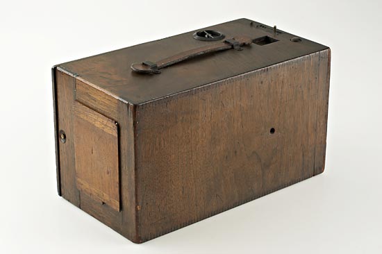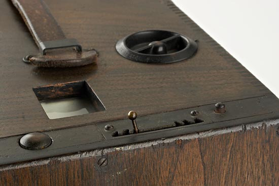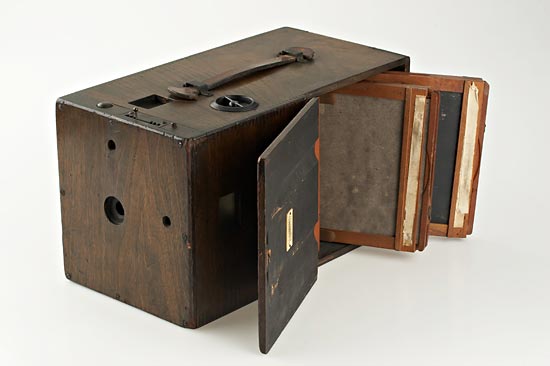 Improved Model, Blair Camera Co., for 4x5" exposures on dry-plates, Boston, U.S.A., the walnut body stamped on the interior with "Patented March 29 "87, May 20 "90", with single-element lens behind three-speed shutter, knob at top calibrated from 6 to 100 feet focusing internal bellows, flap at side opening to reveal ground-glass focusing screen and storage space for three block-form double plate holders. with two plate holders each stamped in ink "Patented, May 15, "83. Removable panel at back for viewing focusing screen. Two waist-level viewfinders. The ground-glass screen was removable for use with an optional 100 exposure roll-film holder. Ex Spira Collection.