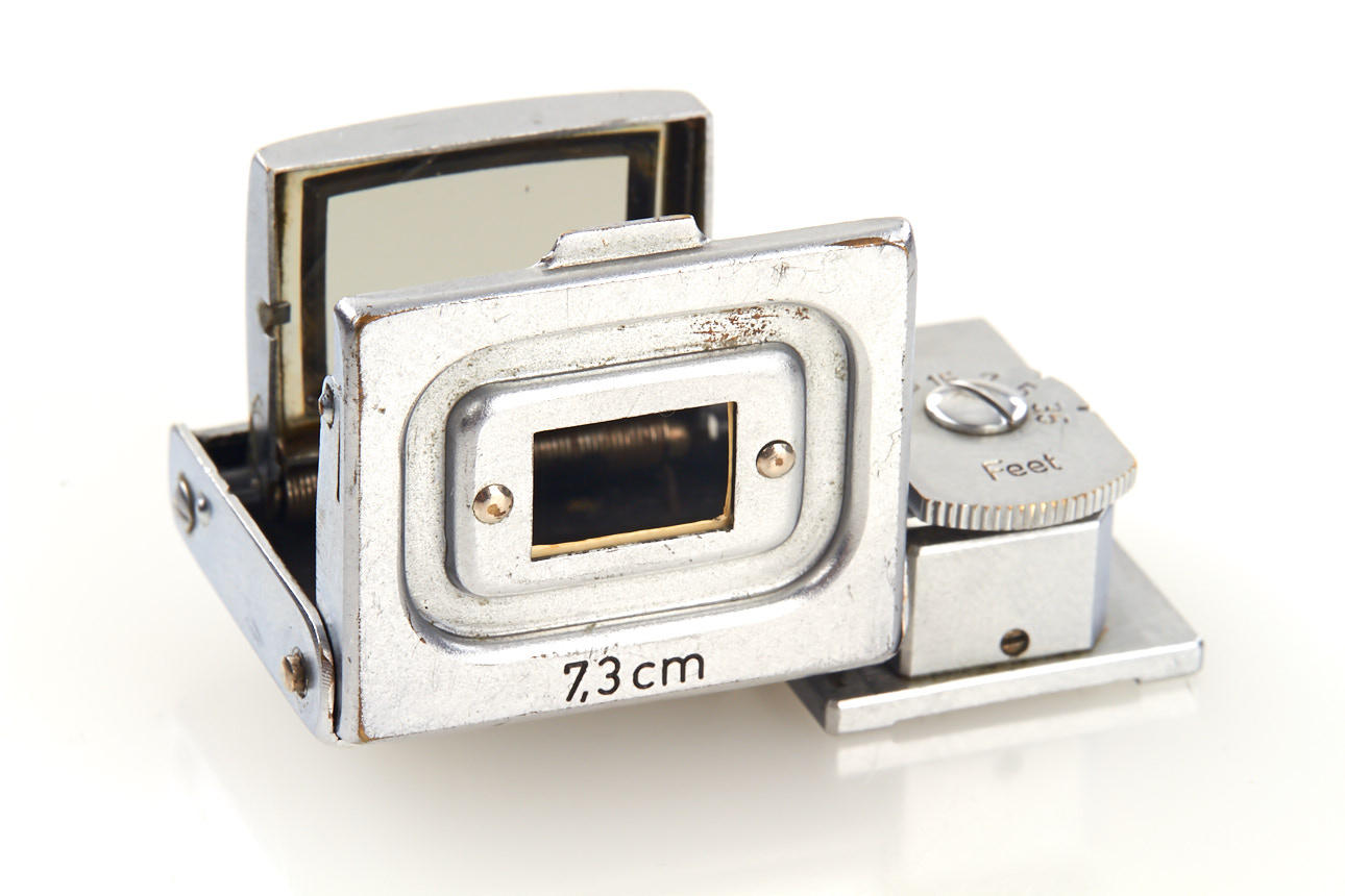 HEGRA in beautiful condition, good optics, only minimal cleaning marks, with FGHOO hood and both caps, with very rare 7.3cm folding finder SOOAW (mint in red maker's box) - both lens and finder in Feet