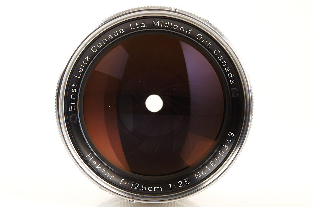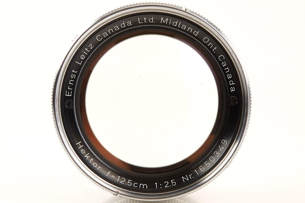 like new, late Midland lens, with perfect clean optics, complete with caps, hood, UVa filter, very uncommon red maker's box marked 'Leitz Canada Hektor f=12,5cm 1:2,5 HIKOO' with matching number