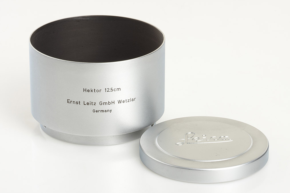 clean Wetzlar Hektor for Visoflex with both caps, hood, leather case with original E. Leitz New York maker's box