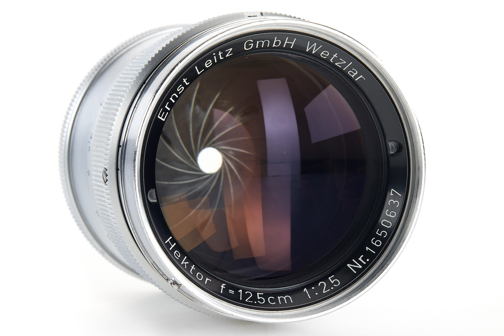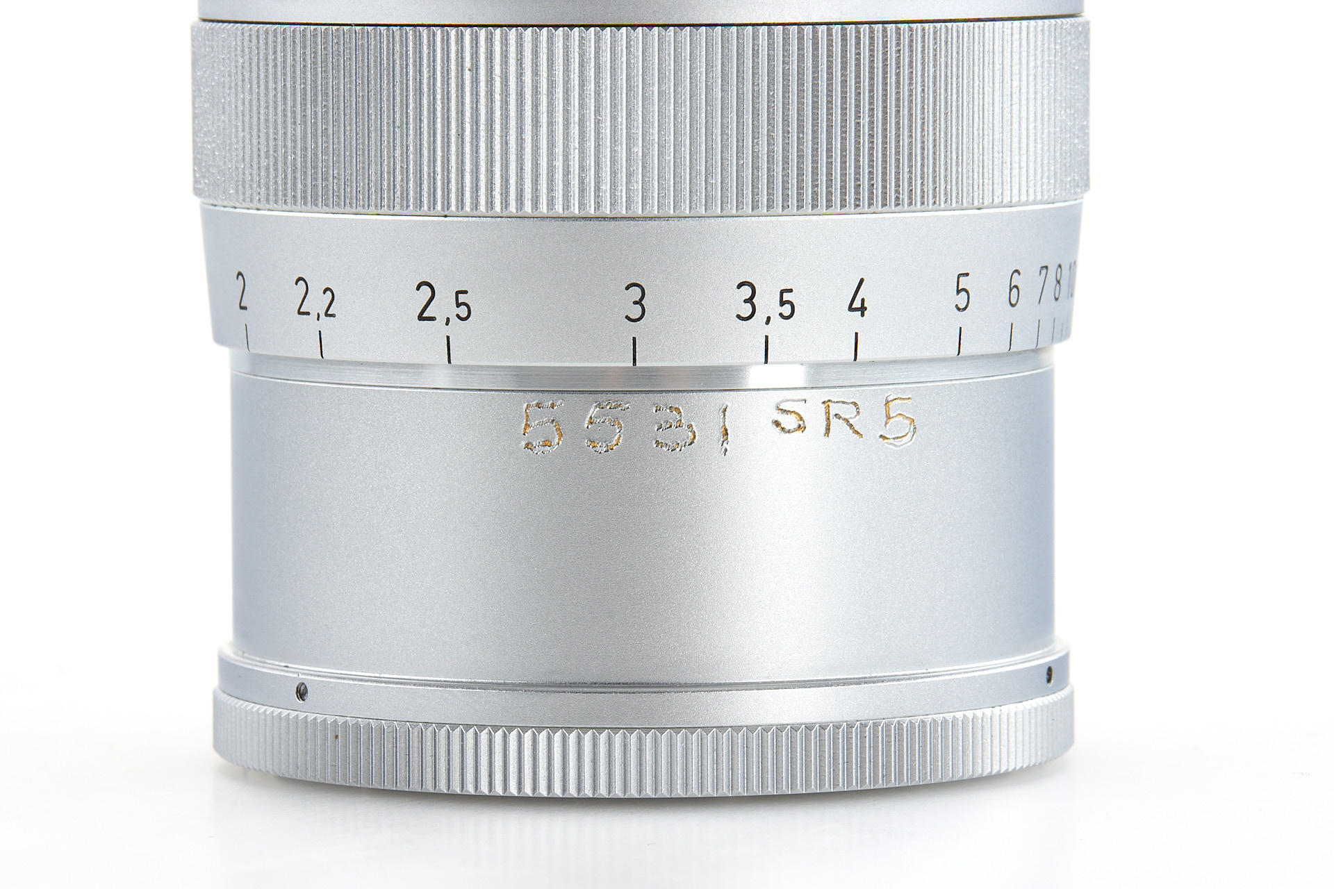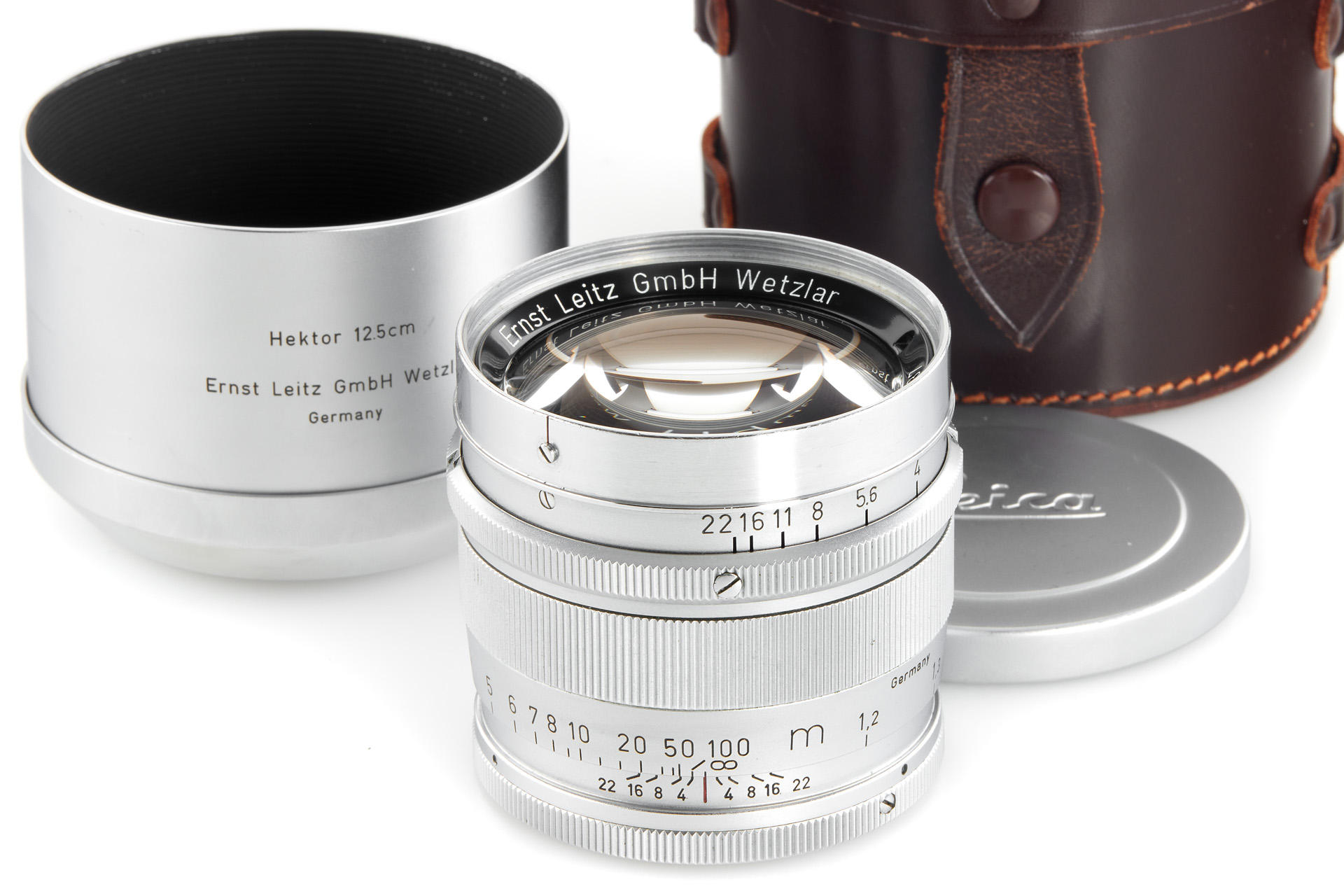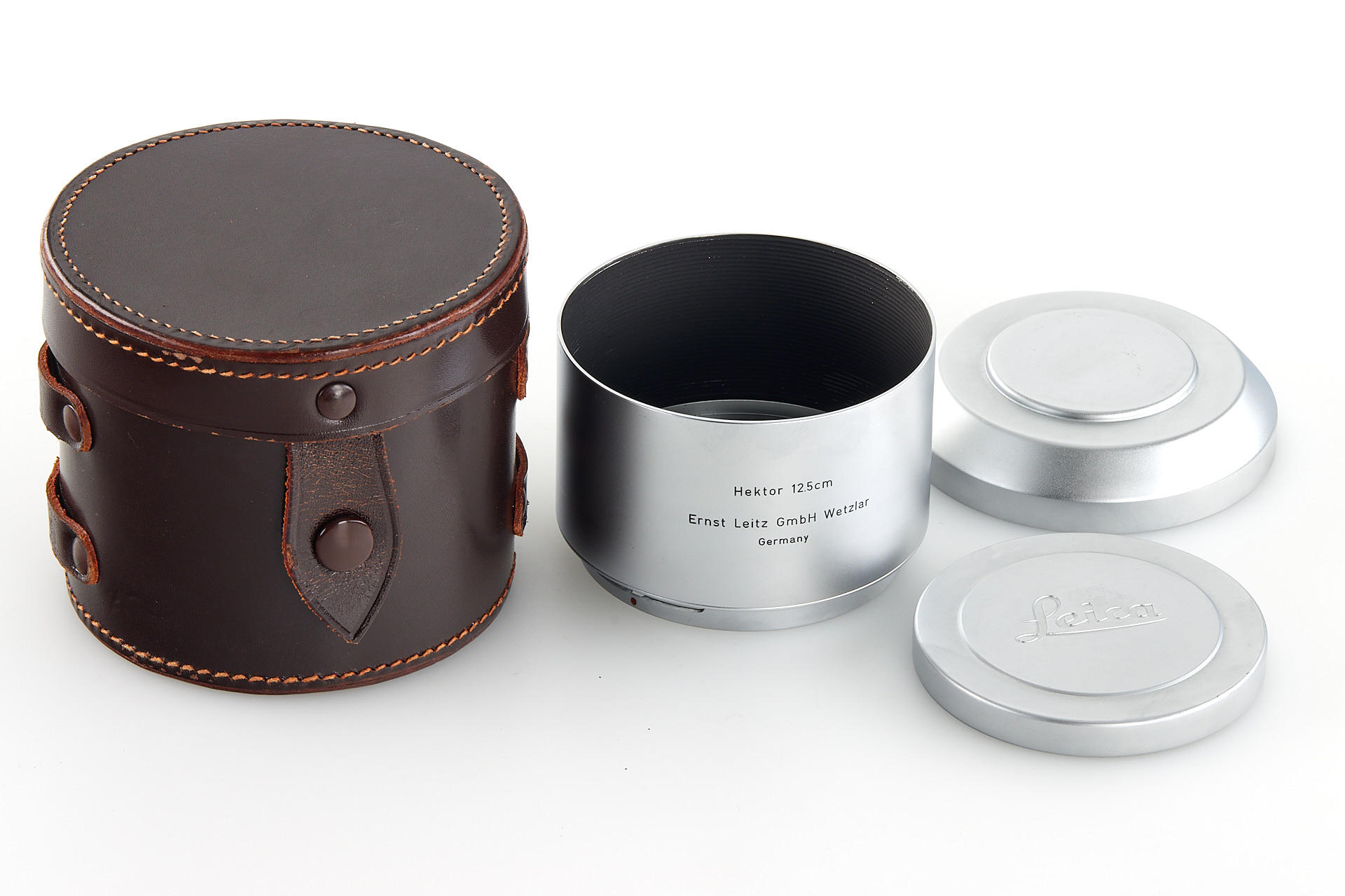 late Hektor for Visoflex, in near mint condition, optics slightly hazy, hand-engraved on the barrel '5531SR5', complete with hood, both caps and leather keeper