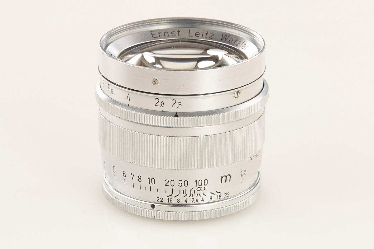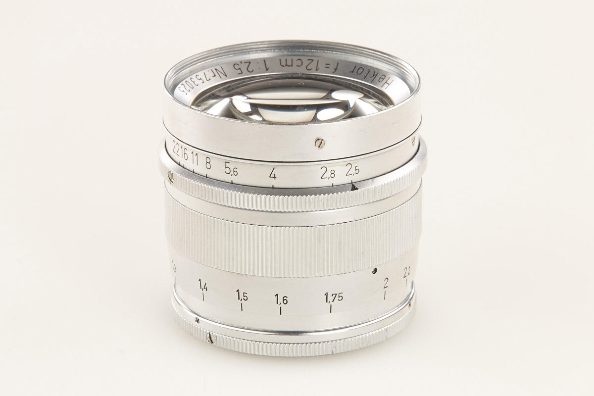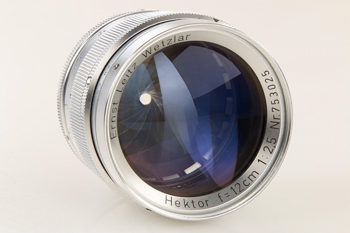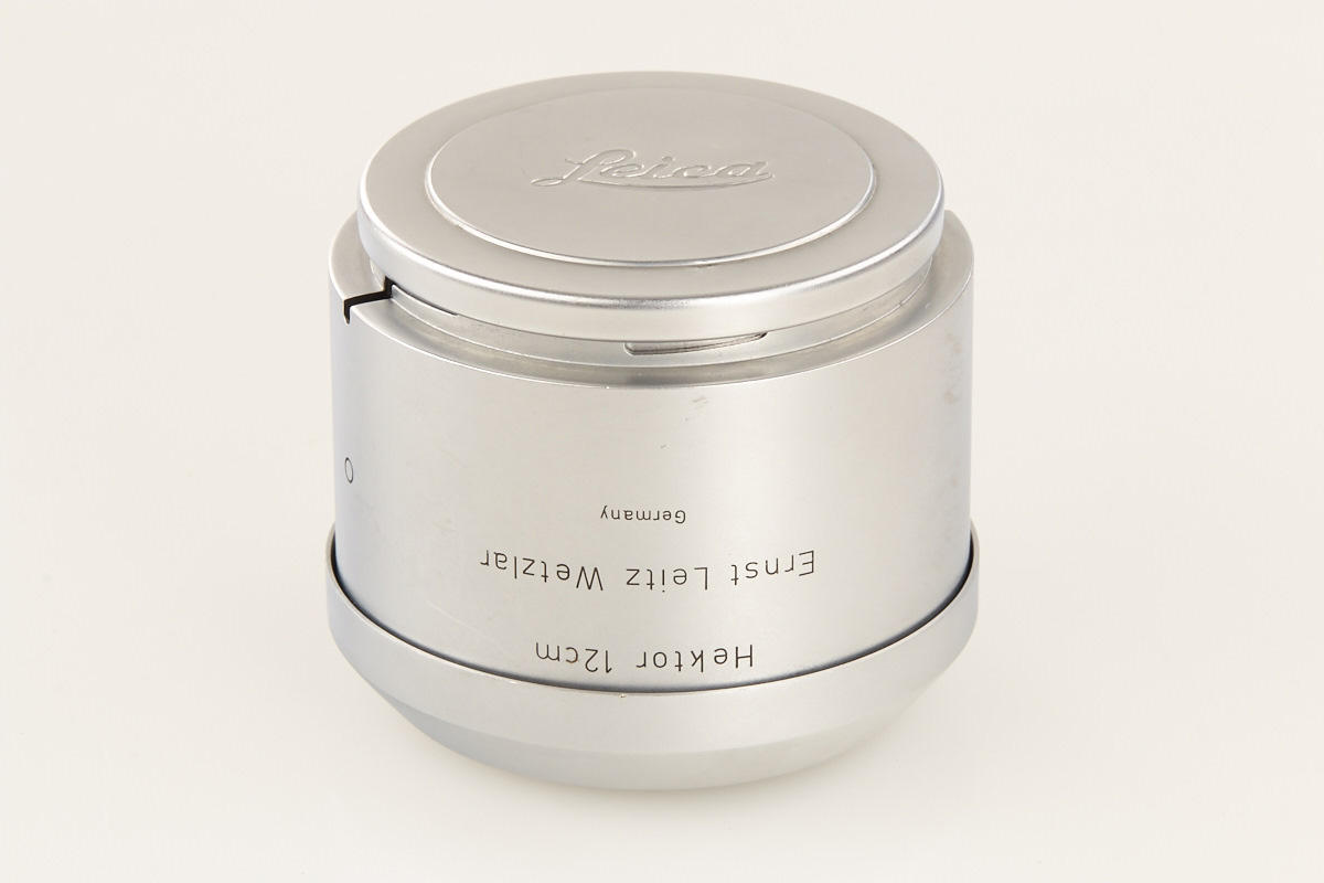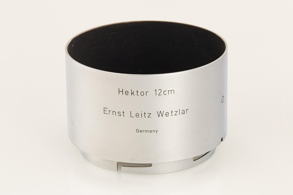 prototype lens of the later 12.5cm Hektor, extremely rare with original hood engraved 'Hektor 12cm, Ernst Leitz Wetzlar Germany', caps, keeper, this lens was acquired by the previous owner from the Leitz factory photographer Liesel Springmann, see: Lager II page 93, Wilhelm Albert "Geburtstage der Leitz-Foto-Konstruktionen ab 1927", page 162, "10 Jahre Leica Historica Beiträge zur Geschichte der Leica", pages 100-101 for this lens, including prototype 12cm sports finder with cut-outs - ex Bawendi collection