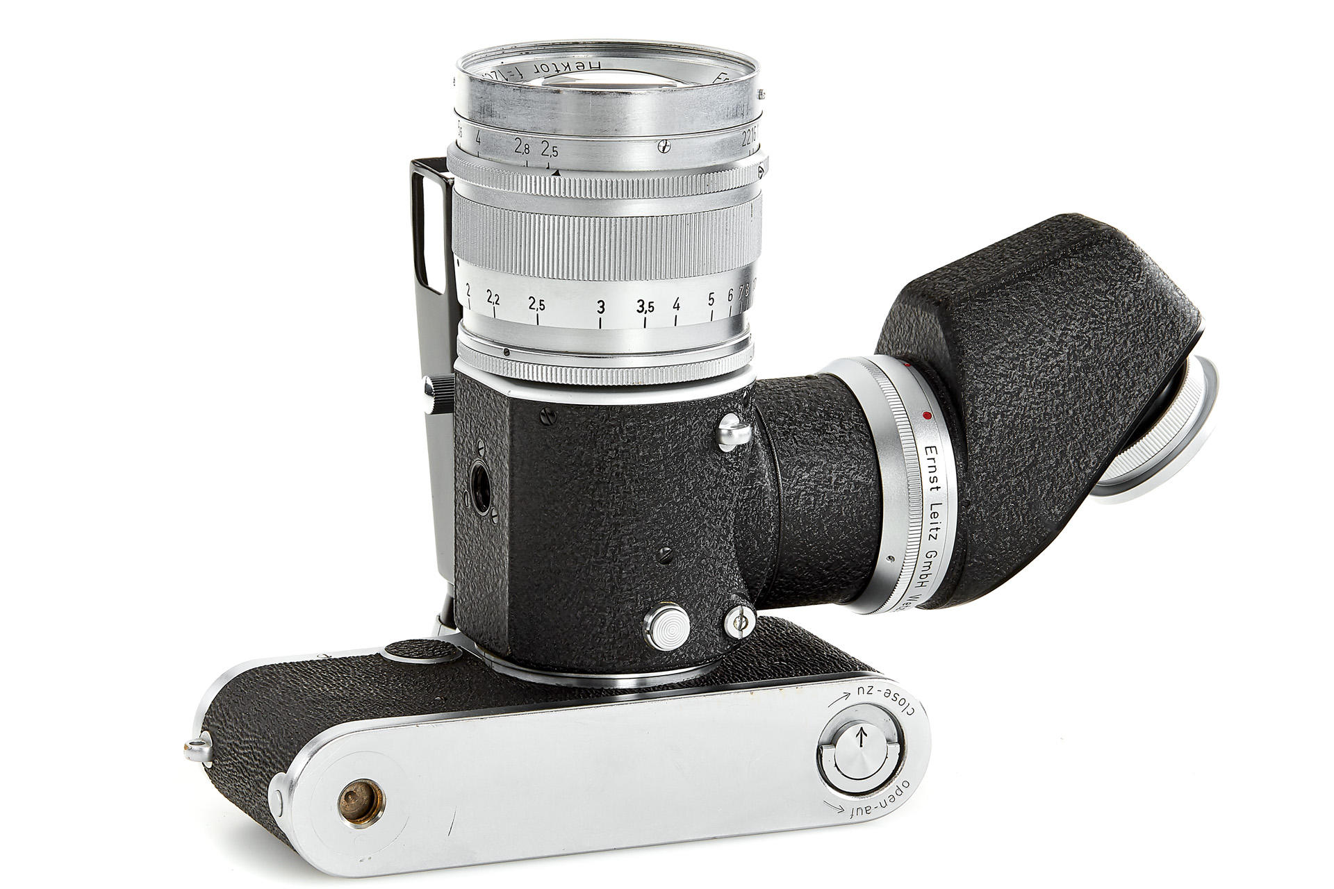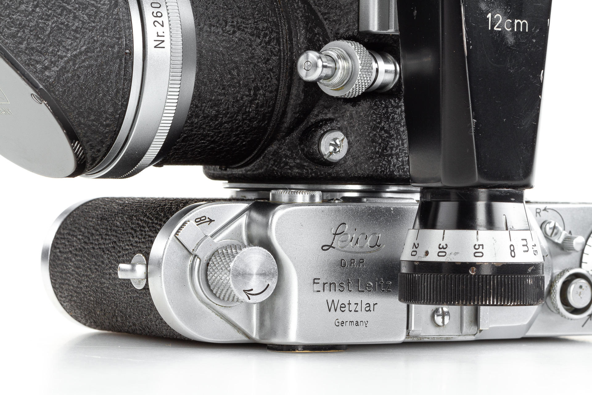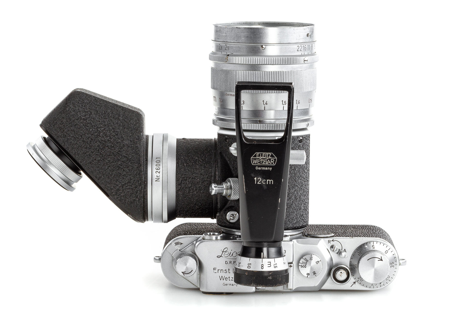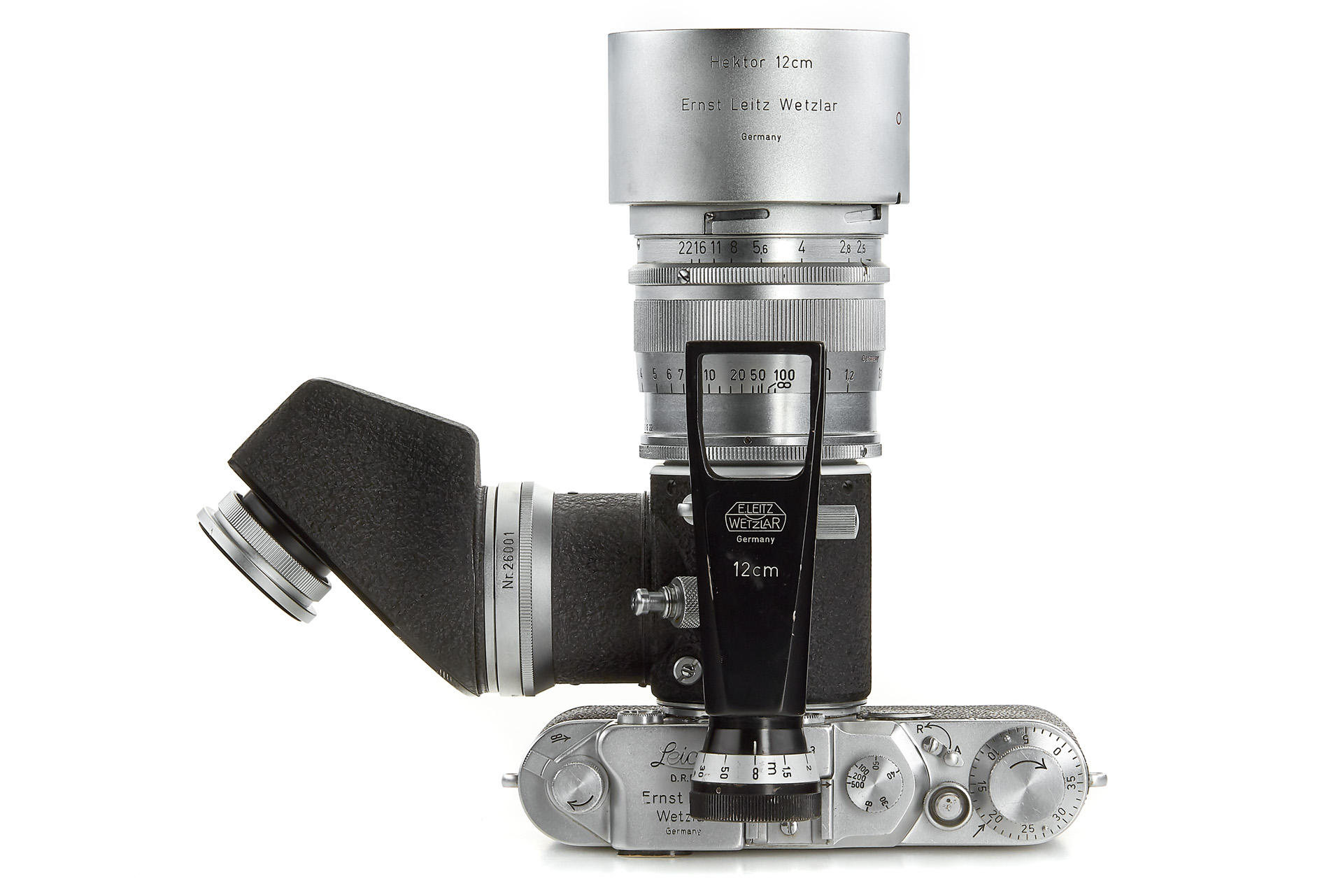 an extremely rare high-speed telephoto lens, from a small batch of only 14 lenses issued for testing purposes in 1949 (all later production lenses were 12.5cm), designed to work with Visoflex I, also usable on Visoflex II with the OUBIO extension tube, here in a set with matching near-mint hood engraved with 'Hektor 12cm, Ernst Leitz Wetzlar, Germany' and 12cm prototype frame finder. Also included in this lot is a Visoflex I with 45° finder and a Leica IIc no.433633. The 12cm Hektor is one of the rarest Leica lenses, and this is one of the best examples known to exist.
