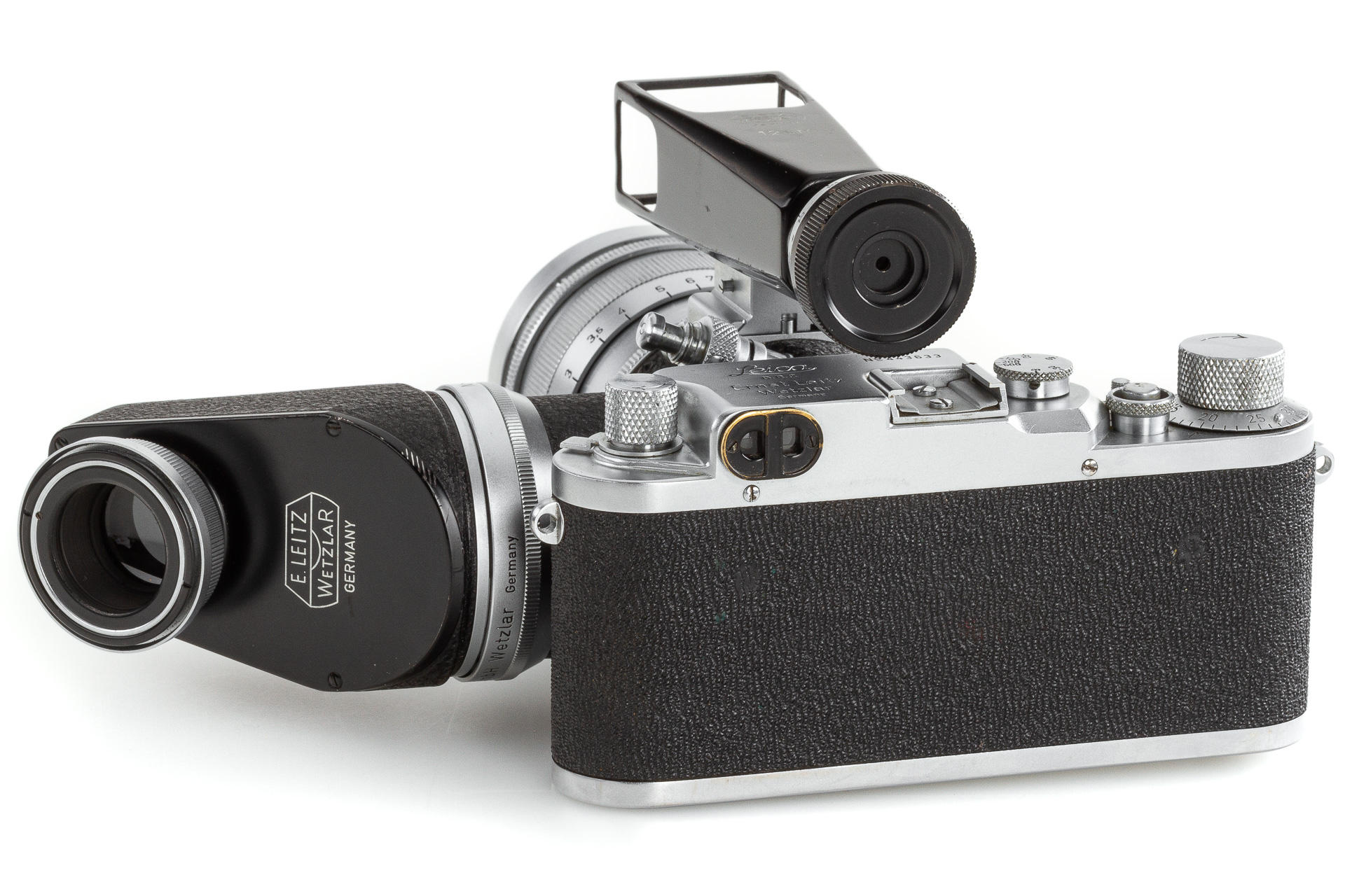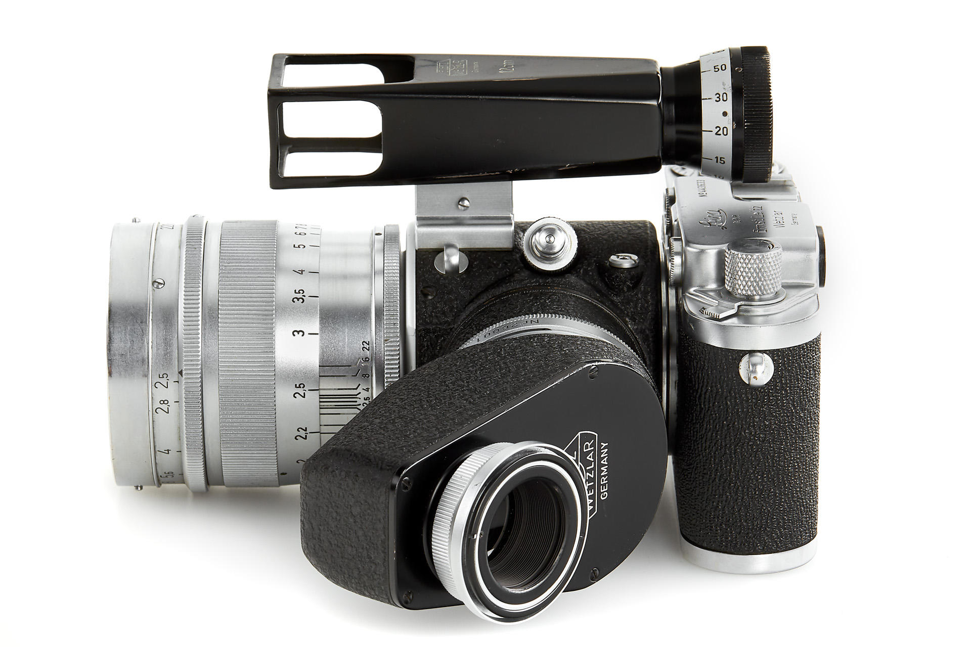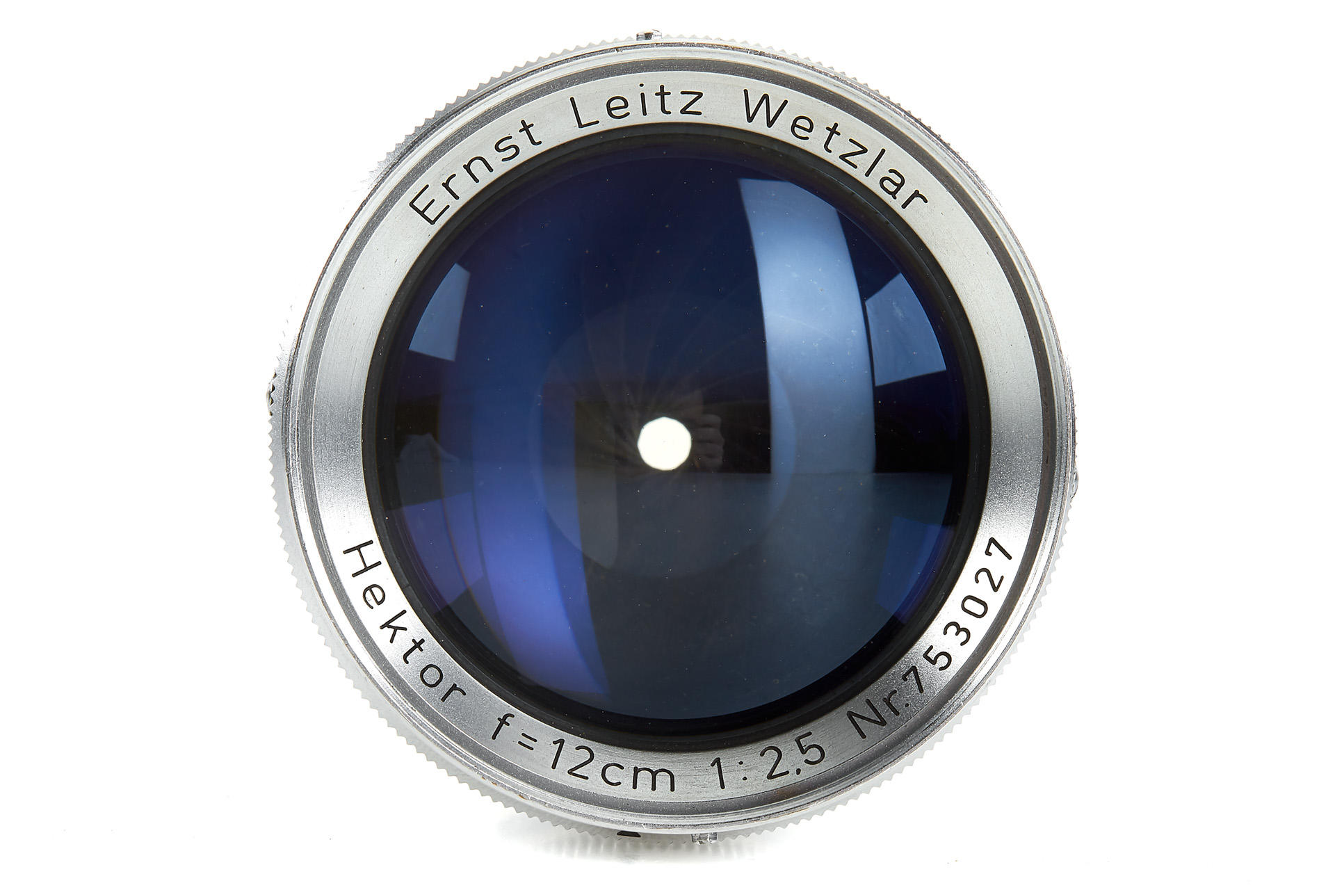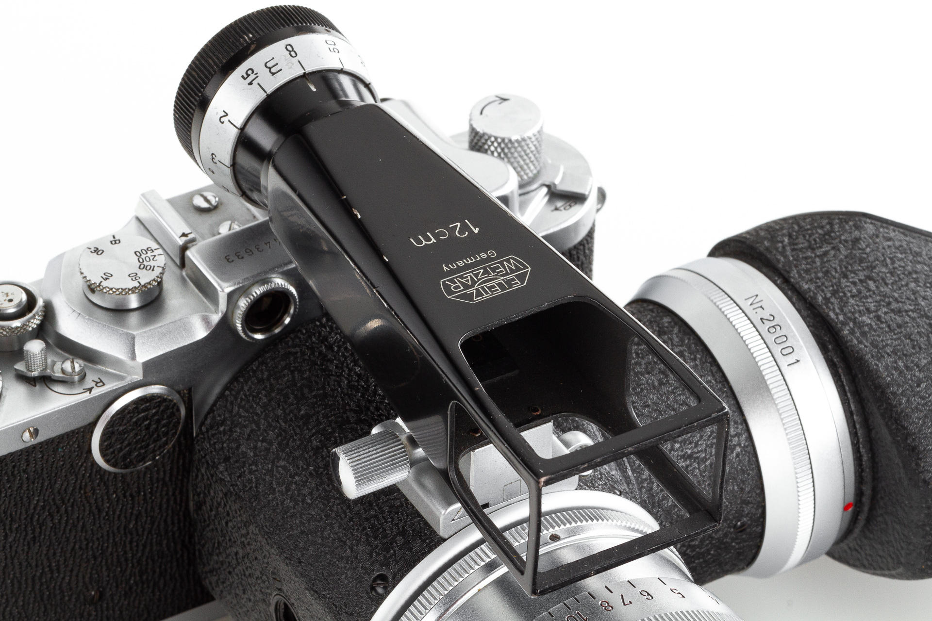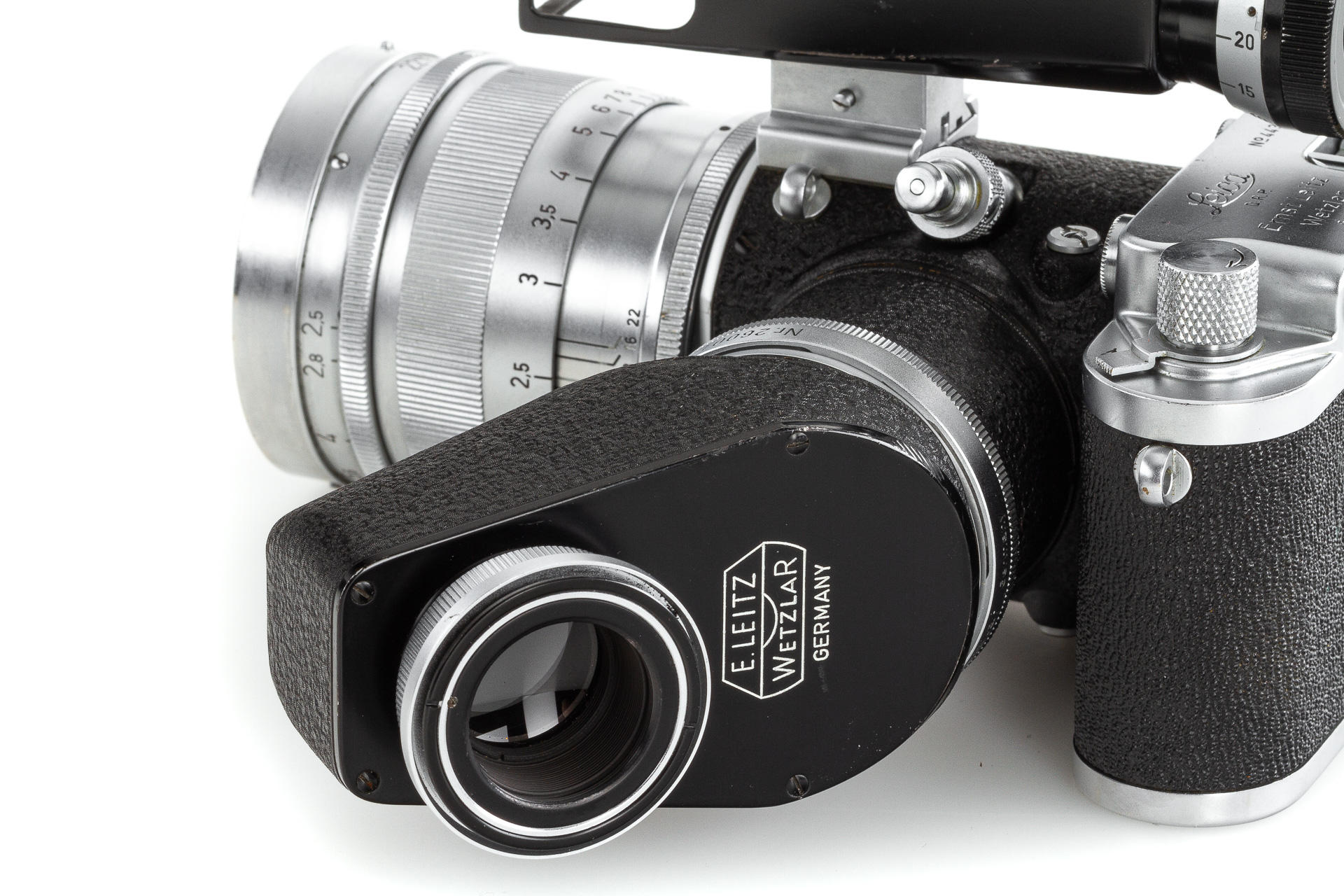 an extremely rare high-speed telephoto lens, from a small batch of only 14 lenses issued for testing purposes in 1949 (all later production lenses were 12.5cm), designed to work with Visoflex I, also usable on Visoflex II with the OUBIO extension tube, here in a set with matching near-mint hood engraved with 'Hektor 12cm, Ernst Leitz Wetzlar, Germany' and 12cm prototype frame finder. Also included in this lot is a Visoflex I with 45° finder and a Leica IIc no.433633. The 12cm Hektor is one of the rarest Leica lenses, and this is one of the best examples known to exist.