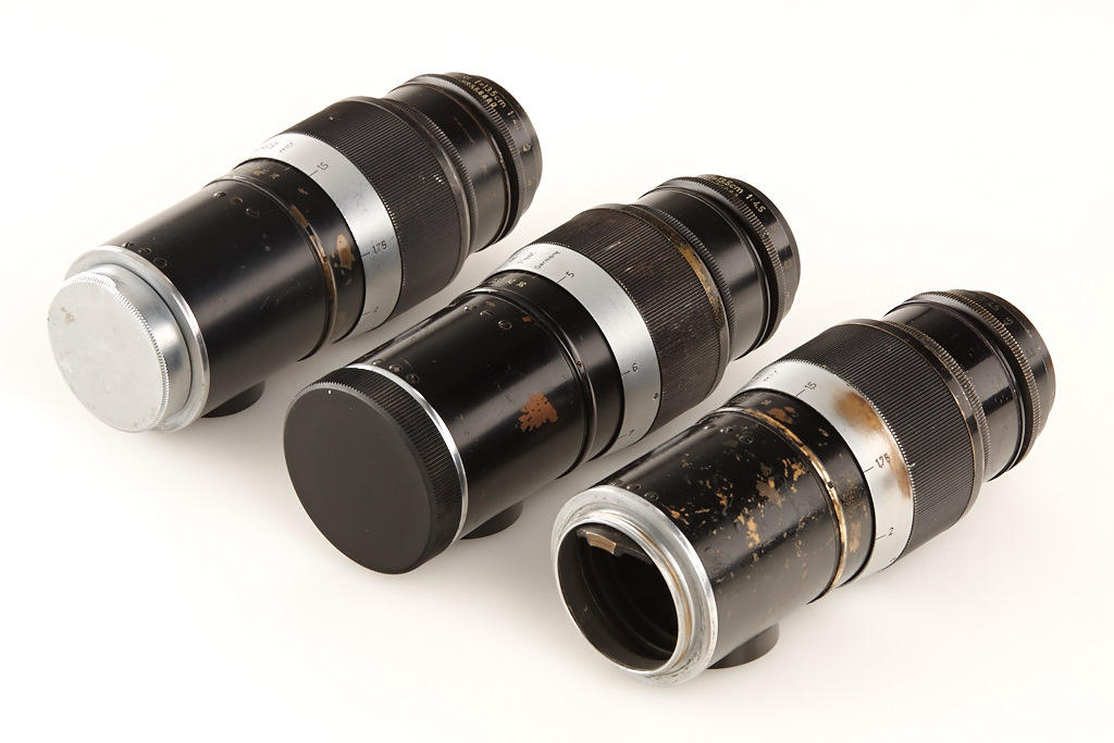 set of three black/chrome war-time lenses, (1) no.558633, meter scale, cond.C, (2) no.558880, meter scale, cap, cond.B+, (3) no.575983, feet scale, caps, keeper, cond.B (3)