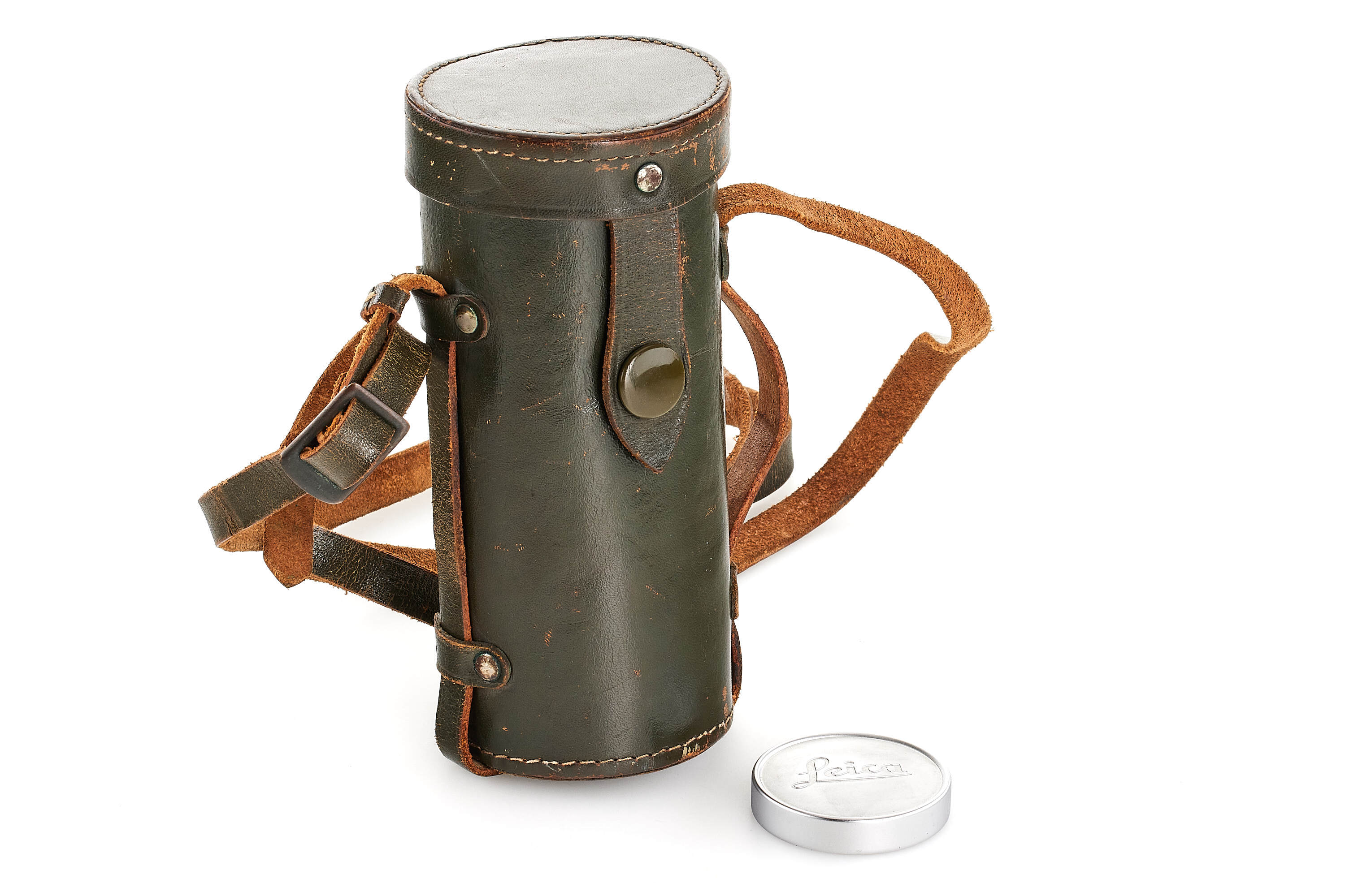 Very rare original German military Hektor engraved 'Bundeseigentum' and inventory number '12-120-1625' on the barrel, meter scale, green vulcanite covering with coarse pattern (matching the vulcanite on the early olive M3 and M1 cameras), in very good condition, optics showing some light cleaning marks, with both caps and rare original green leather case with military engravings 'Bundeseigentum 12-129-7740' on the bottom.