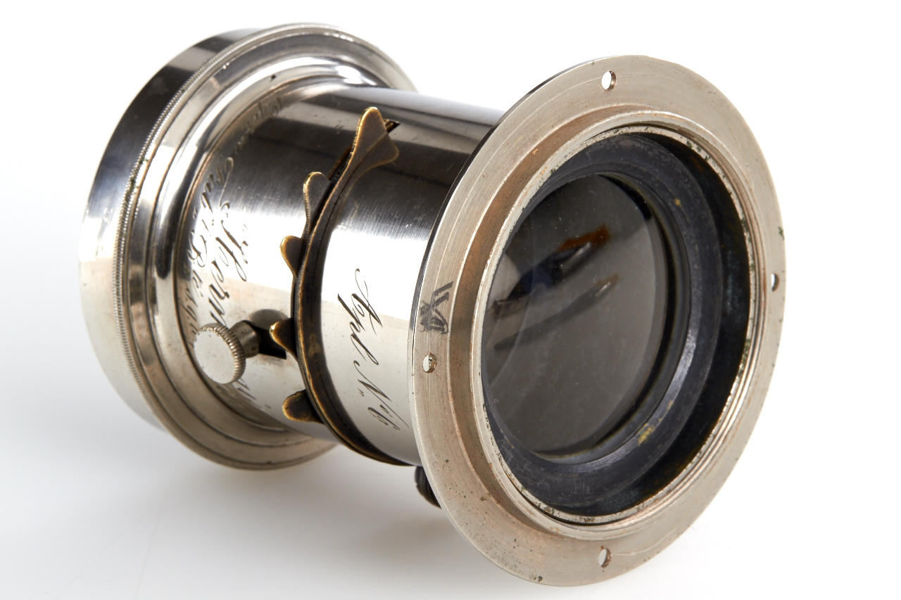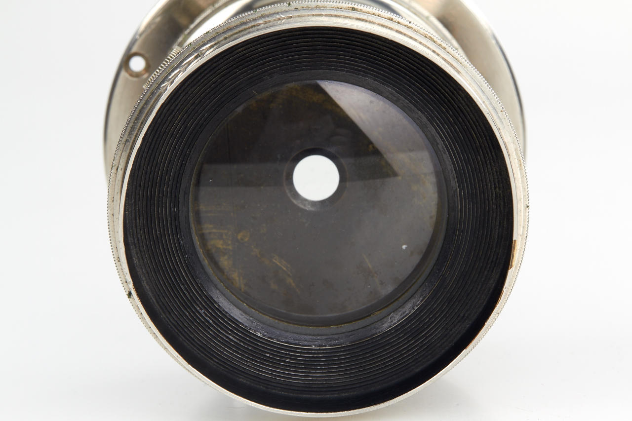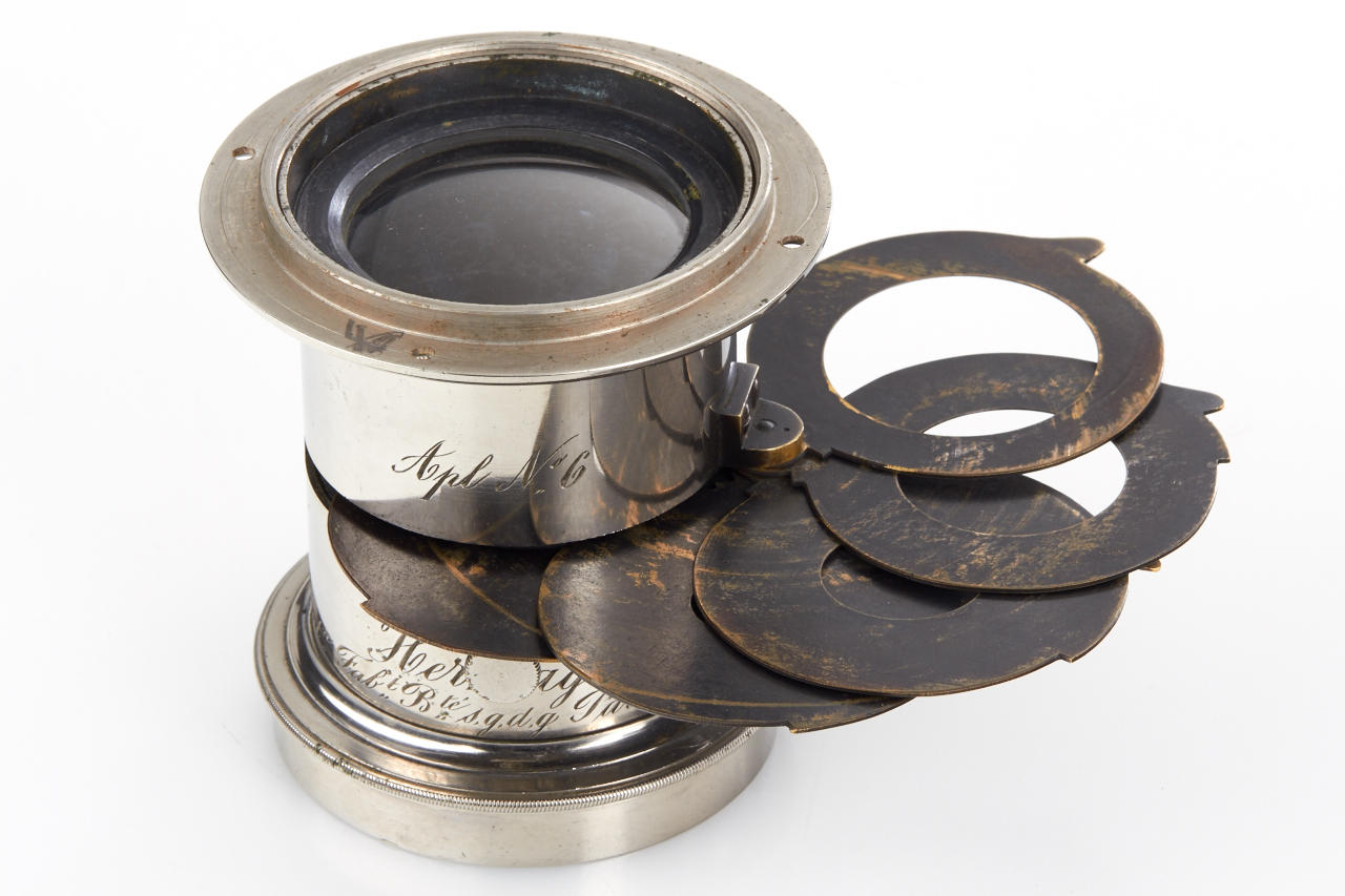 two chromed brass lenses with 5 coherent diaphragms, approx. 30cm focal length, engraved 'Apl No.6', serial '21692 and 19895' with mounting ring, total height 8cm, glass diameter front and rear c.4cm