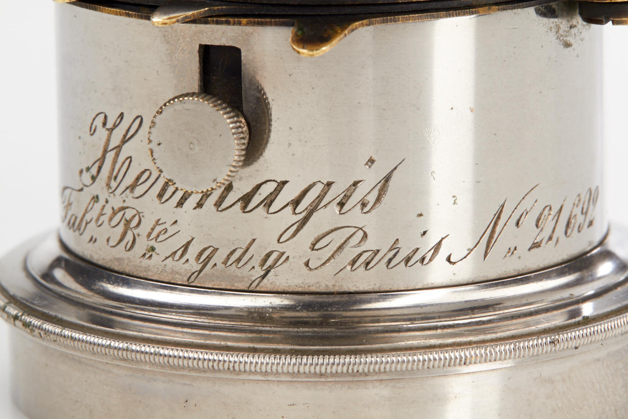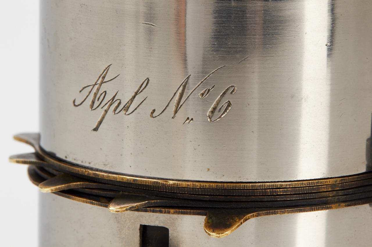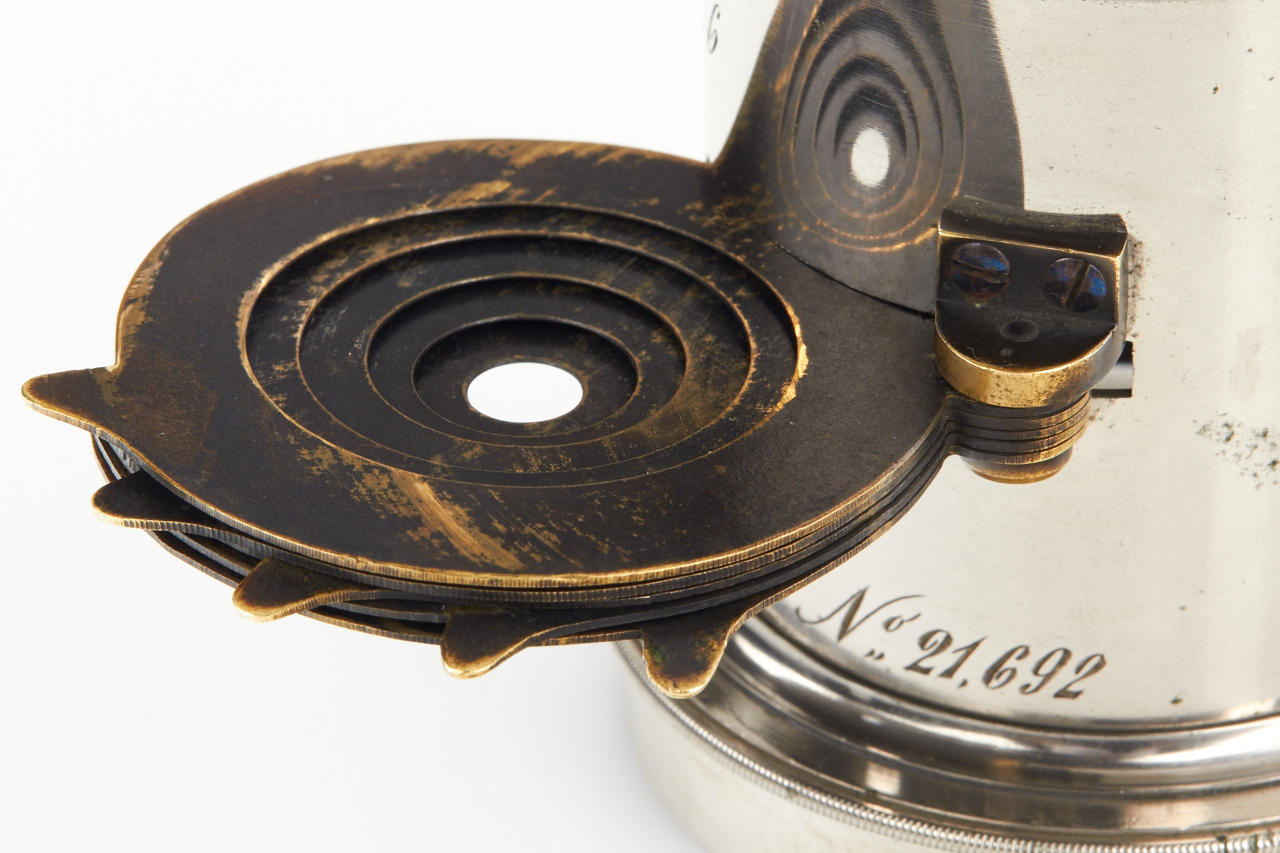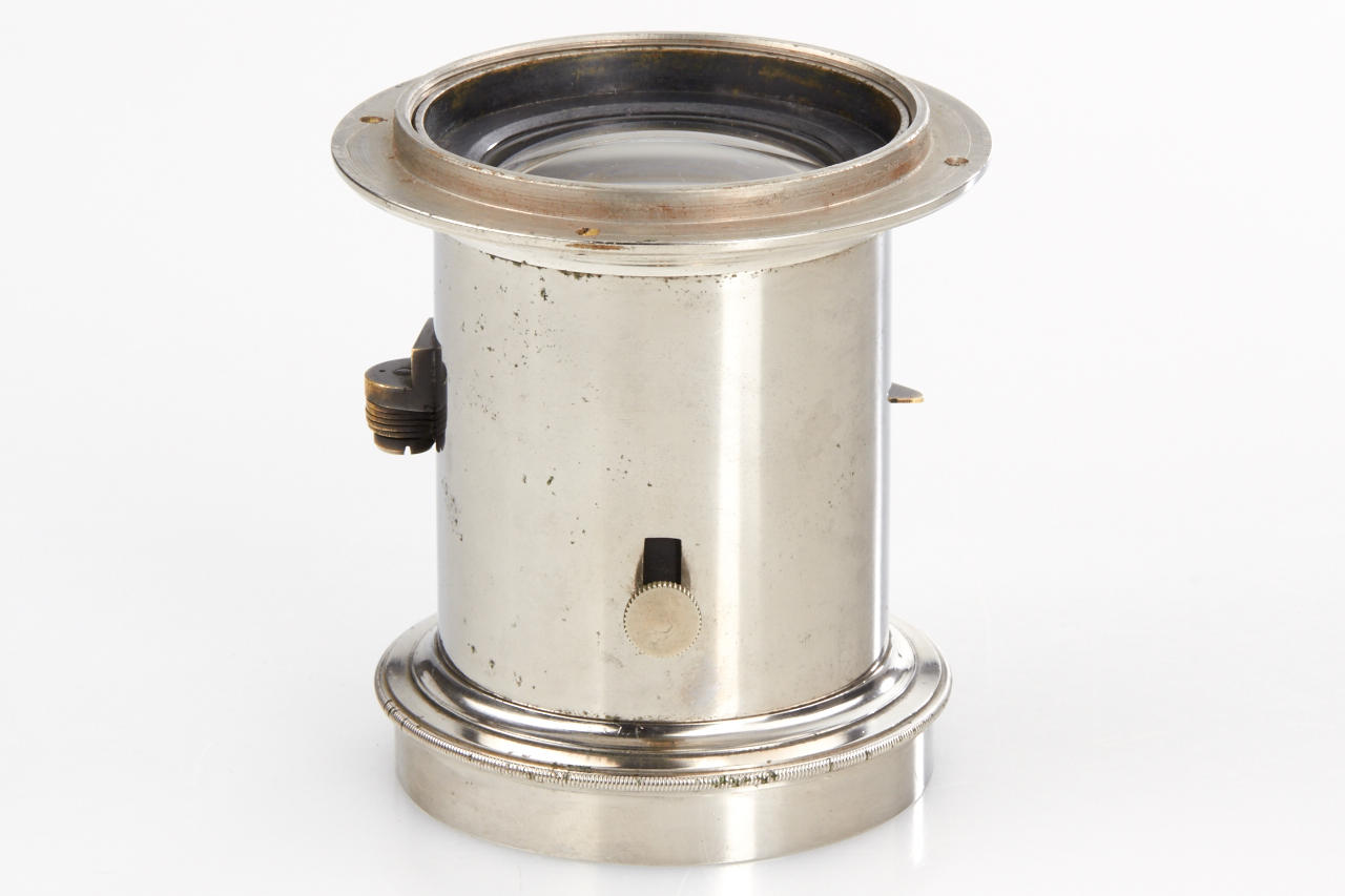 two chromed brass lenses with 5 coherent diaphragms, approx. 30cm focal length, engraved 'Apl No.6', serial '21692 and 19895' with mounting ring, total height 8cm, glass diameter front and rear c.4cm