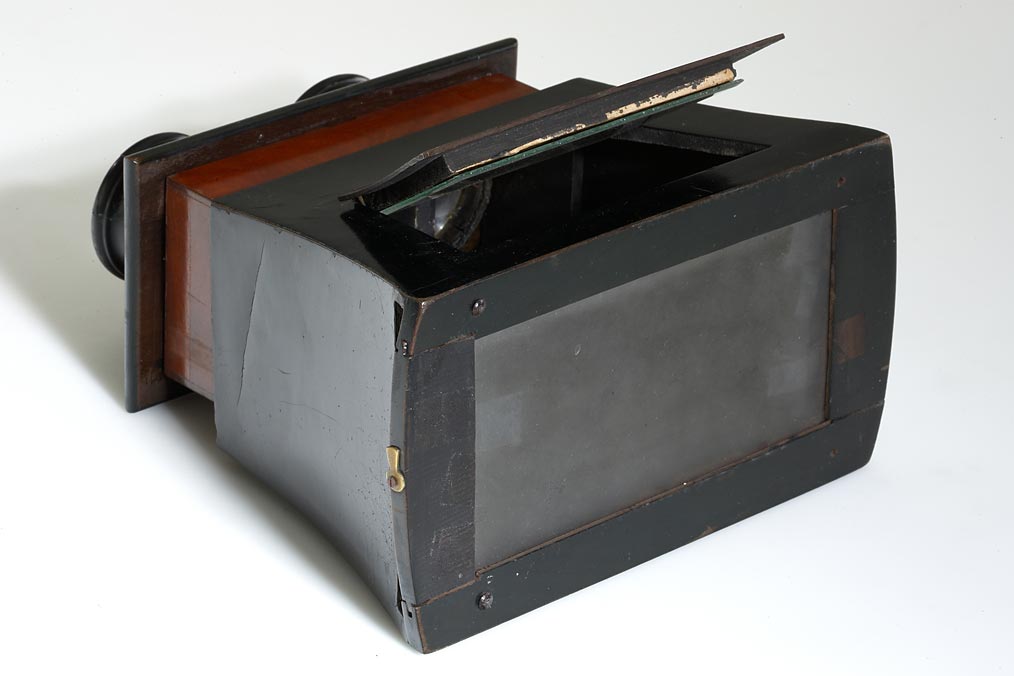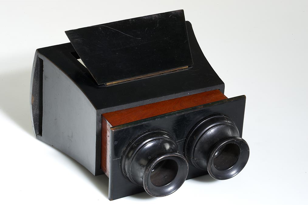 medium sized and large version of the Brewster type stereoscopes produced by the well known Parisian optician Hermagis, both with black lacquer finish, rack and pinion focus operated with a hand wheel and the brass makers label mounted on one side, both viewers viewer shows signs of wearing, the wooden eye pieces have cracks caused by tension, the rack and pinion focussing is working, but the mechanism is somehow weak. Even if their condition is not perfect, this rare Hermagis stereoscopes are still highly collectable and interesting viewers. (2)