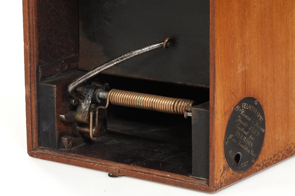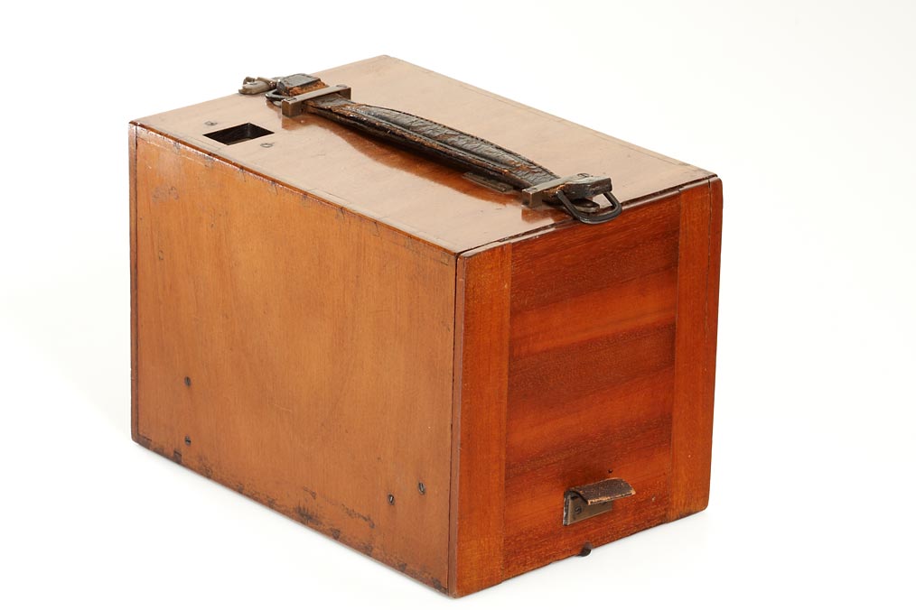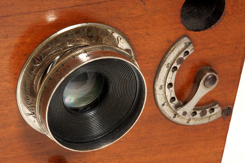 detective-style drop plate magazine camera for 9x12cm plates, polished wood body, nickel Hermagis Aplanastigmat No.8 140mm lens no.34383, in good condition with leather strap