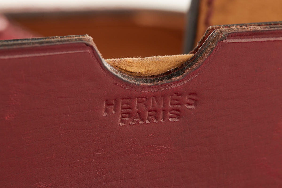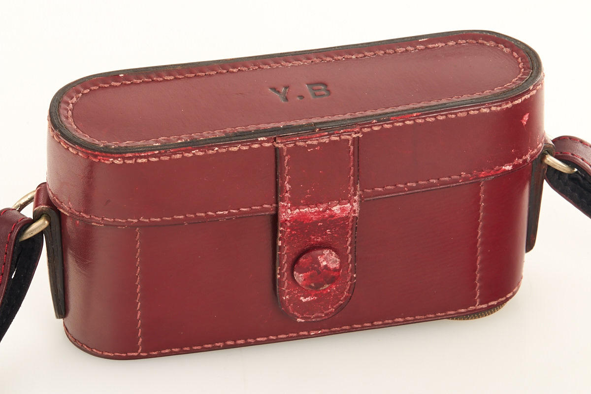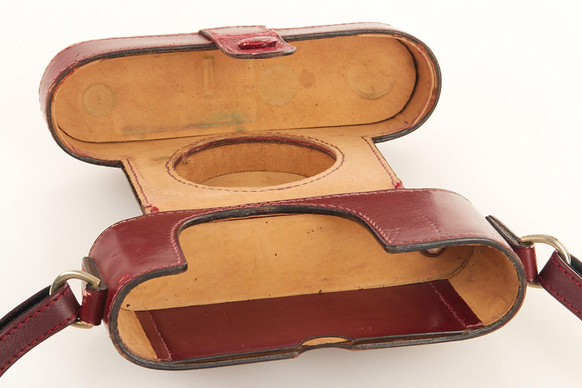extremely rare and fully original red leather everready case for Leica IIIa, IIIb made by special order by Hermes, France. Top stamped 'J.P', rear stamped 'Hermes', with strap