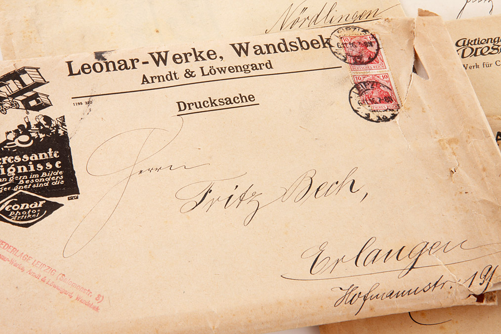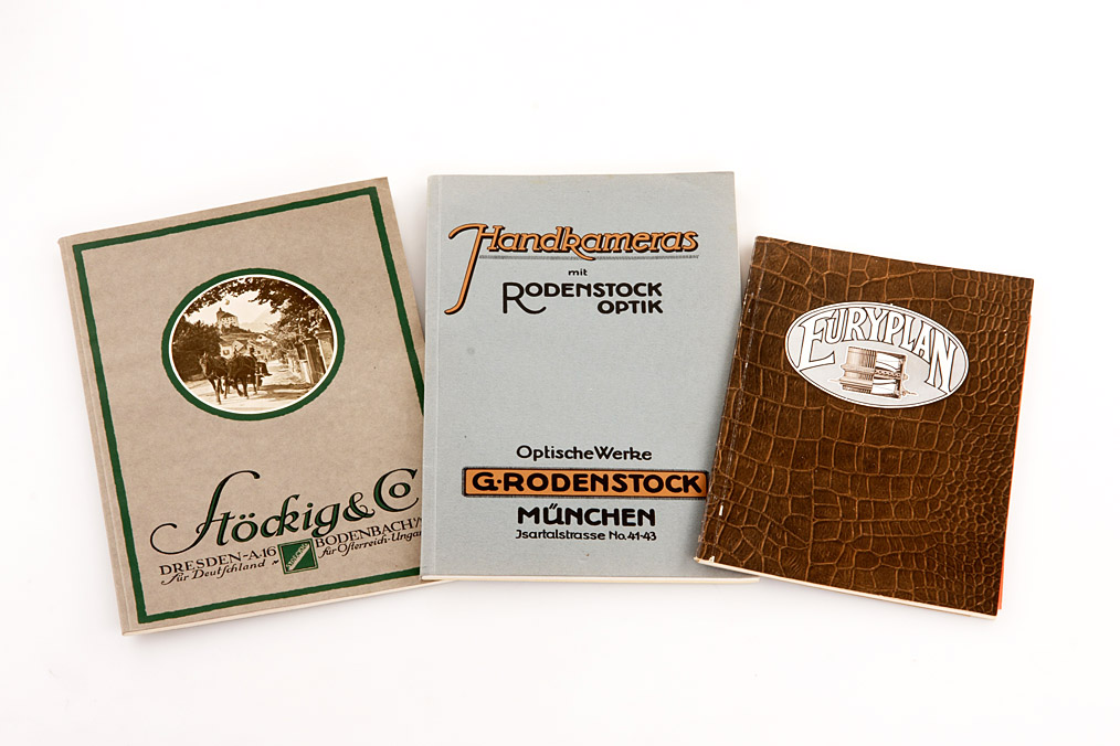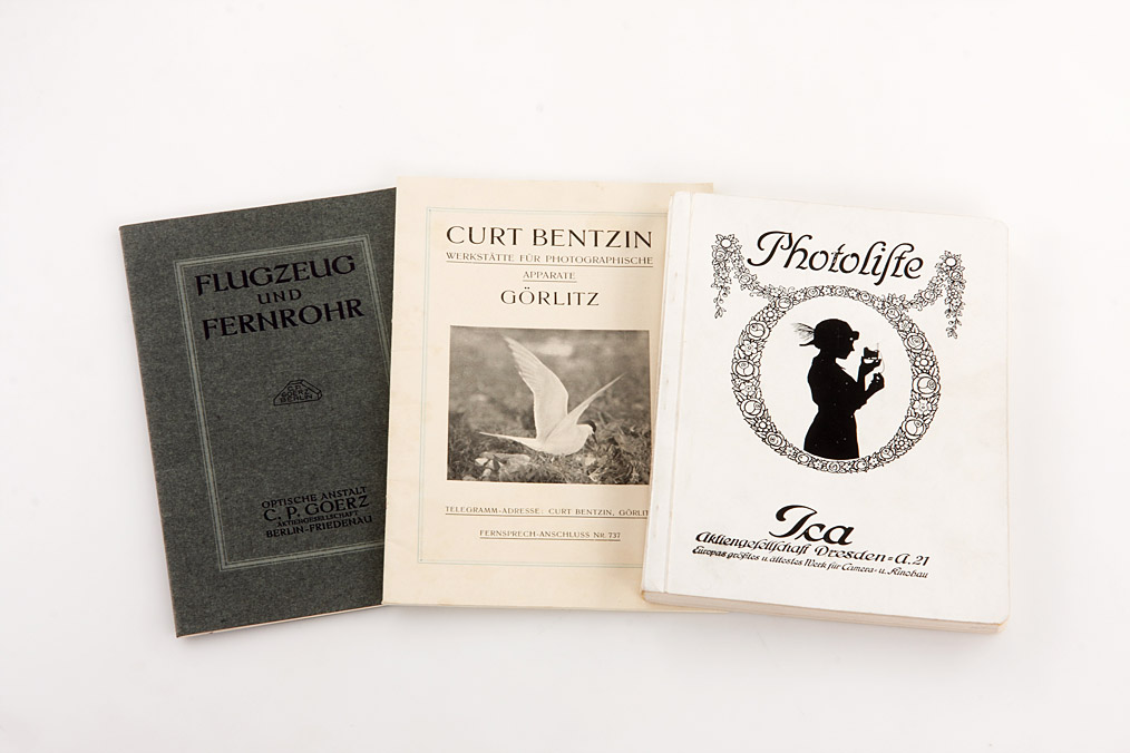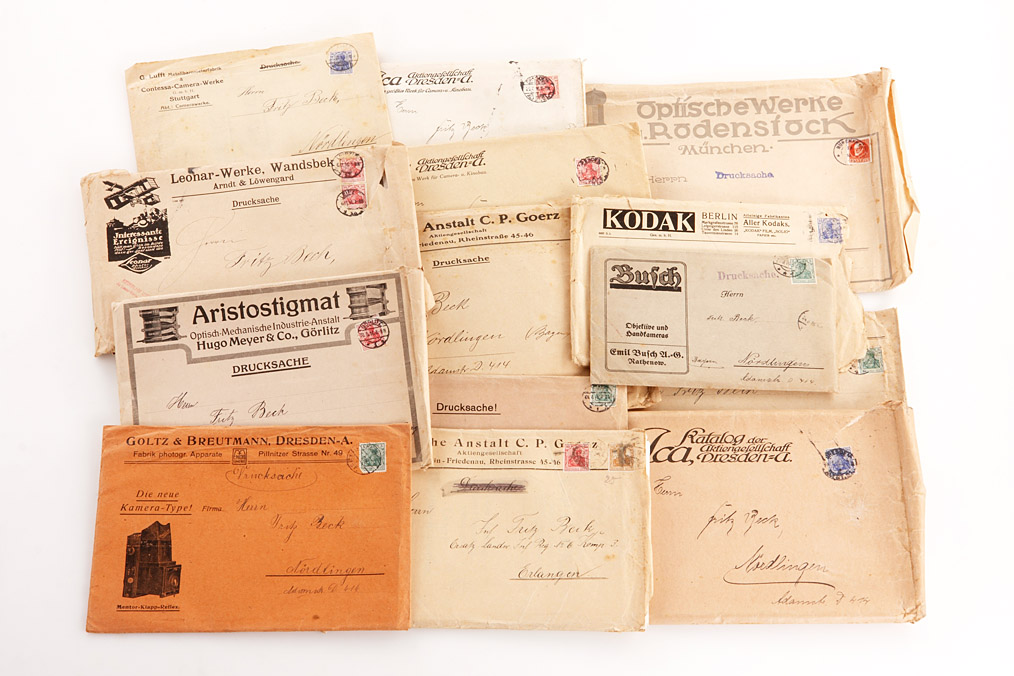 extremely interesting and rare collection of historical camera catalogues and literature in their original mailing envelopes, all dating from 1916/17 and addressed to the same person, a Mr. Fritz Beck of Nördlingen in Bavaria (Germany). The catalogues cover almost the complete range of German camera producers of this time including Curt Bentzin, Busch, Contessa Ernemann , Euryplan, C.P. Goerz, Goltz & Breutmann (Mentor), Ica, Kodak, Leonar Werke, Neue Photographische Gesellschaft, Rodenstock and Carl Zeiss. Among the aprox. 25 catalogues and folders for cameras and lenses, there are eight Goerz advertising leaflets for aeronautic instruments. All the printings are in near mint condition, some letters with additional correspondence on the companies stationary.